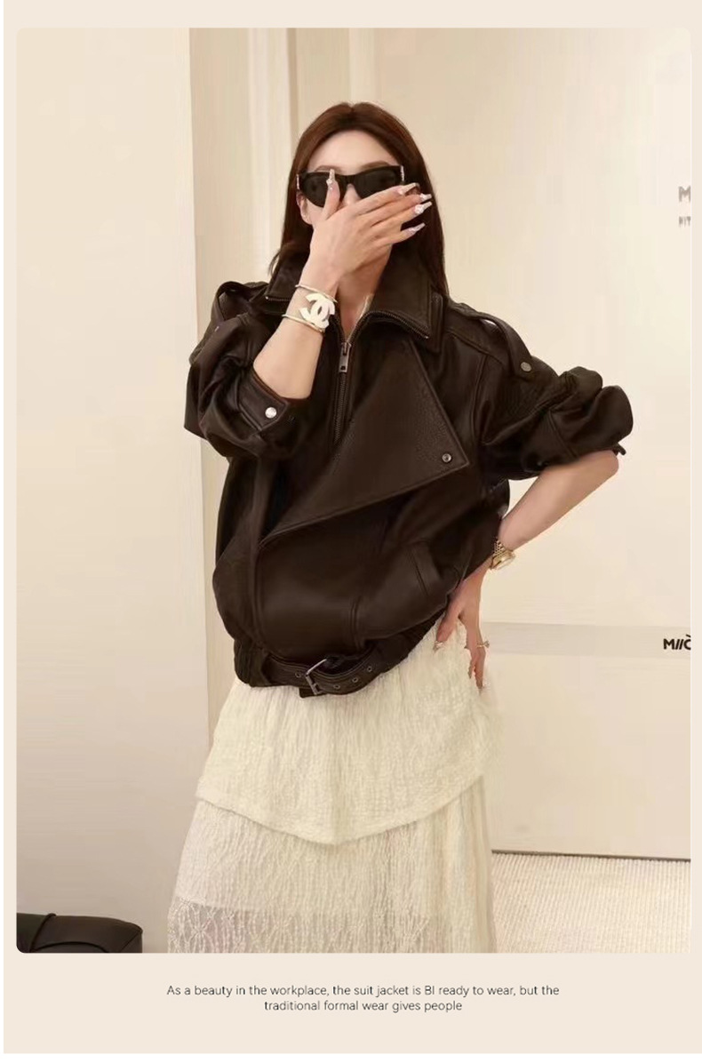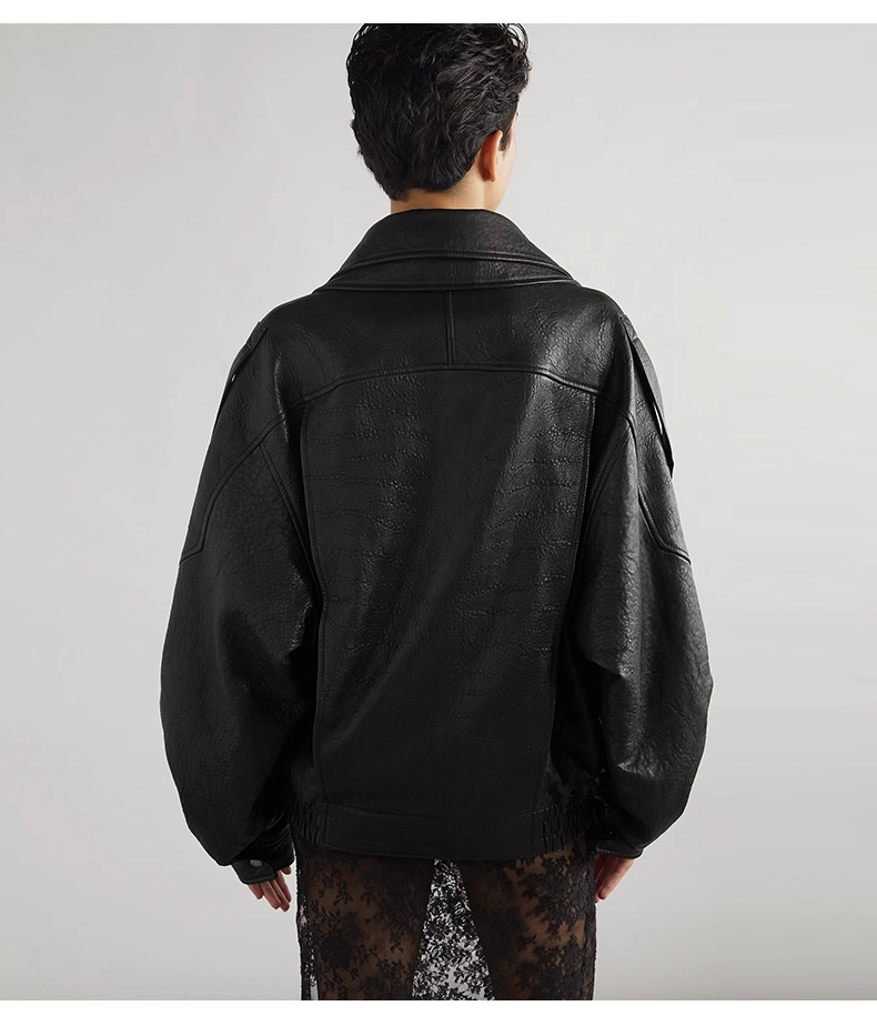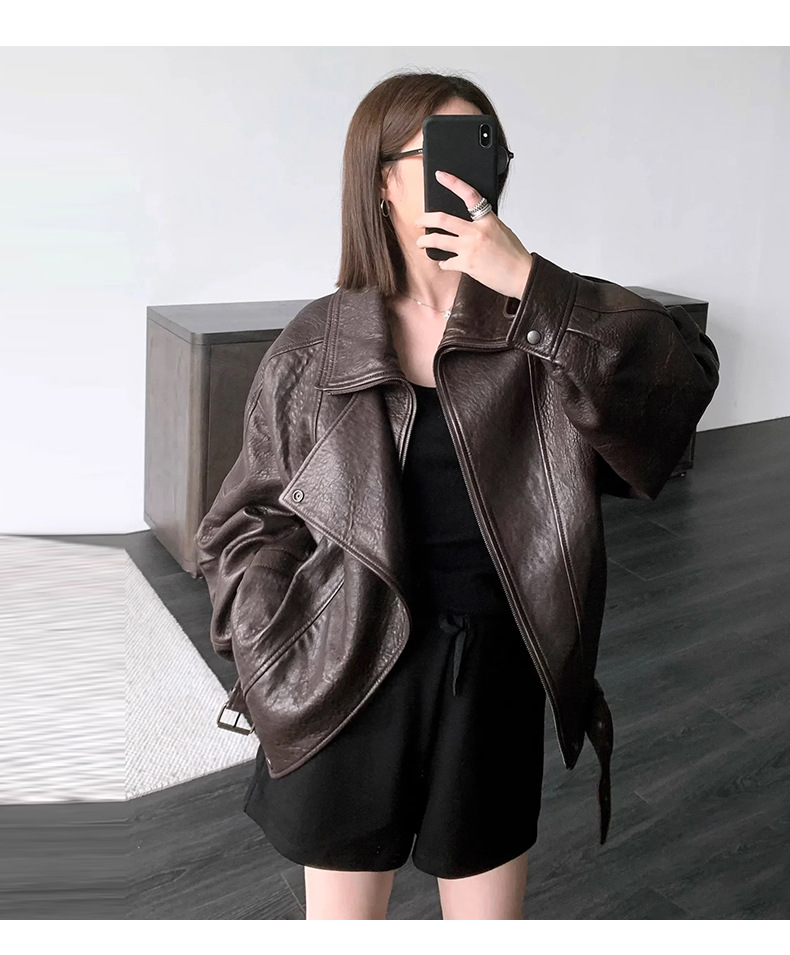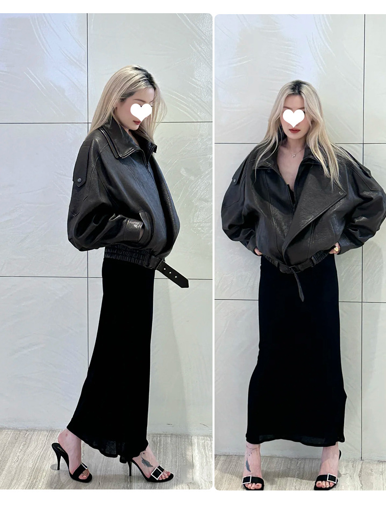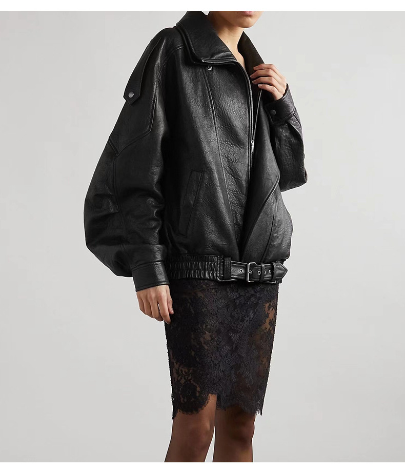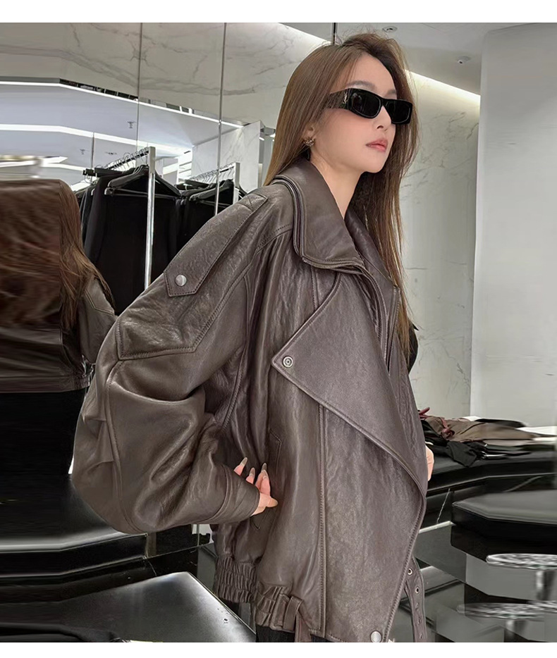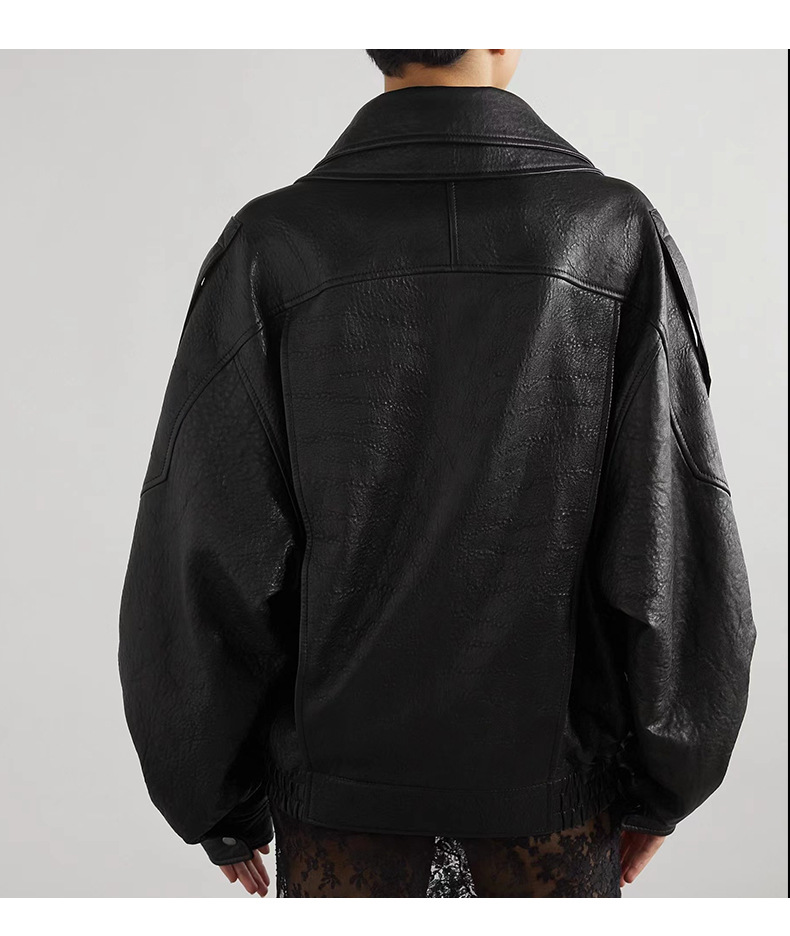 양 슐린 가을과 겨울 쇼 수입 버블 패턴 정품 가죽 여성 더블 칼라 짧은 오토바이 프로필 재킷 루즈 코트