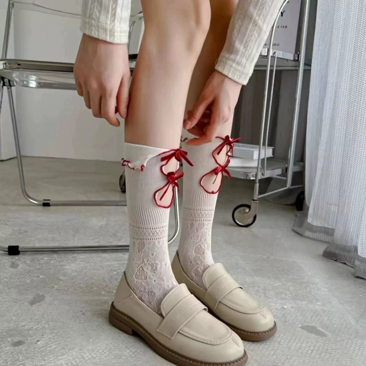 여성용 봄과 가을 얇은 Ins 화이트 미디엄 양말 스위트 할로우 더블 레이스 레이스 보우 Jk 송아지 양말스토어 가기