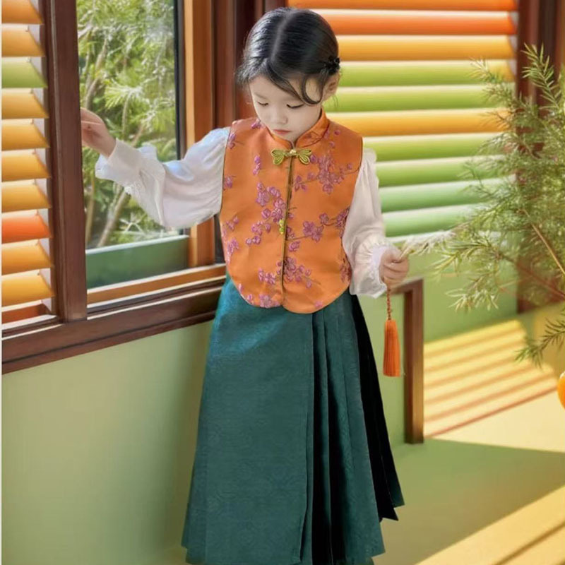 봄 2025 새로운 소녀 새로운 중국 새틴 자카드 말 스커트 어린이 국가 스타일 조끼 3 피스 세트스토어 가기