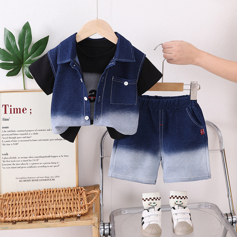 소년 반팔 셔츠 세트 2025 새 옷깃 아기 여름 잘 생긴 옷 어린이 그라디언트 데님 3 피스 세트스토어 가기