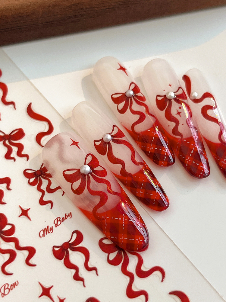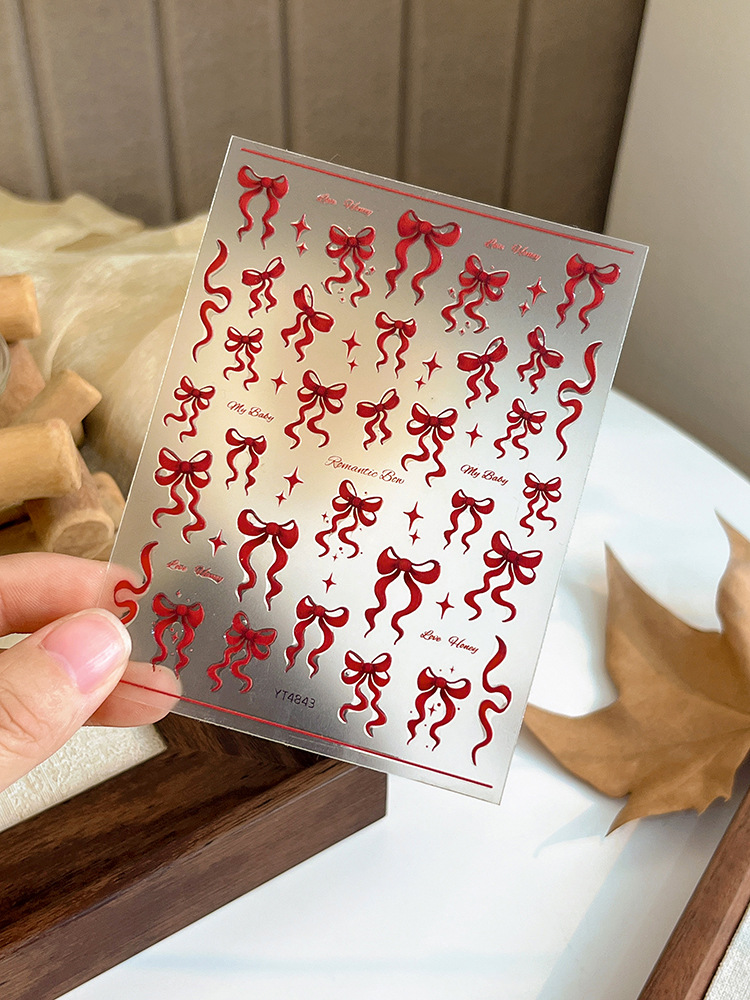 YITU 개미 그림 릴리프 레드 보우 네일 아트 스티커 리본 4 망 스타 벨트 접착 네일 장식 스티커 YT4843