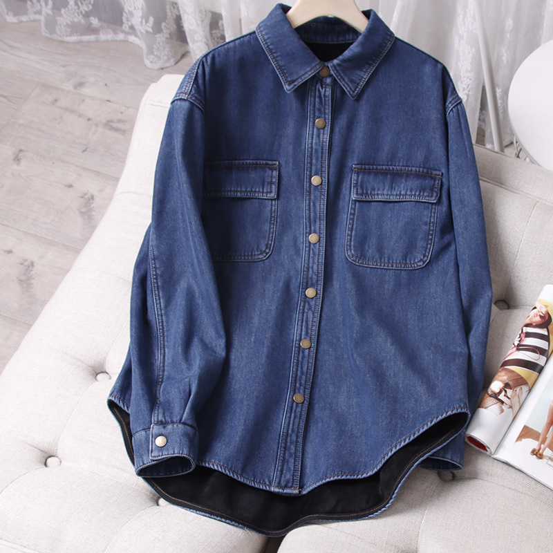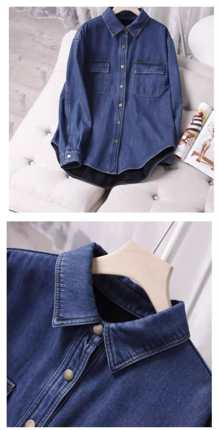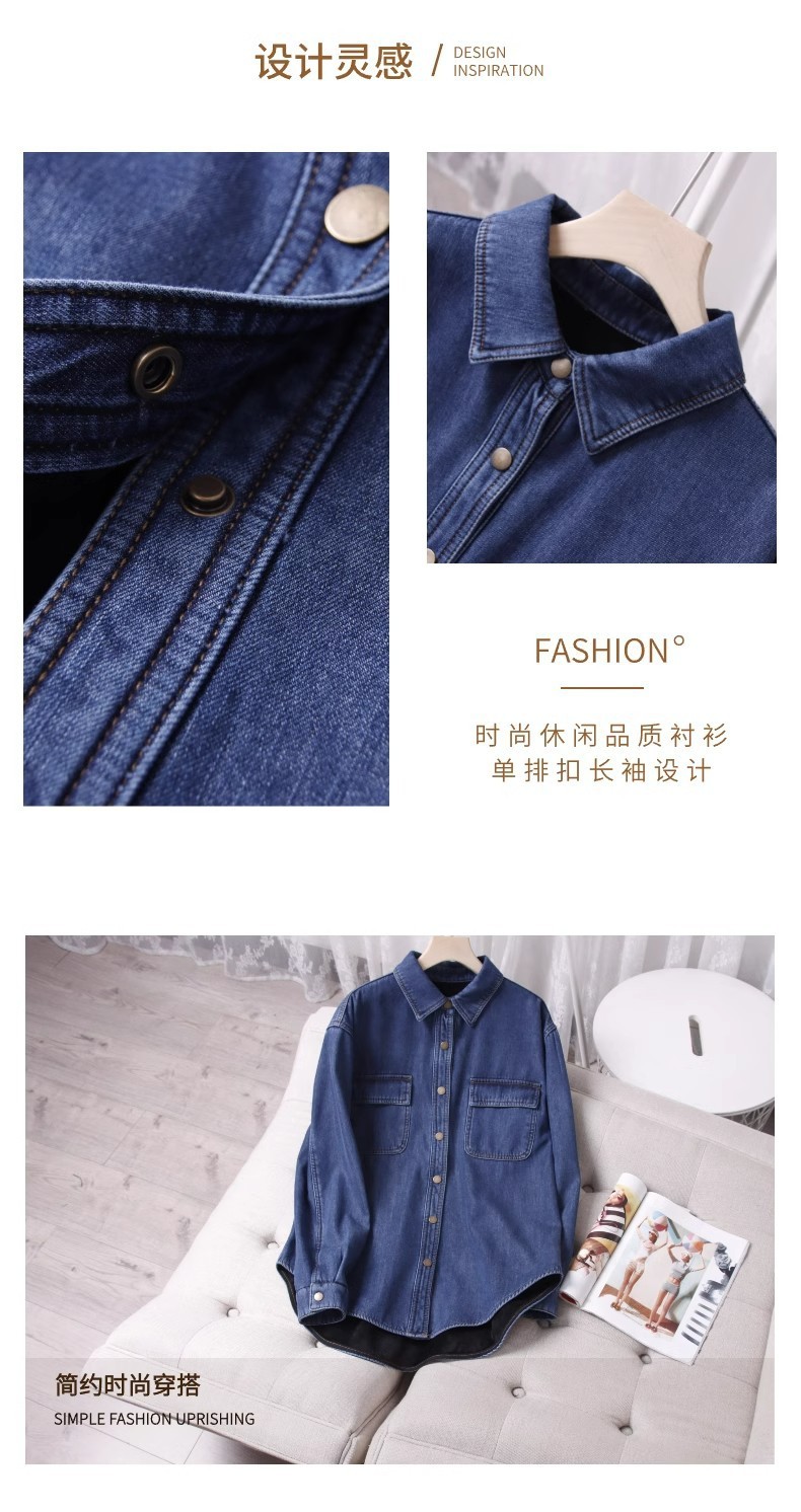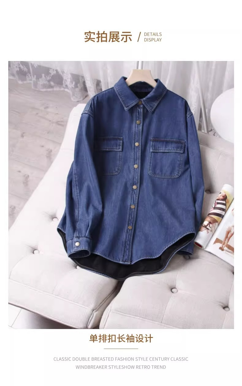 2025 가을 겨울 패션 캐주얼 기모 두꺼운 데님 셔츠 여성 올매치 슬리밍 원피스 벨벳 따뜻한 데님 셔츠스토어 가기