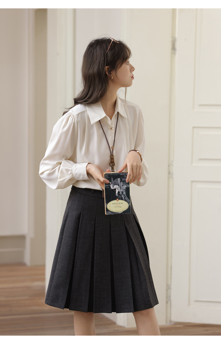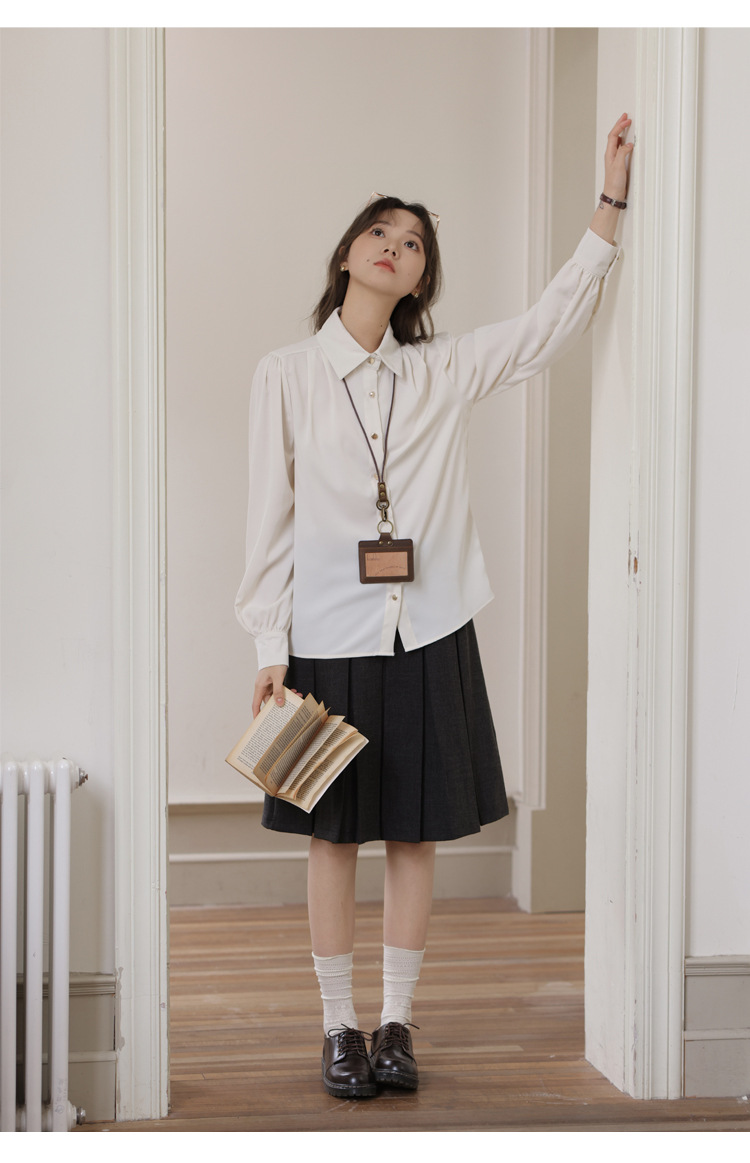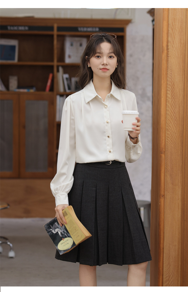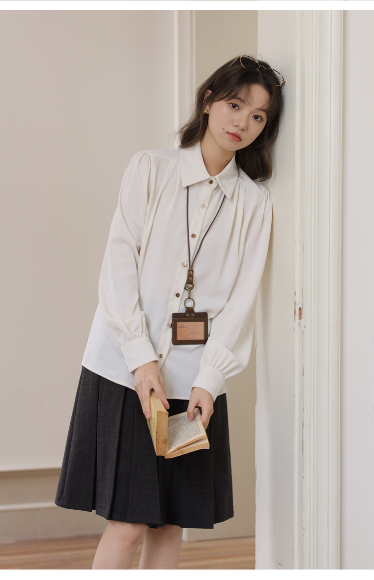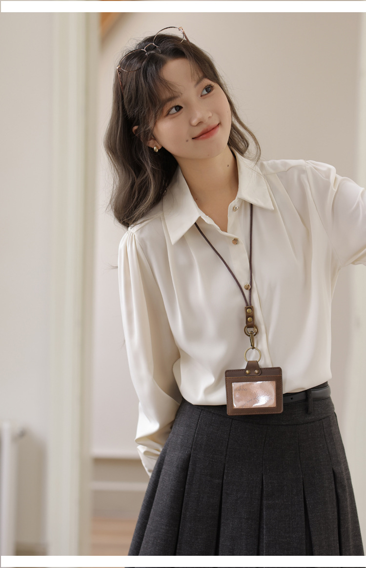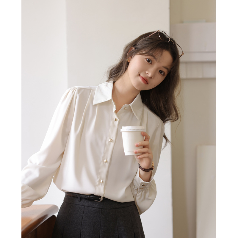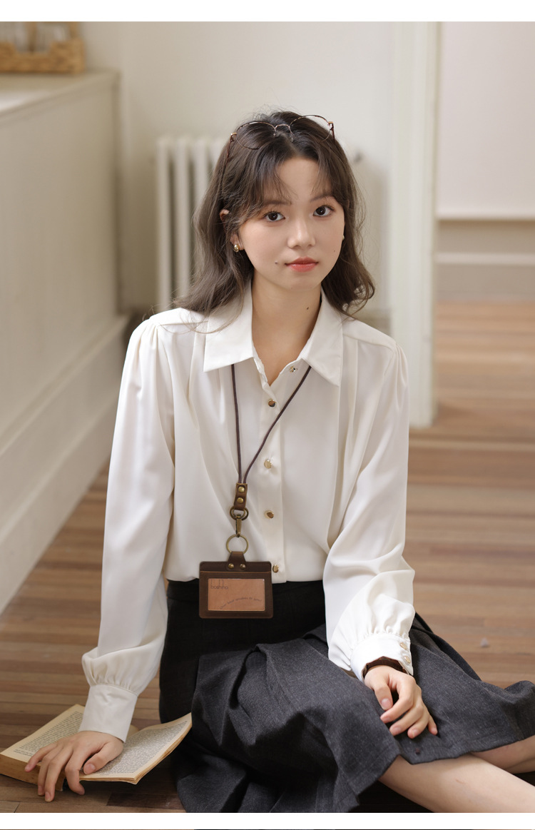 봄 2025 새로운 통근 살구색 화이트 디자인 센스 직장 인터뷰 긴 소매 옷깃 내부 우아한 셔츠스토어 가기