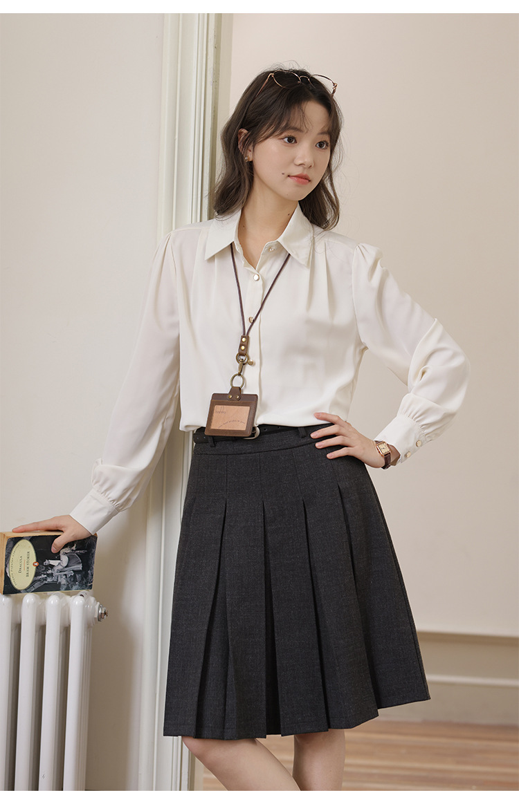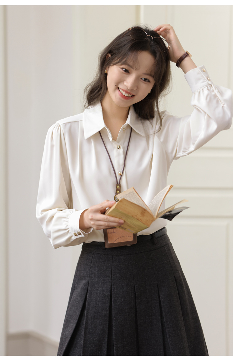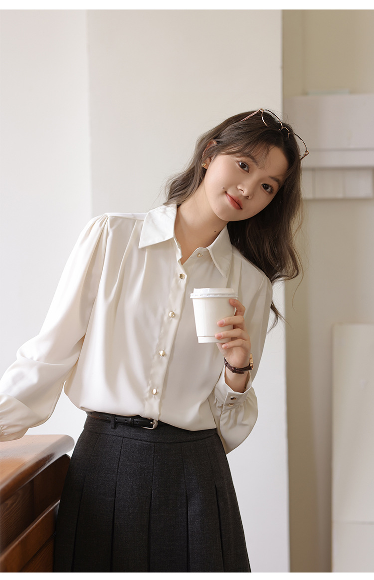 봄 2025 새로운 통근 살구색 화이트 디자인 센스 직장 인터뷰 긴 소매 옷깃 내부 우아한 셔츠