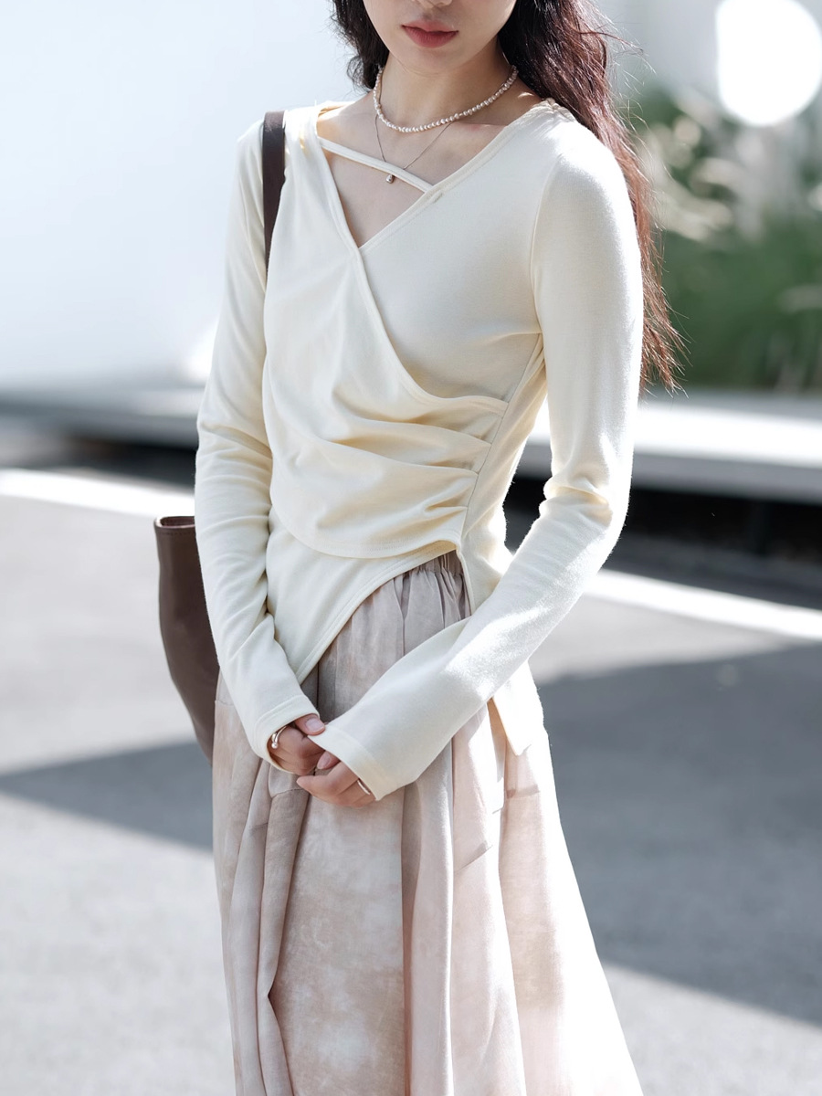 디자인 센스 크로스 V 넥 긴팔 티셔츠 여성의 가을 분할 슬리밍 불규칙한 살구색 부드러운 타이트 탑