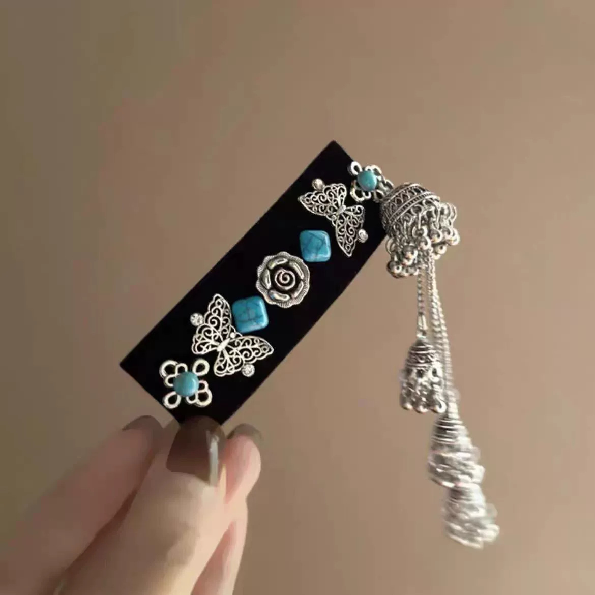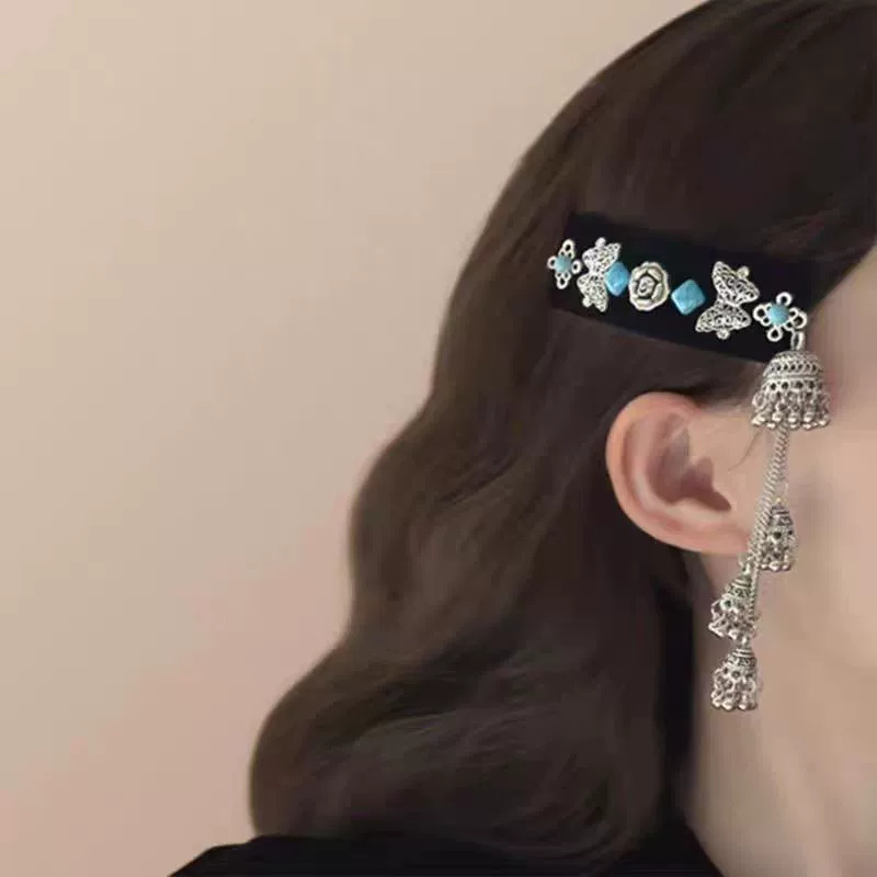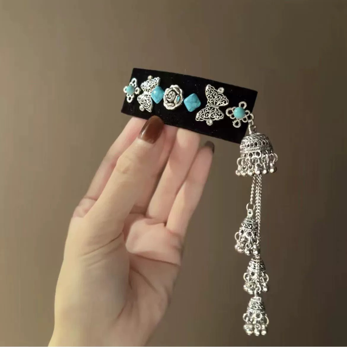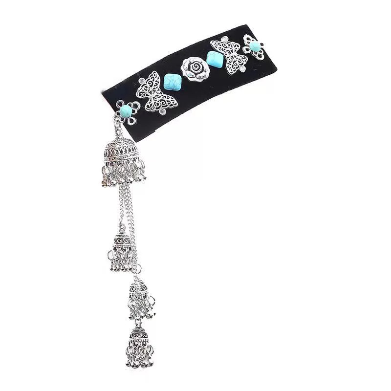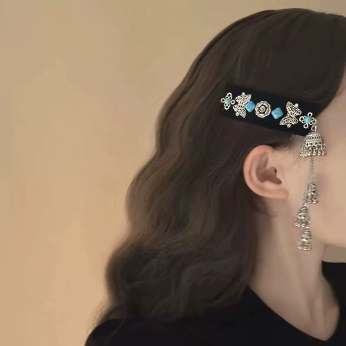 민족 스타일 몽골 벨 술 헤어 액세서리 여성 티베트어 레트로 블루 청록색 나비 뱅 클립 여행 헤어 액세서리