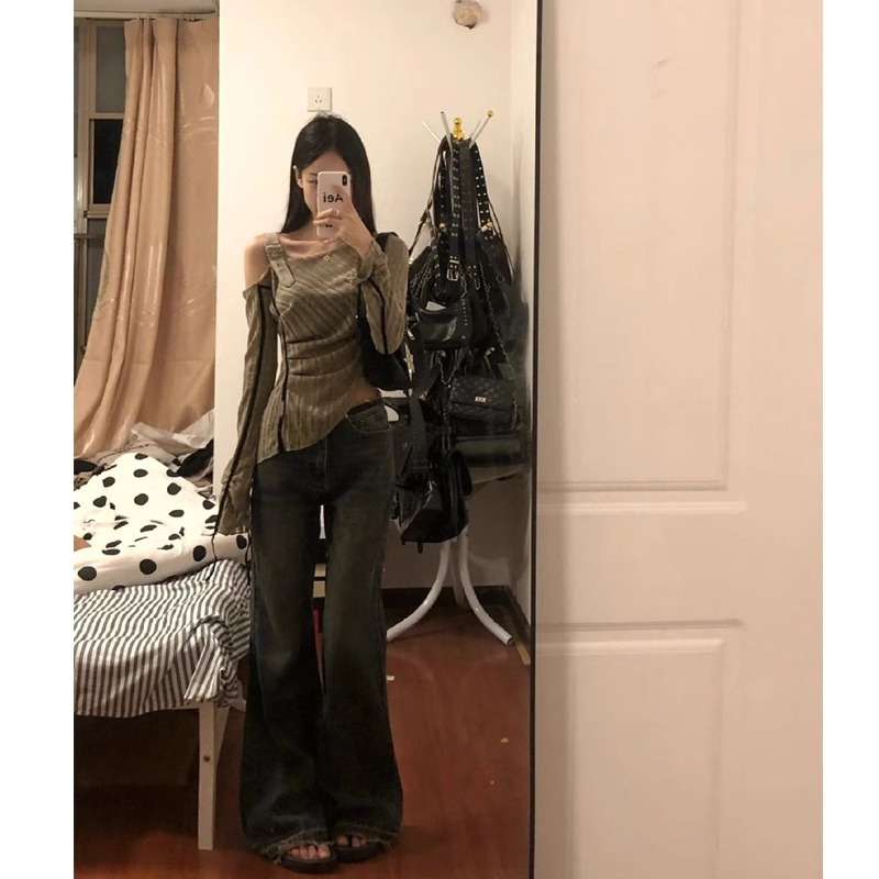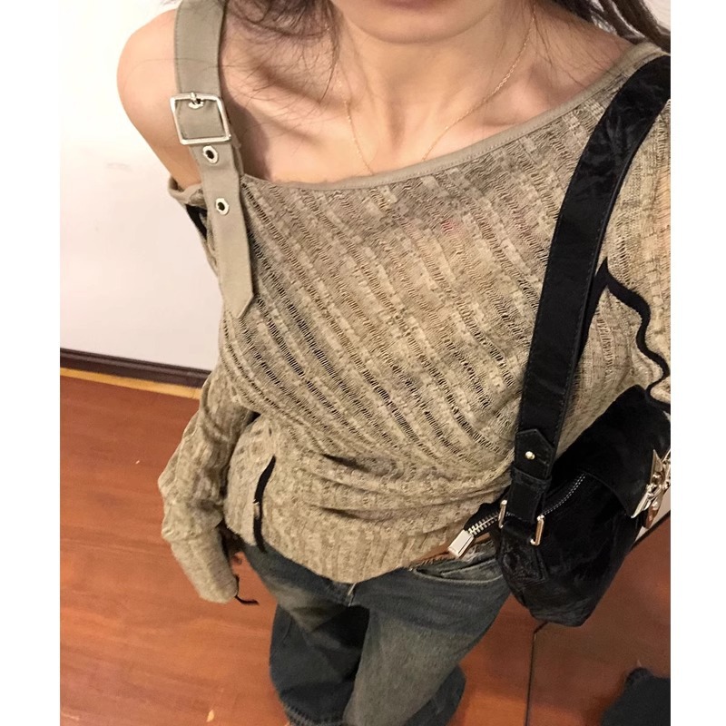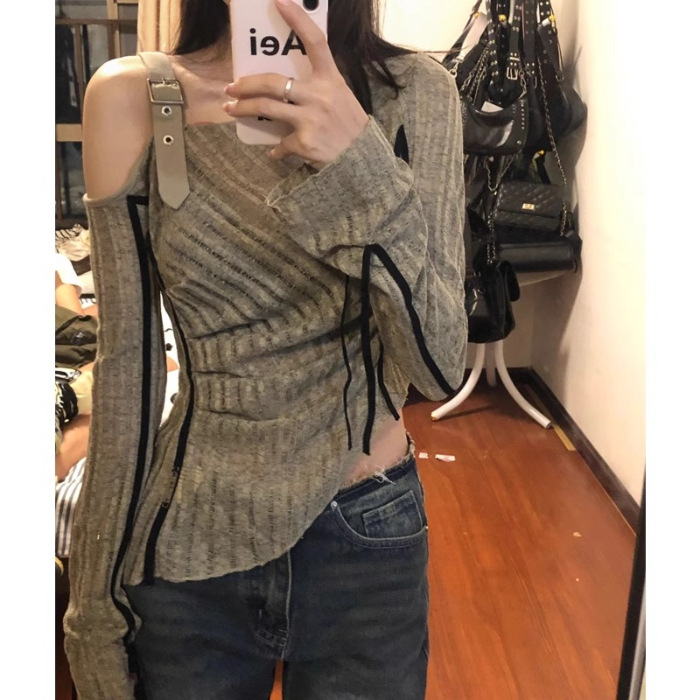 벨트 스티칭 봄과 가을 디자인 센스 긴팔 니트웨어 여성용 불규칙한 슬림 한 어깨 슬림핏 스파이스 걸 탑스토어 가기