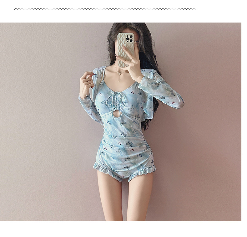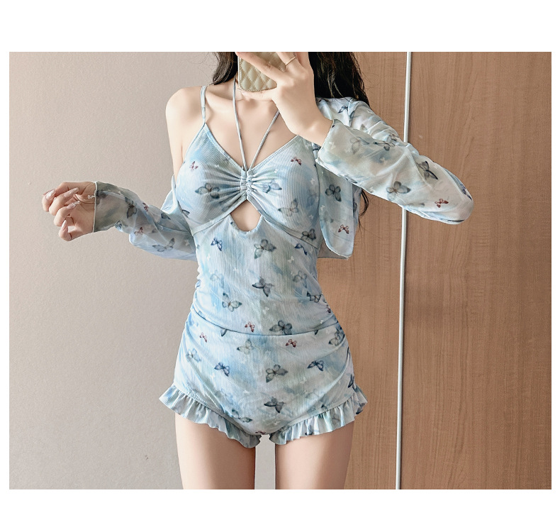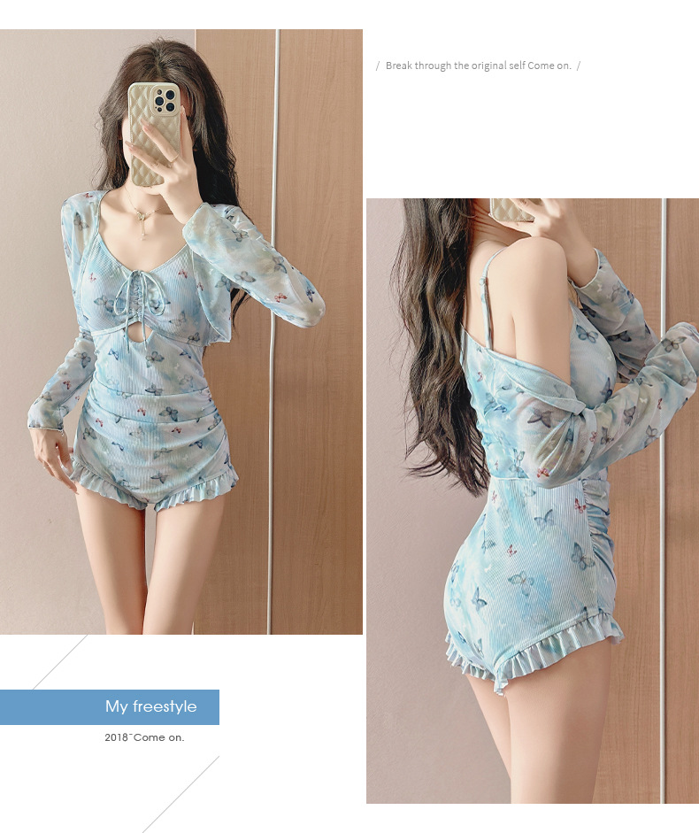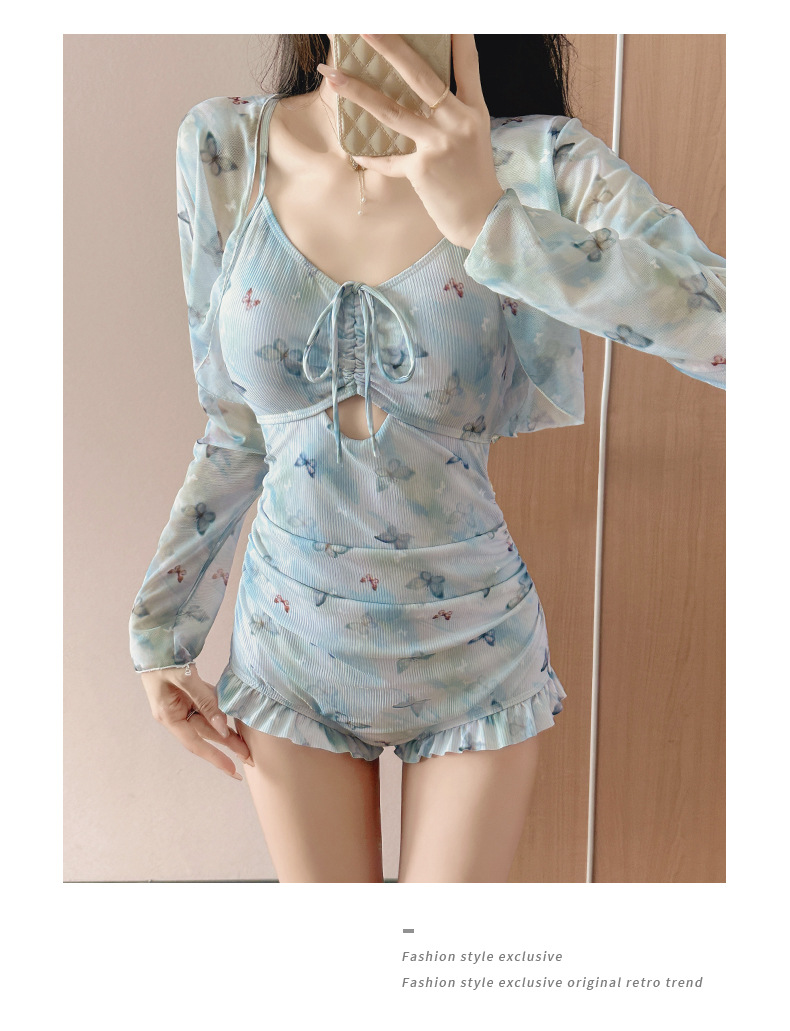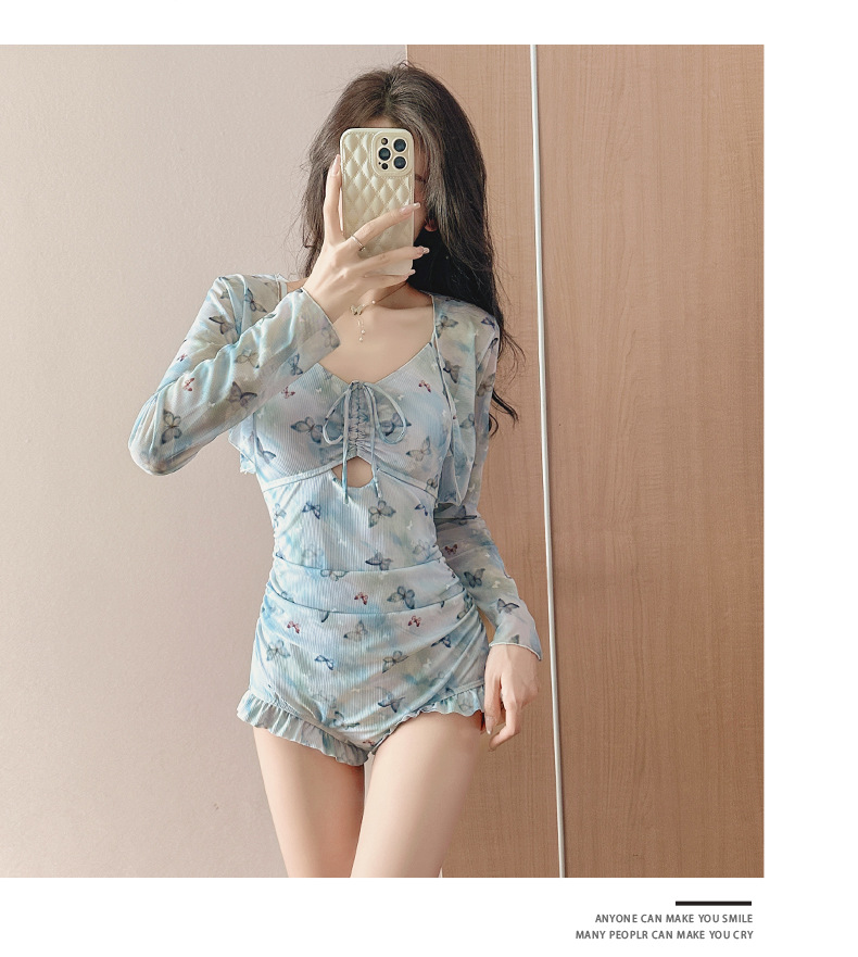 수영복 여성 원피스 투피스 세트 뜨거운 소녀 나비 인쇄 순수한 긴 소매 슬림 휴일 온천 수영복 도매