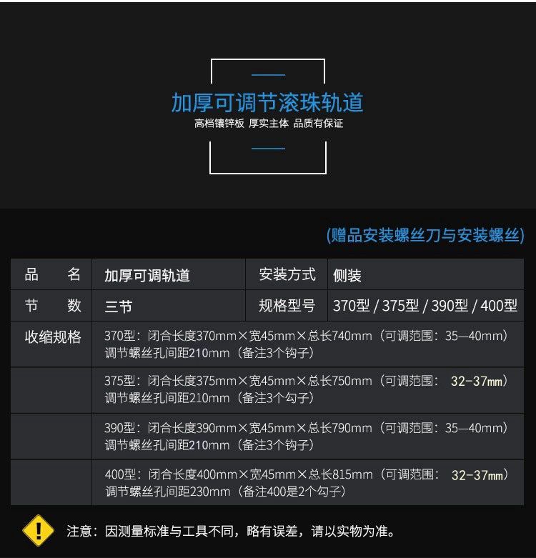 • 375 길이, 매우 두꺼운 조절 가능한 트랙 + 도어 패널에는 나사가 함께 제공됩니다(한 쌍에 2개)