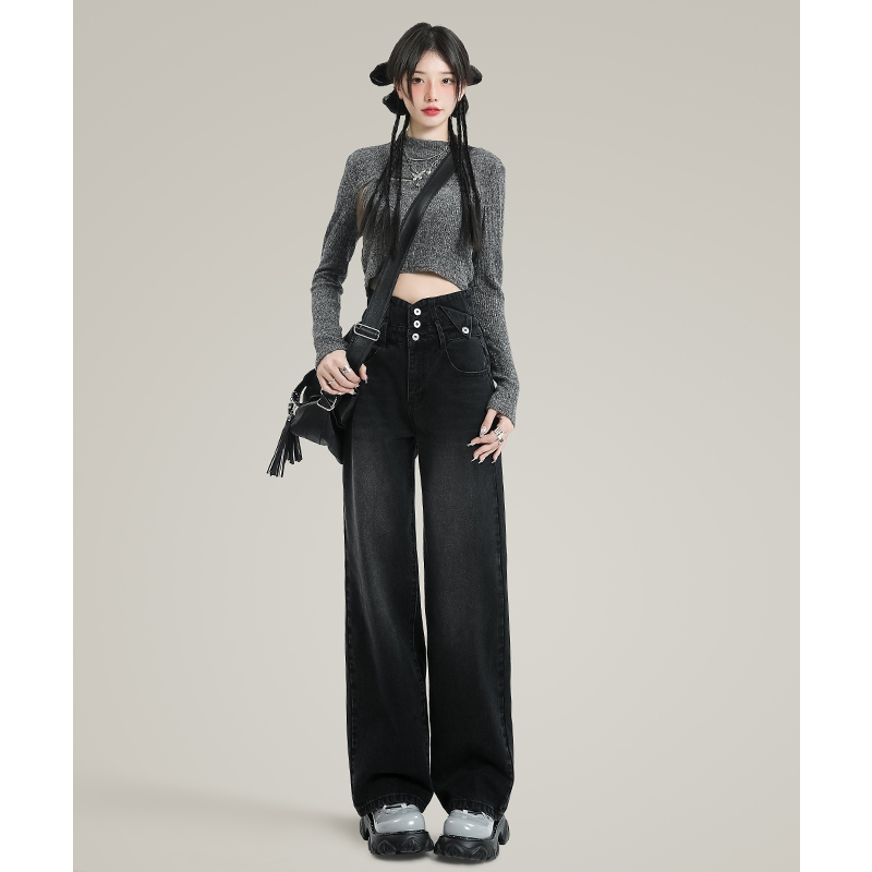 겨울 검은 허리 좁은 넓은 다리 청바지 여성용 벨리 커버 벨리 슬리밍 느슨한 스트레이트 디자인 감각스토어 가기