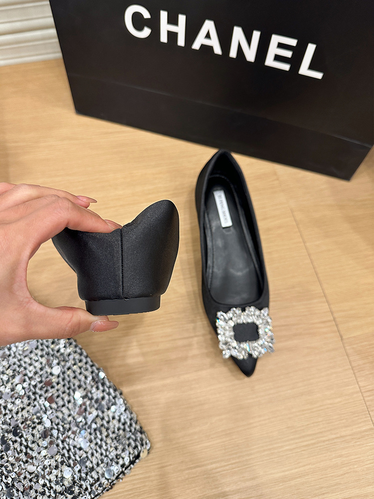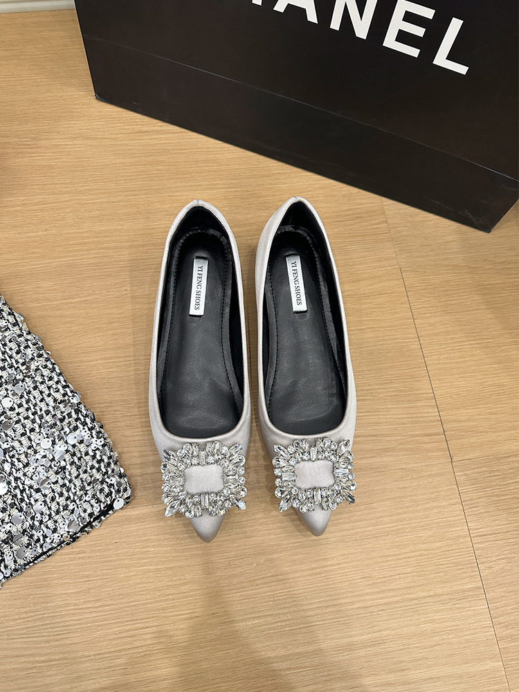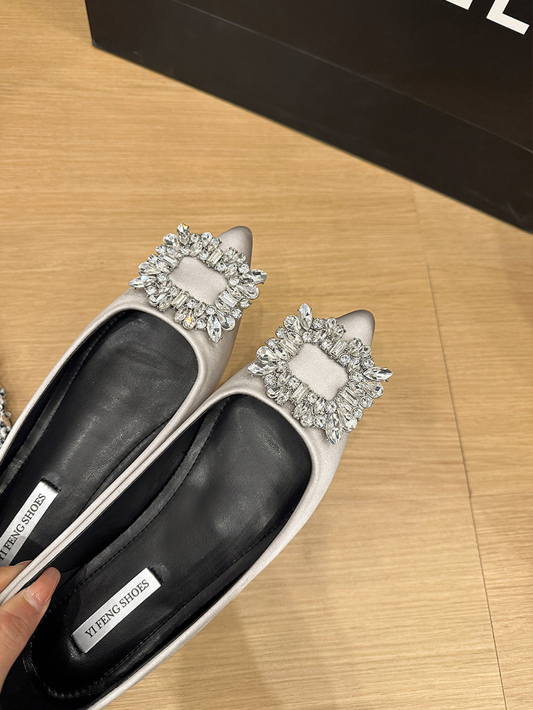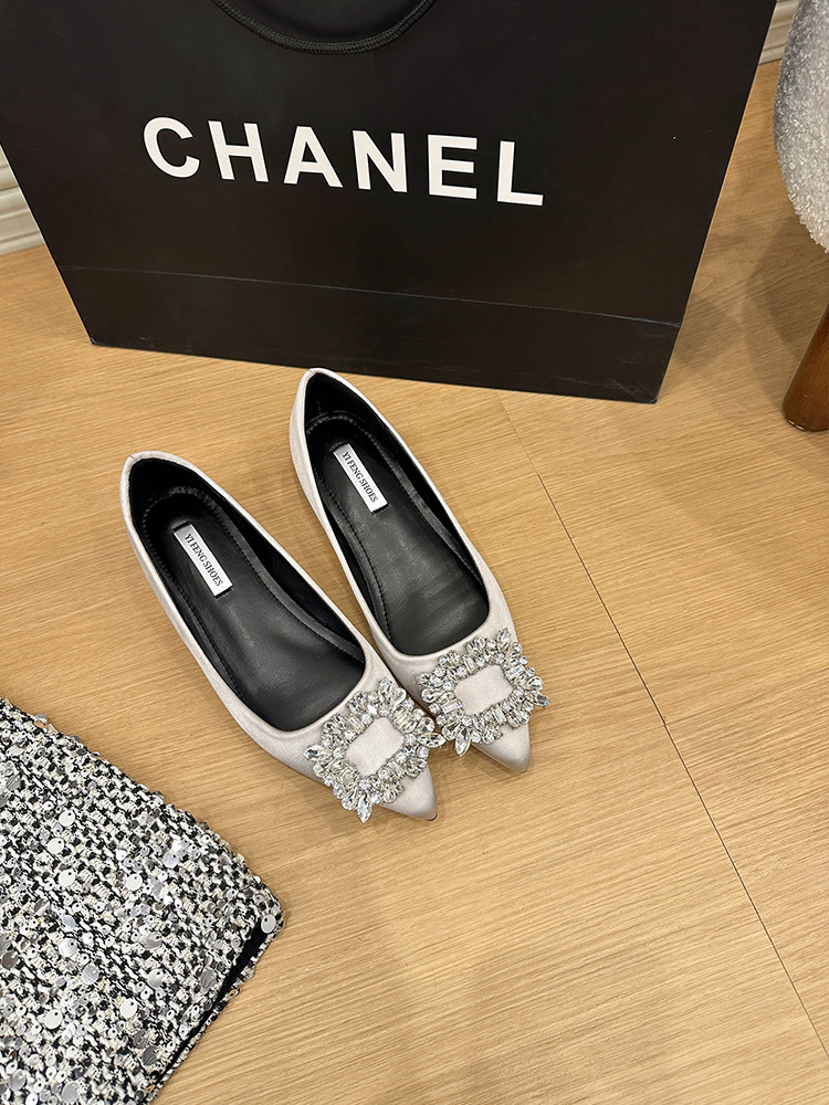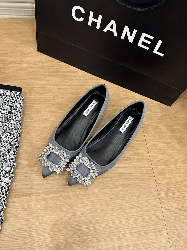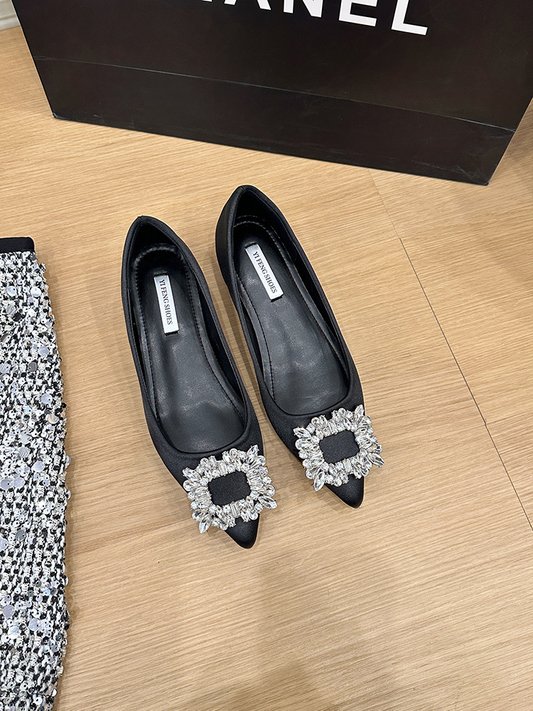 프랑스 뾰족한 발가락 통근 신발 여성의 2025 년 봄과 가을 새로운 도착 얕은 입 올 매치 라인스톤 스퀘어 버클 우아한 플랫 무당 신발스토어 가기
