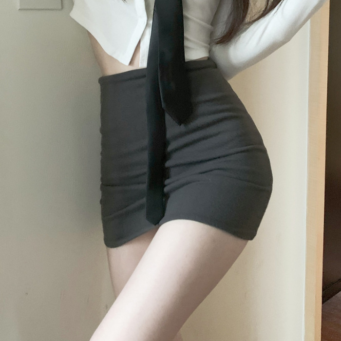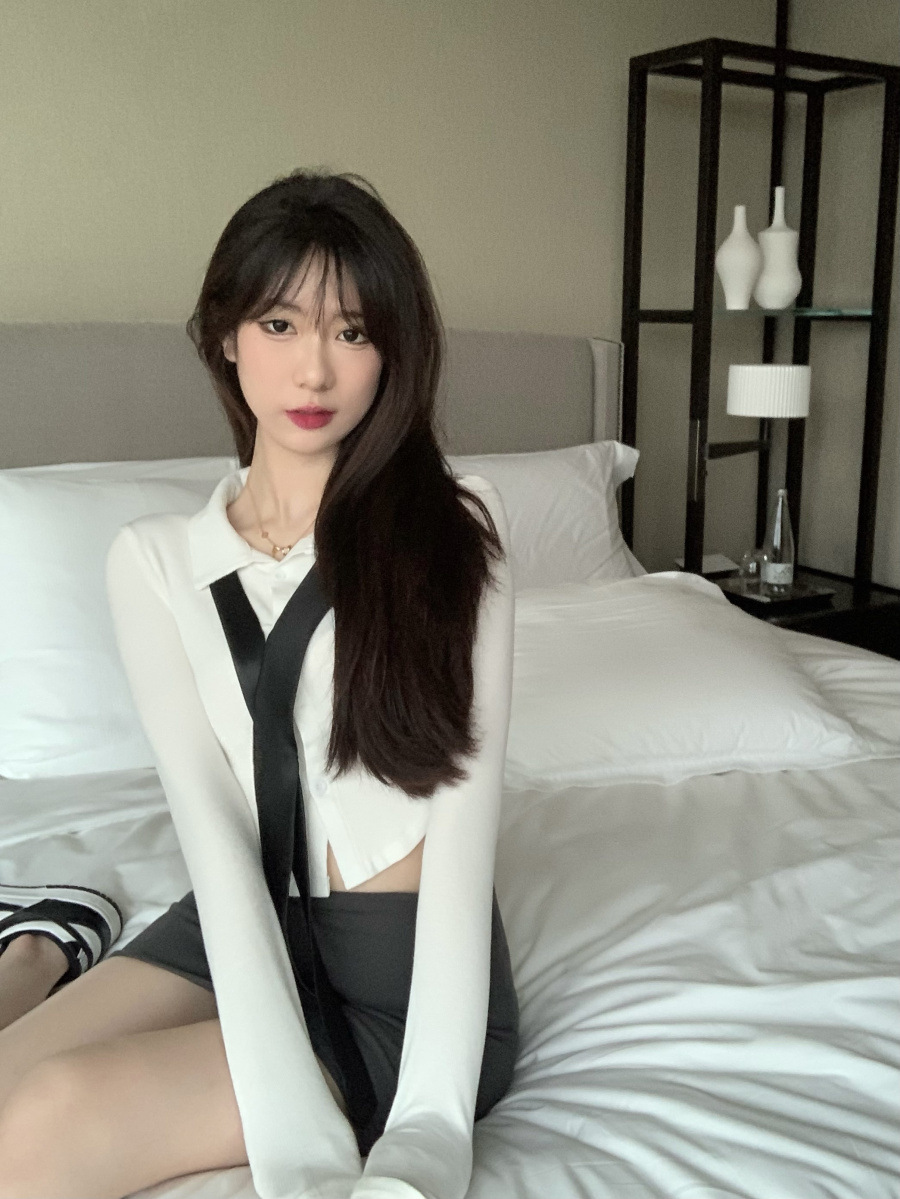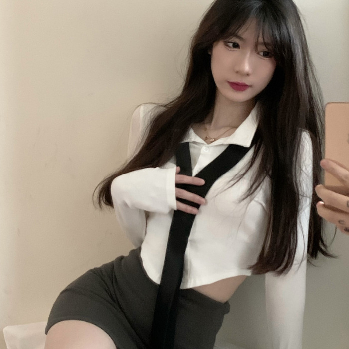 화이트 스파이스 소녀 타이트 타이 슬림 핏 긴팔 티셔츠 여성용 폴로 칼라 코트 짧은 퓨어 힙 스커트 세트