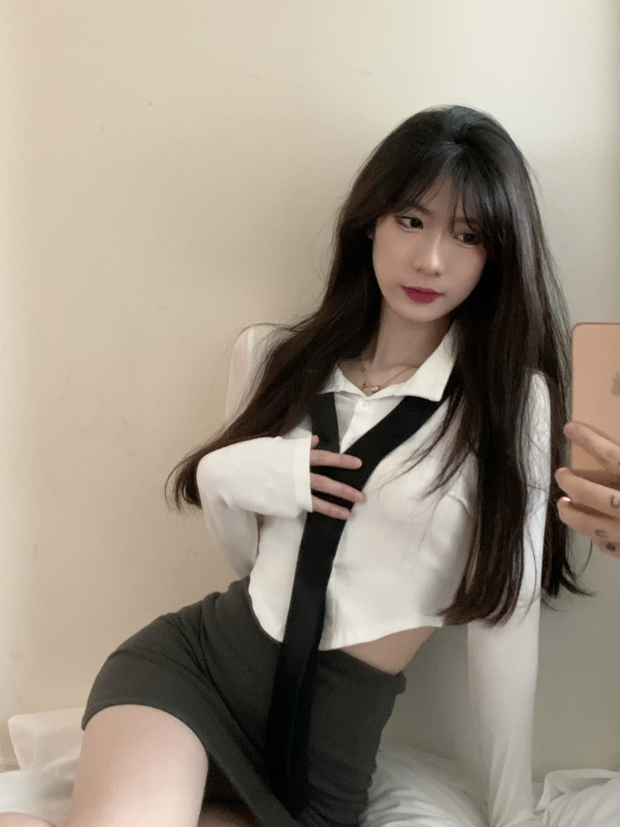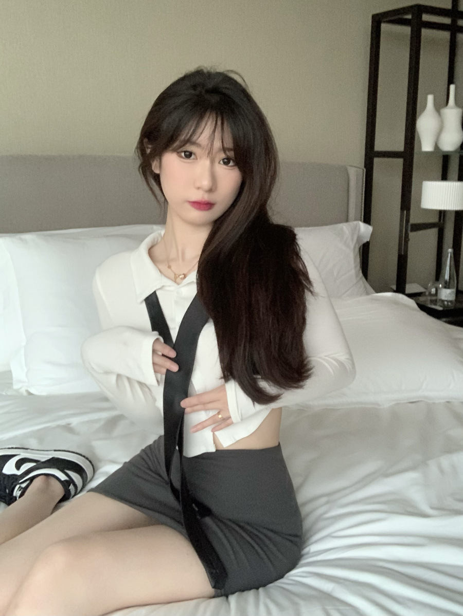 화이트 스파이스 소녀 타이트 타이 슬림 핏 긴팔 티셔츠 여성용 폴로 칼라 코트 짧은 퓨어 힙 스커트 세트스토어 가기