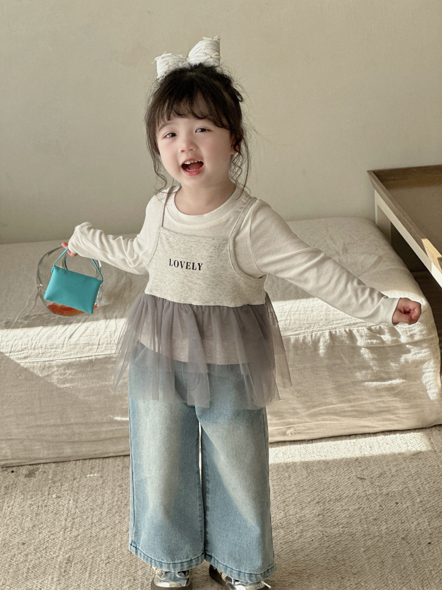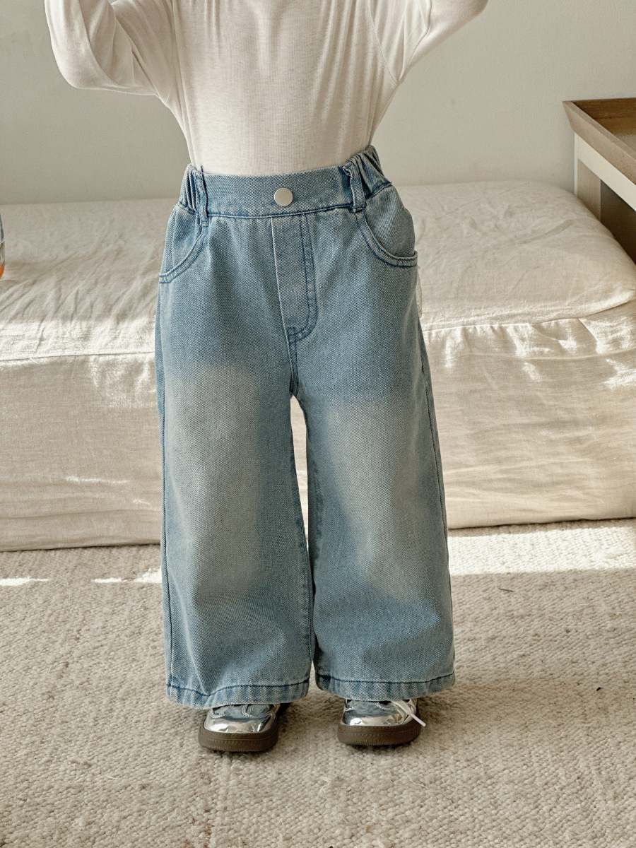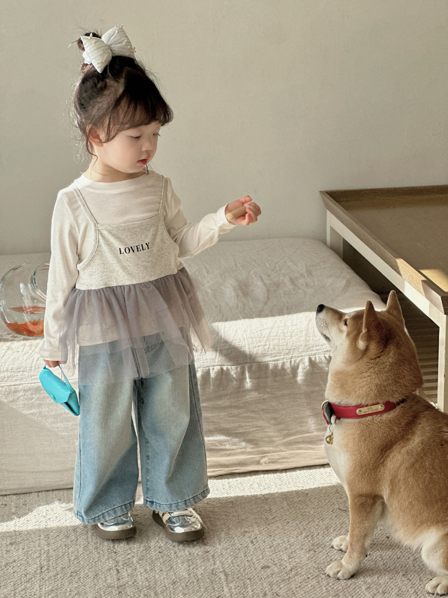여자 레이스 스트레이트 청바지 2021 봄 아동 의류 바지 아동 한국 스타일 와이드 레그 데님 바지스토어 가기