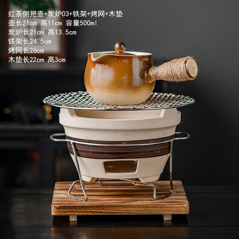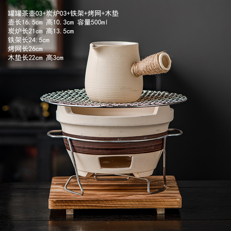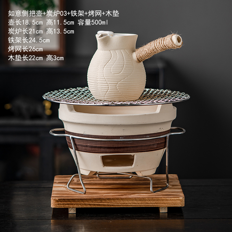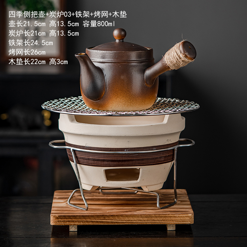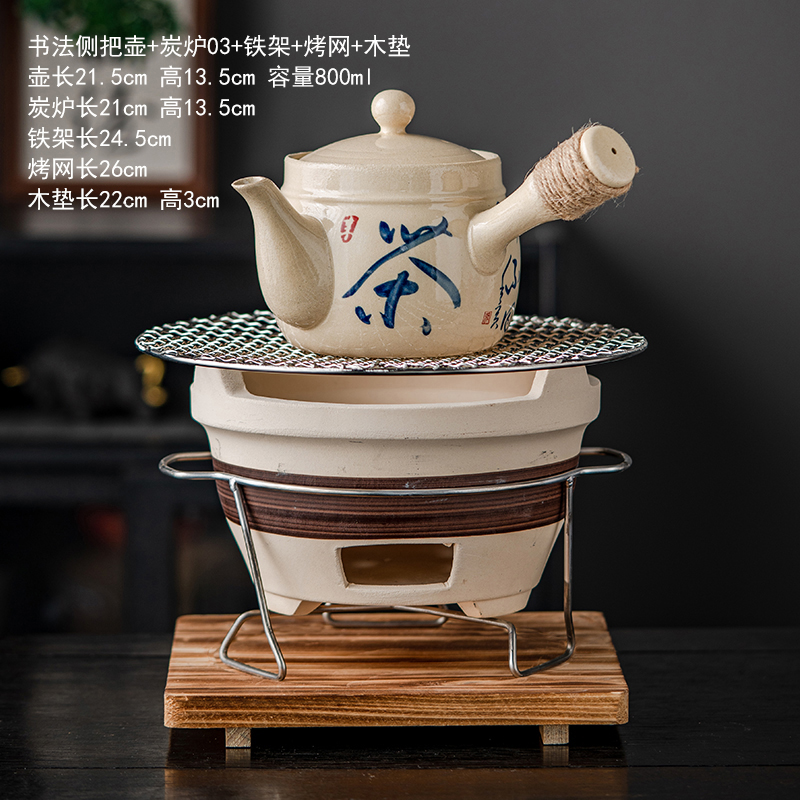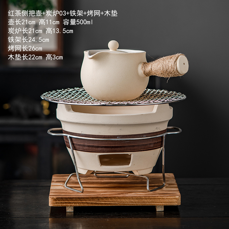 • 나무 매트 + 화이트 클레이 홍차 사이드 핸들 냄비가 있는 중형 숯불 난로