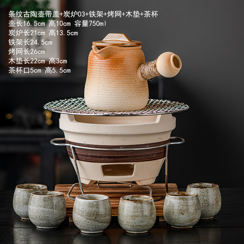 • 나무 매트가 있는 중형 숯불 난로 + 고대 도자기 가을 냄비 + 용알 컵 6개