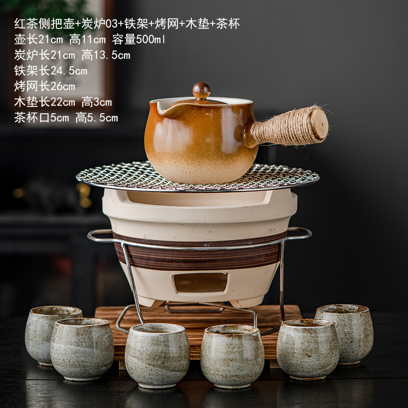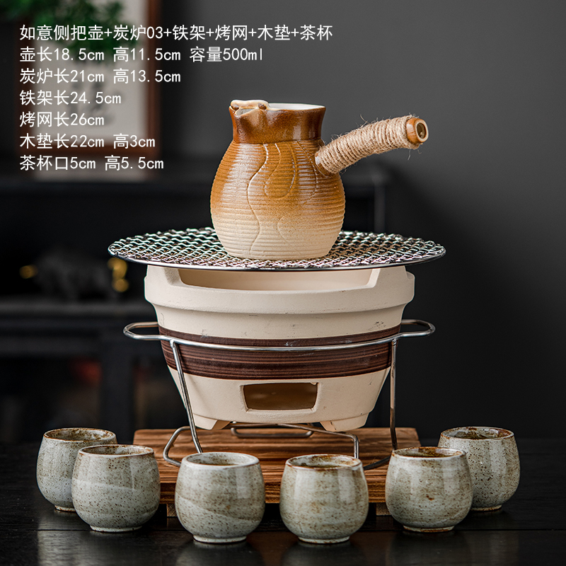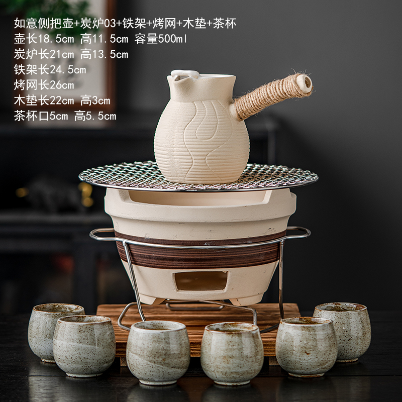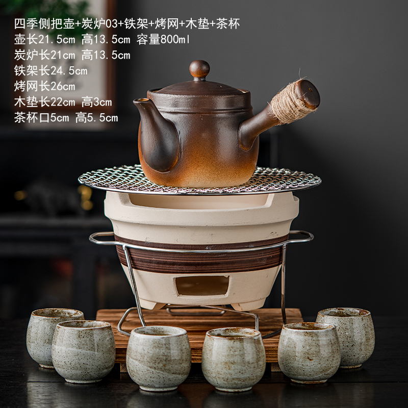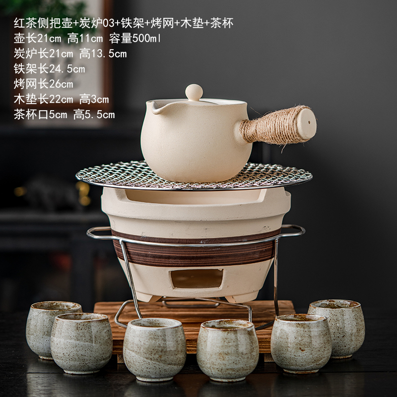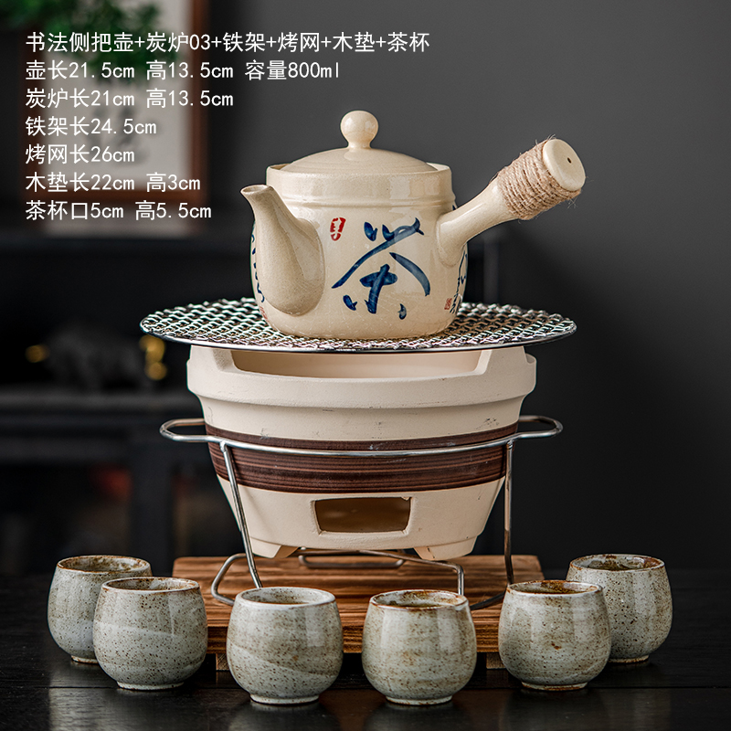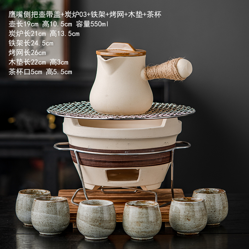 • 나무 매트가 있는 중형 숯불 난로 + 흰색 점토 홍차 측면 손잡이 냄비 + 용알 컵 6개