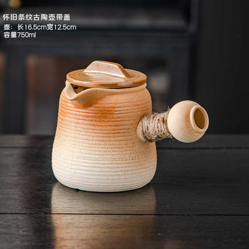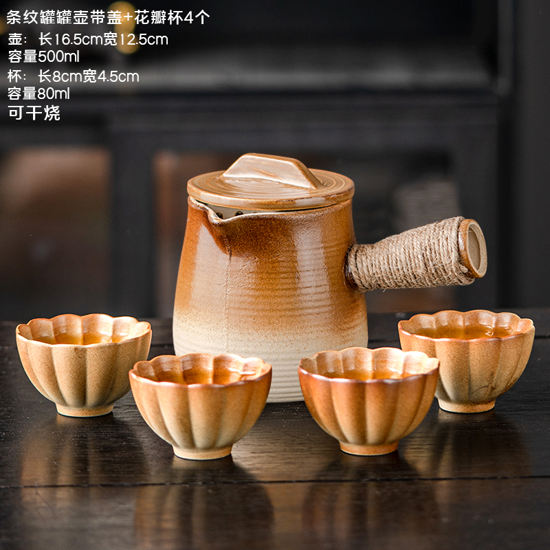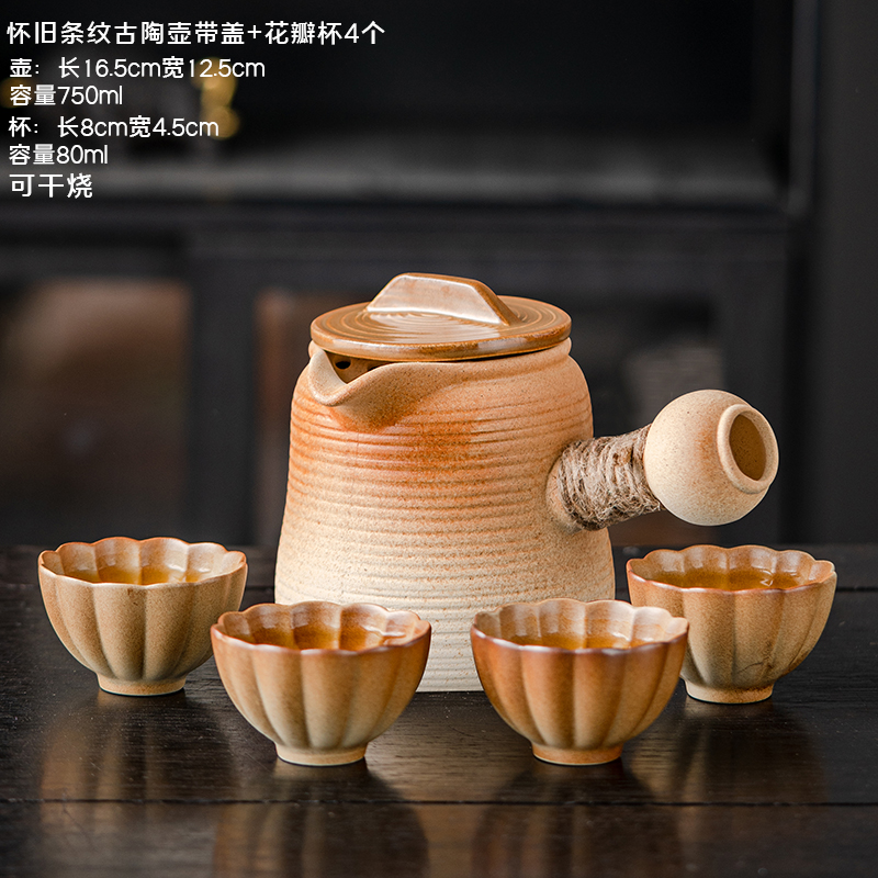 • 줄무늬 고대 도자기 냄비 + 뚜껑이 있는 꽃잎 컵 4개