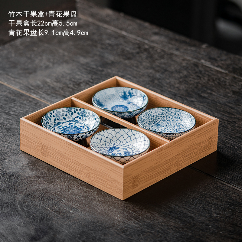 • 대나무 4각형 격자 + 파란색과 흰색 과일 접시 4종 세트