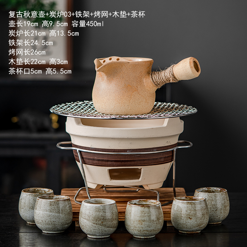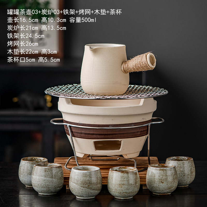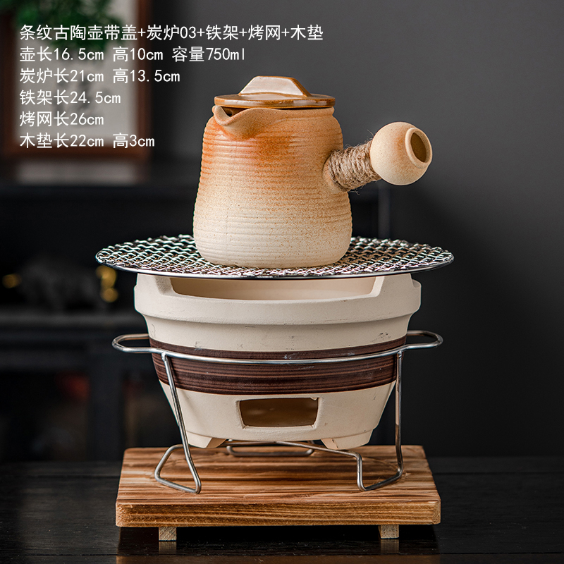 • 나무 매트가 있는 중형 숯불 난로 + 뚜껑이 있는 복고풍 항아리 주전자 + 용알 컵 6개