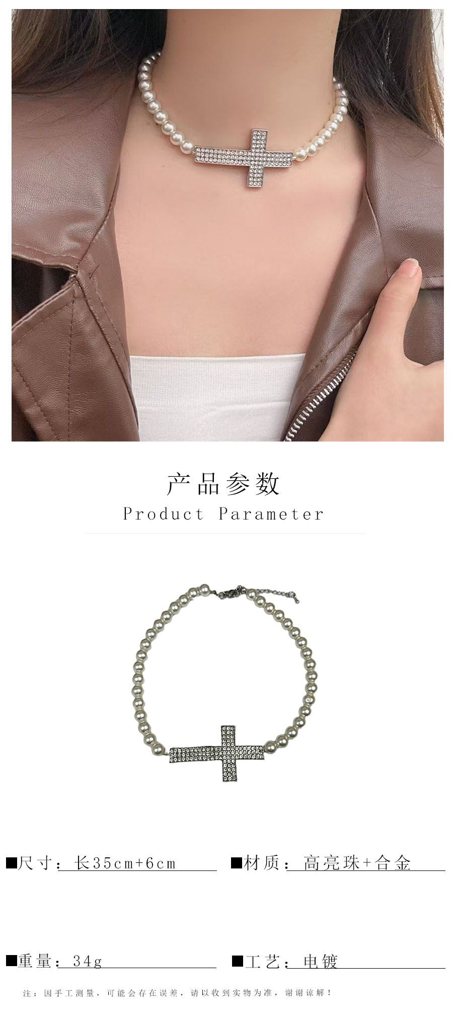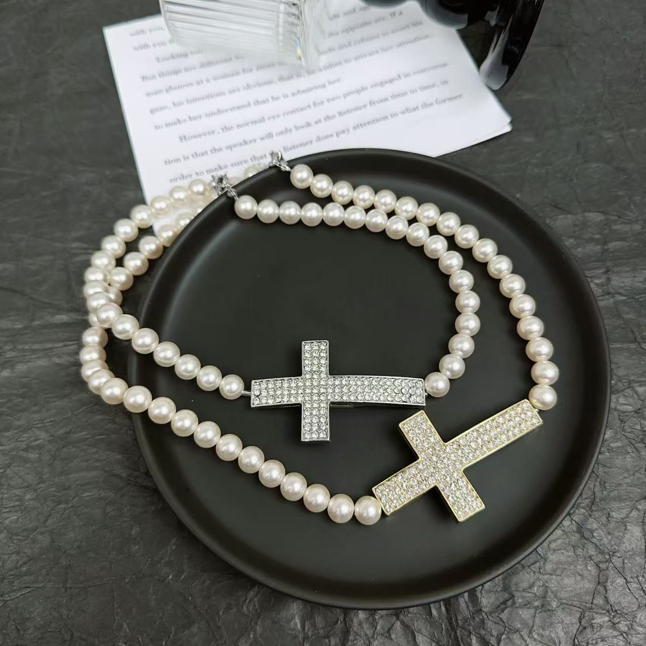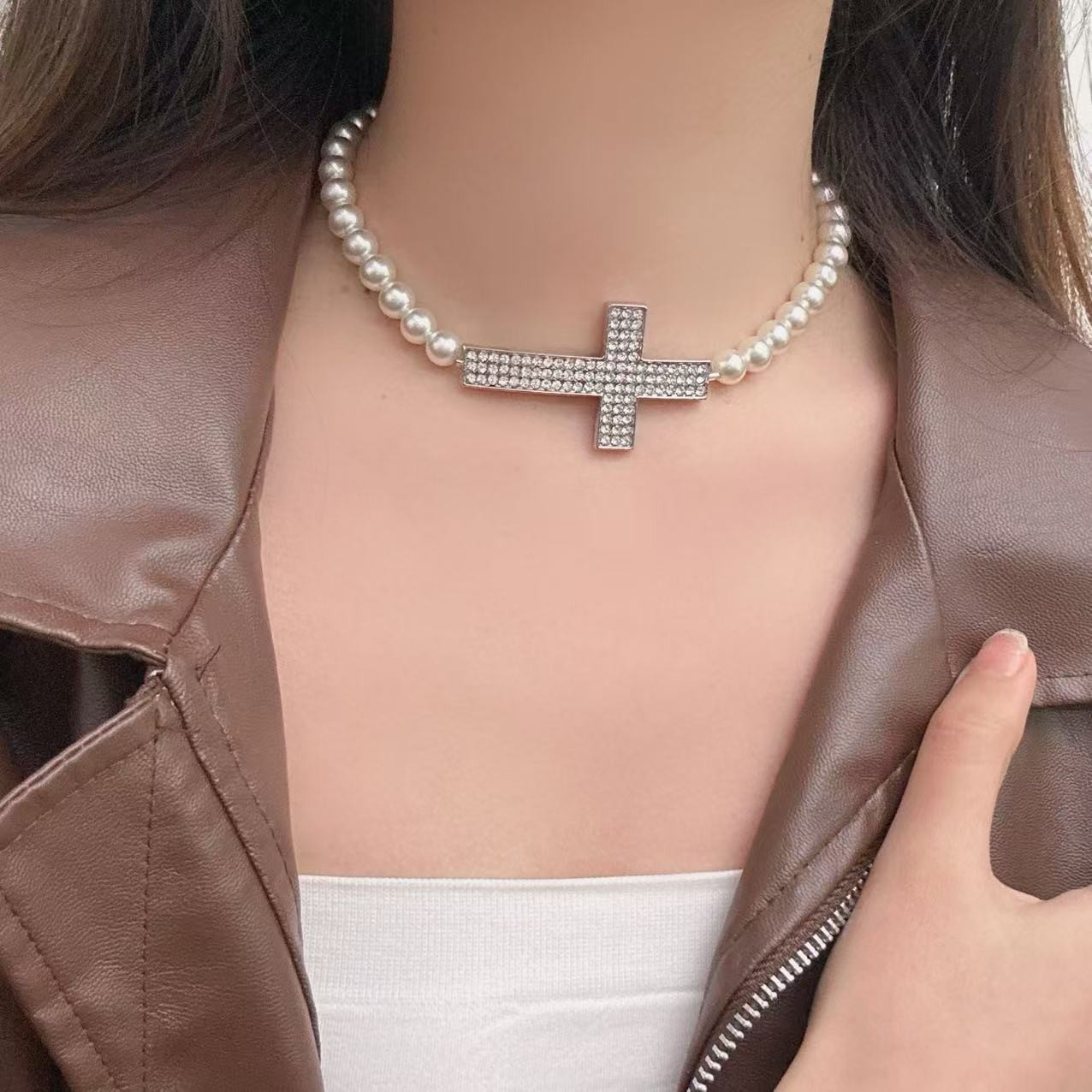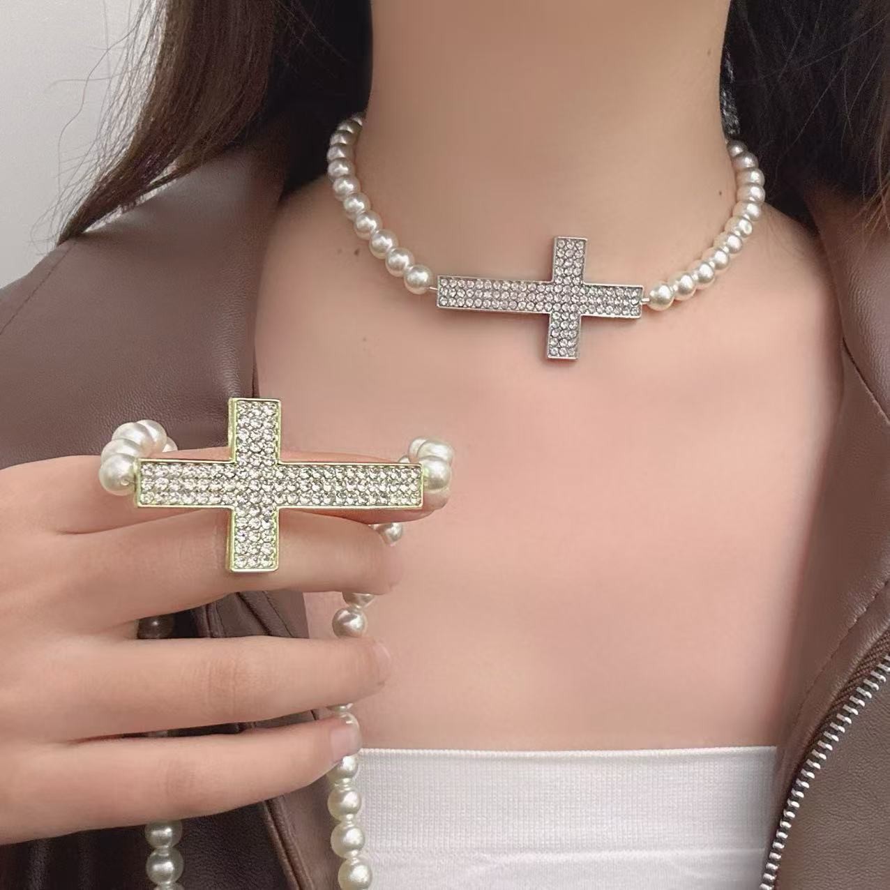 프랑스 스타일 라이트 럭셔리 풀 다이아몬드 크로스 진주 초커 목걸이 여성 패션 틈새 하이 엔드 목걸이 트렌디스토어 가기