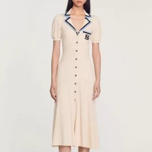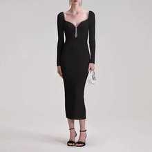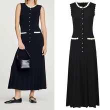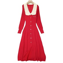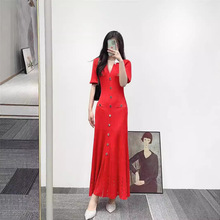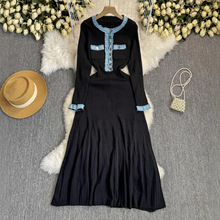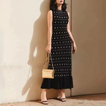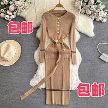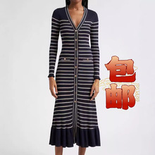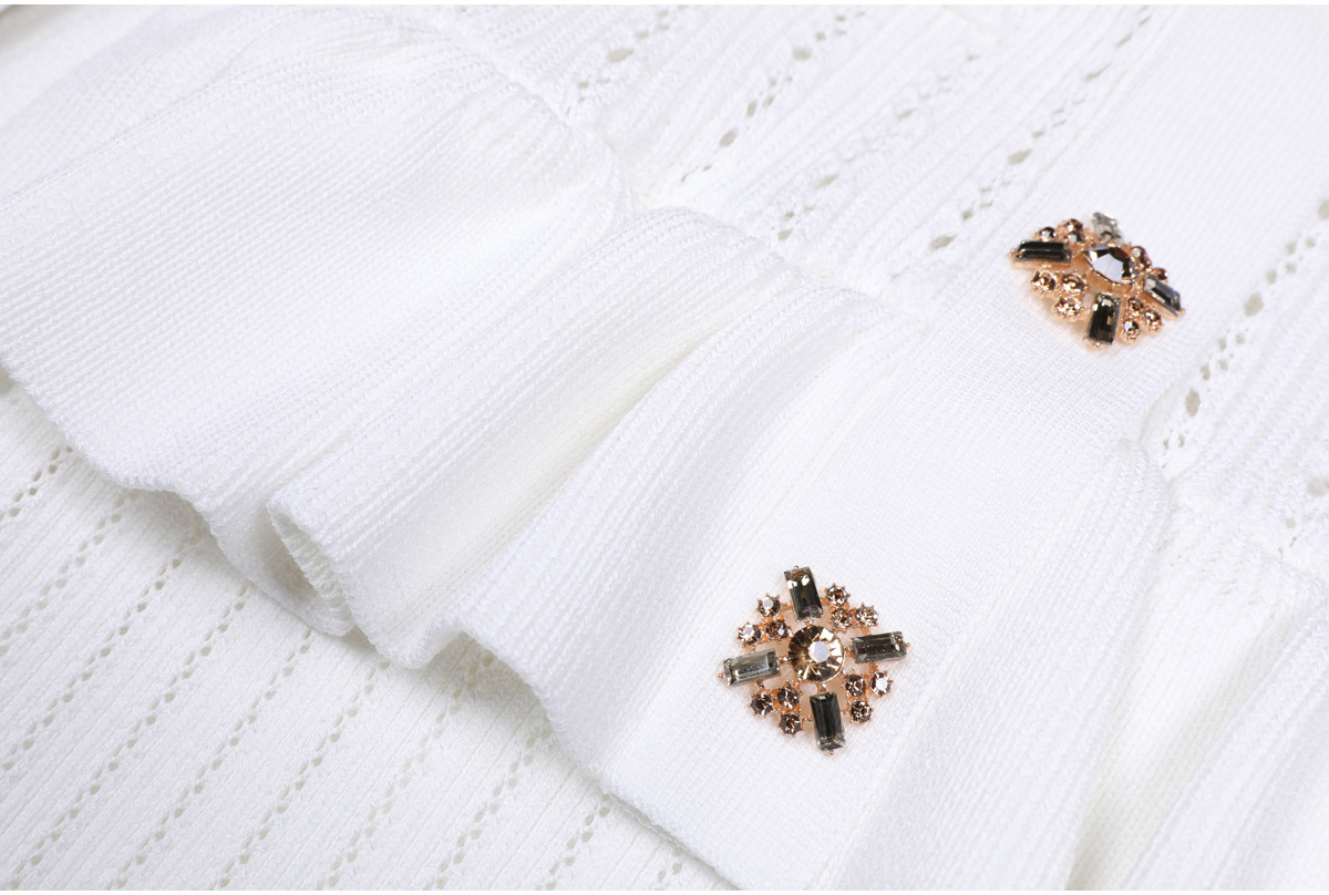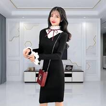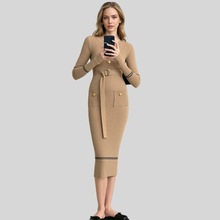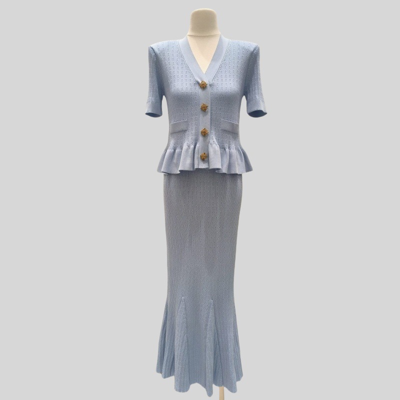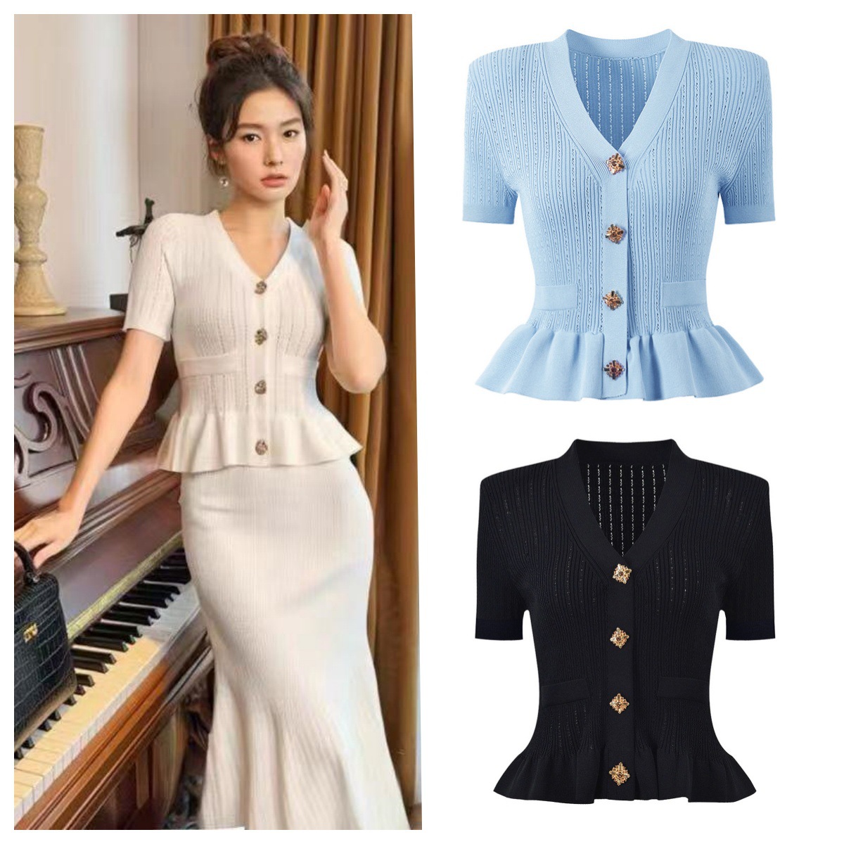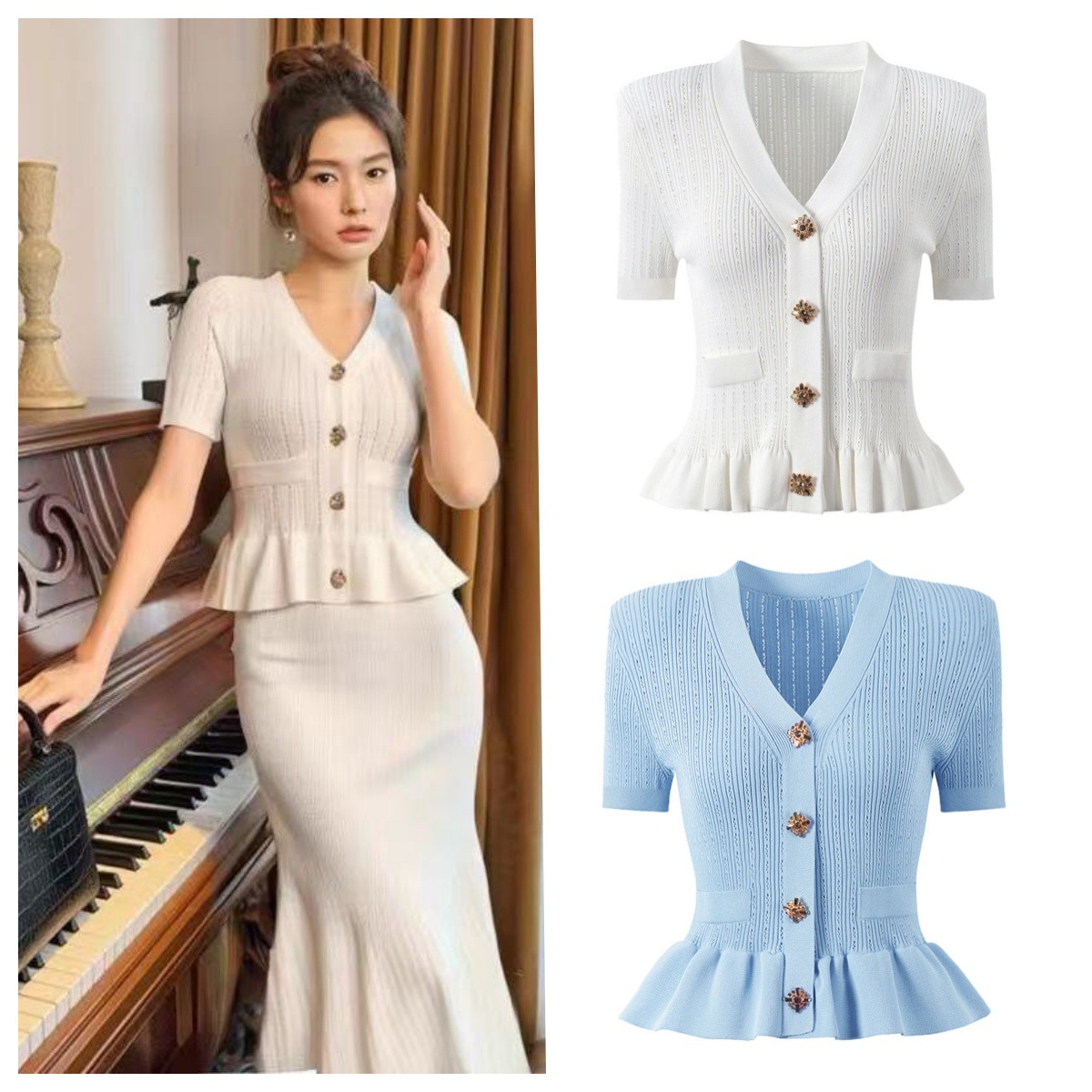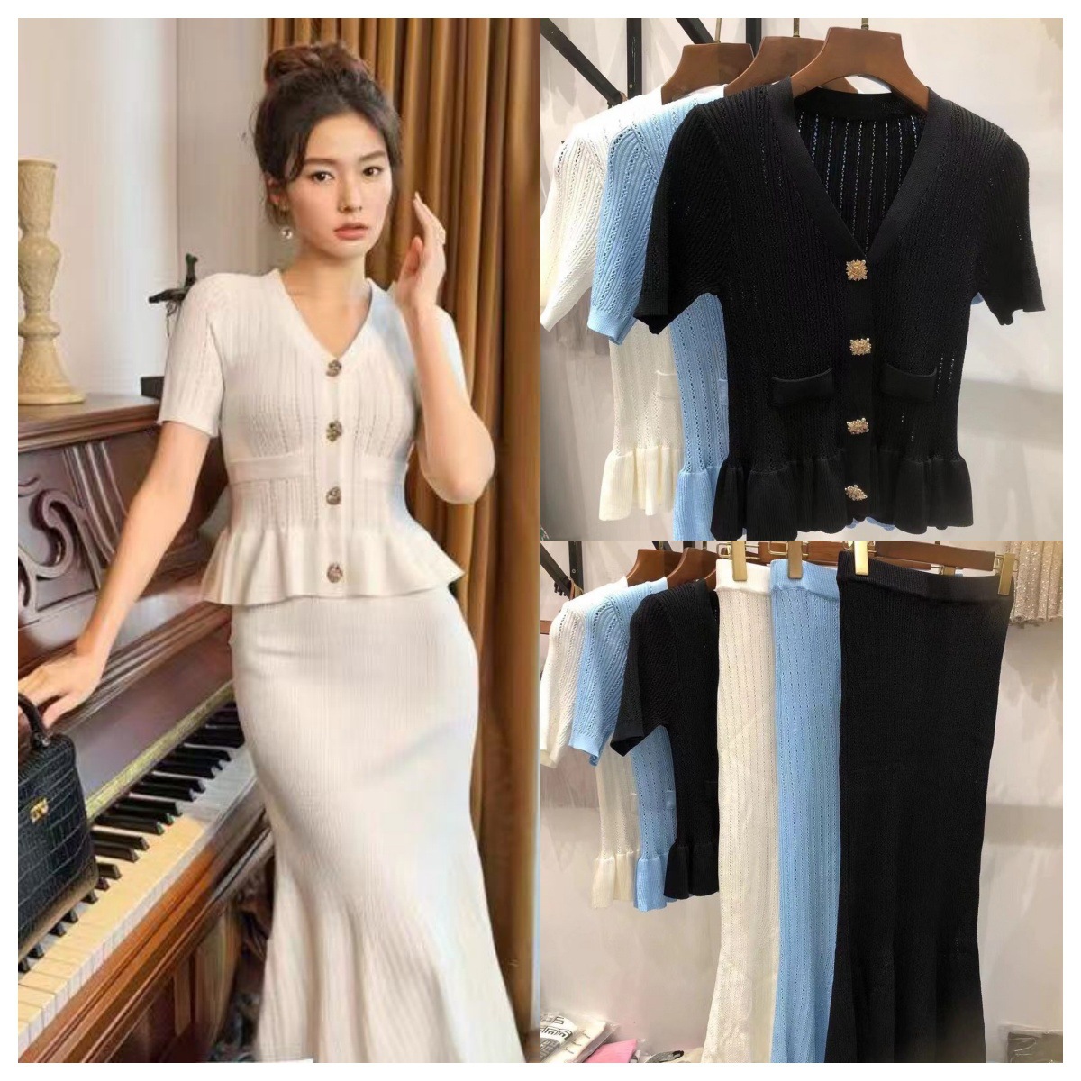 여성용 프렌치 스타일 투피스 세트, 허리를 잘록하게 잡아주는 V넥 니트 탑과 러플 밑단이 있는 힙을 감싸는 스커트 세트스토어 가기