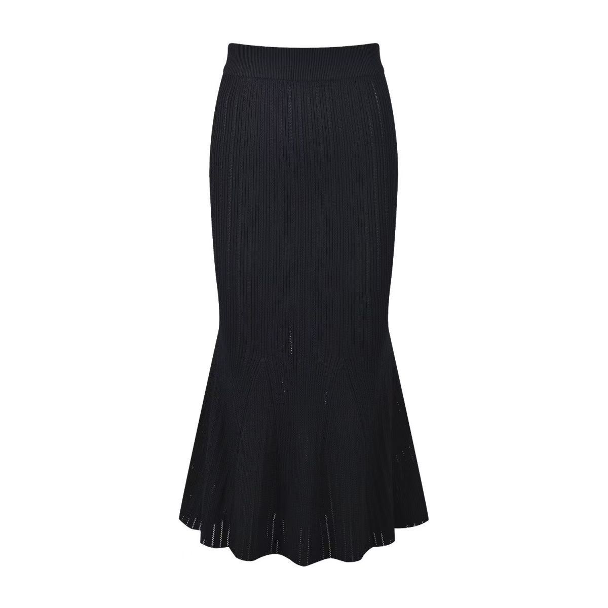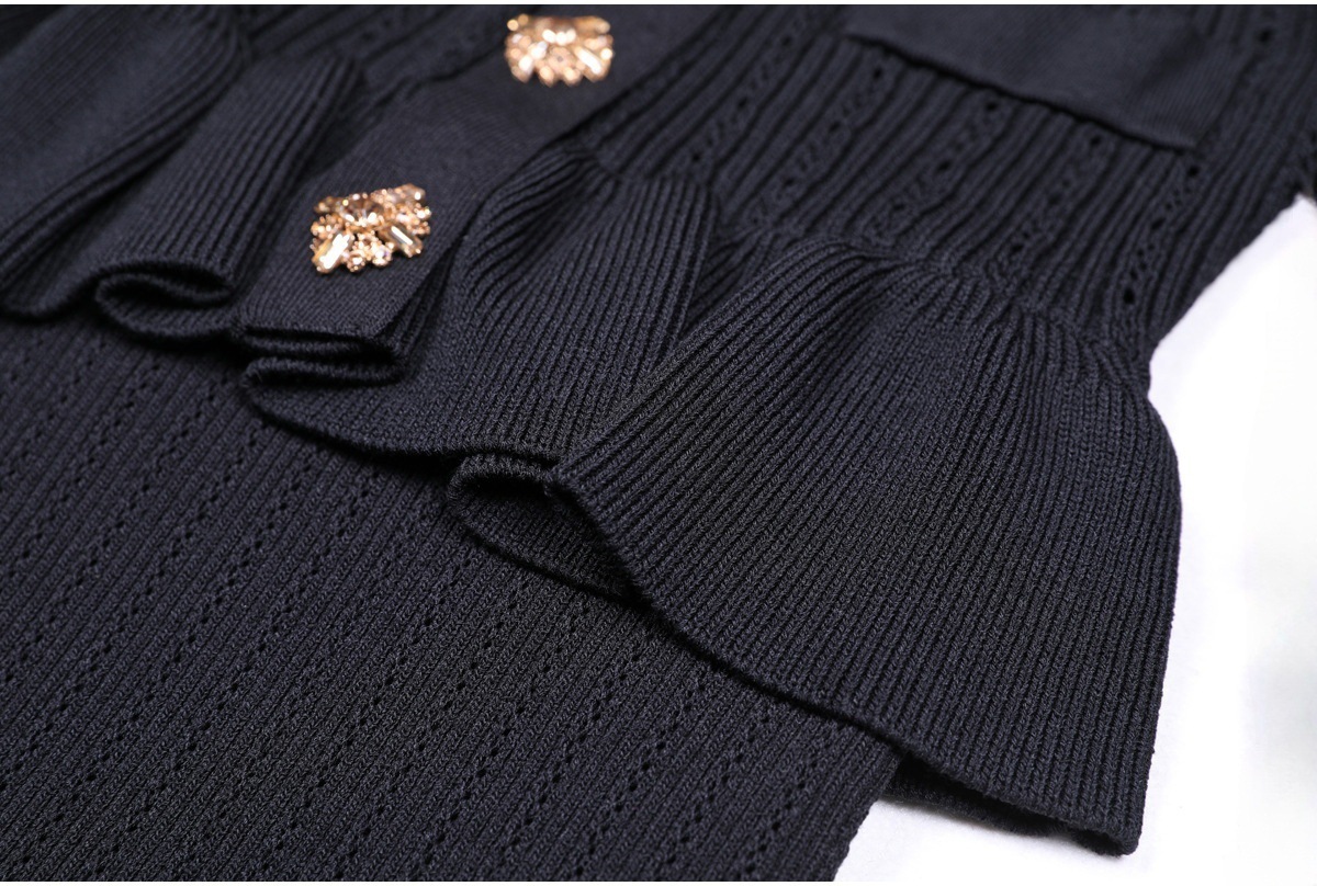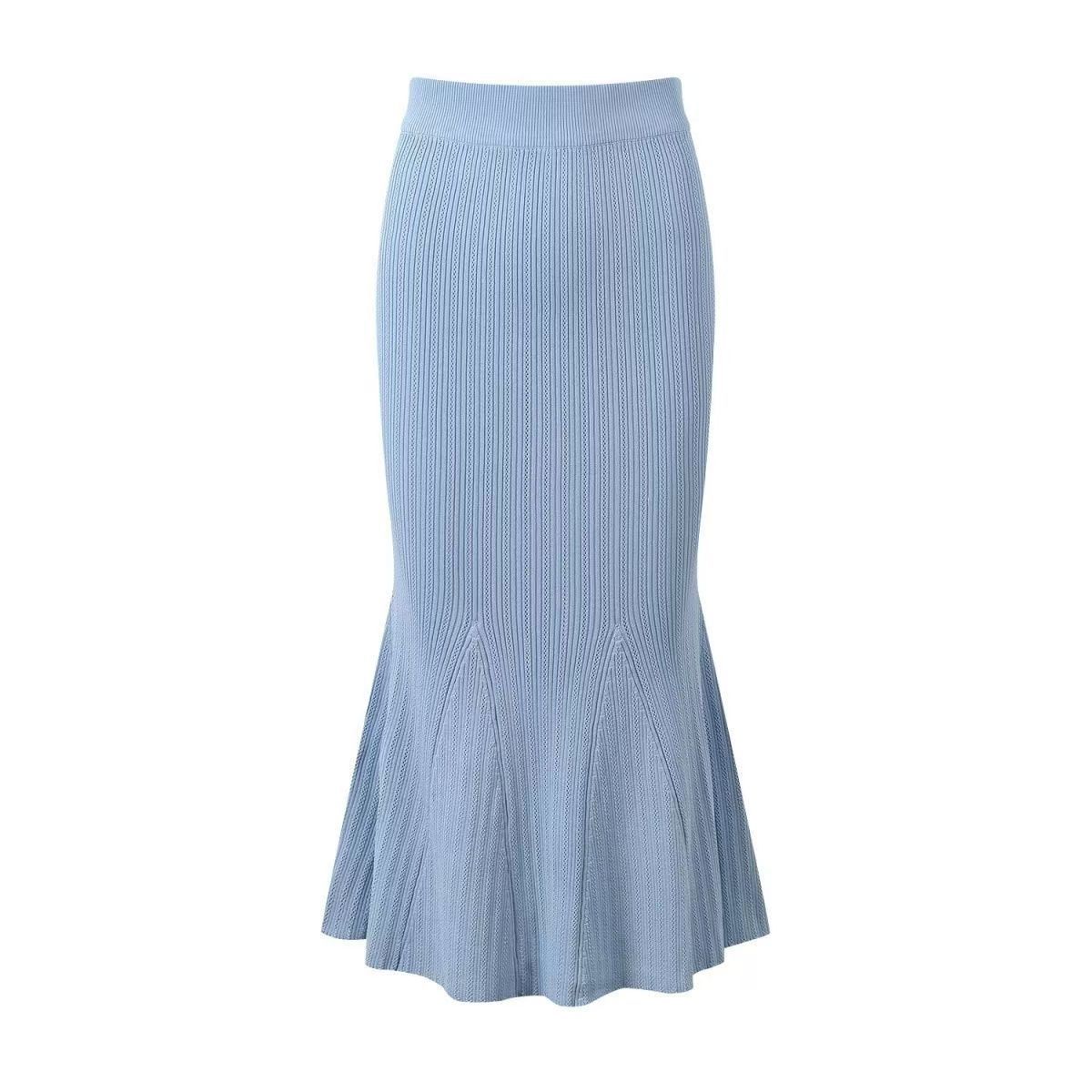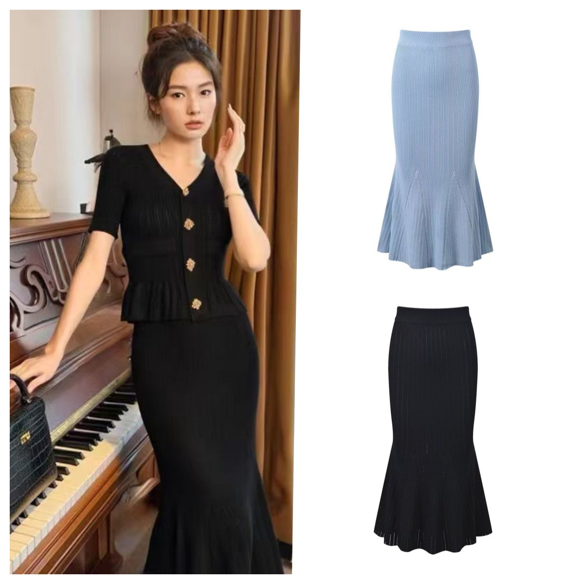 여성용 프렌치 스타일 투피스 세트, 허리를 잘록하게 잡아주는 V넥 니트 탑과 러플 밑단이 있는 힙을 감싸는 스커트 세트