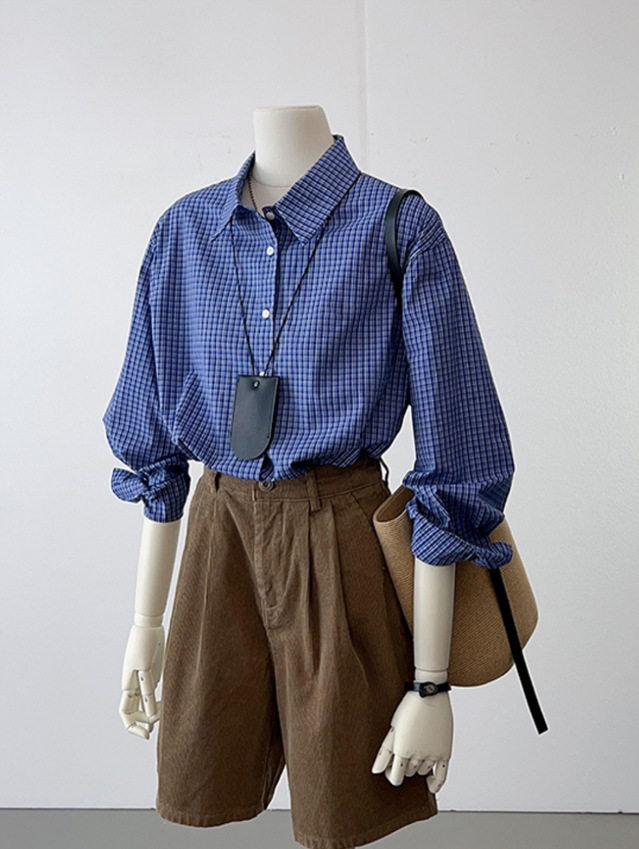 CHAO 클래스 추천! 그것은 정말 좋은 ~ 블루 체크 무늬 셔츠의 한국 버전 여성의 다재다능한 느슨한 옷깃 셔츠스토어 가기