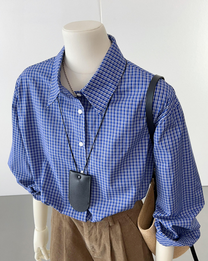 CHAO 클래스 추천! 그것은 정말 좋은 ~ 블루 체크 무늬 셔츠의 한국 버전 여성의 다재다능한 느슨한 옷깃 셔츠