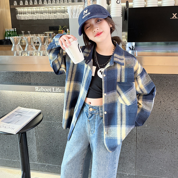 소녀 격자 무늬 셔츠 봄 2025 새로운 어린이 서양식 한국 스타일 탑 옷깃 중대형 어린이 캐주얼 셔츠 트렌디스토어 가기