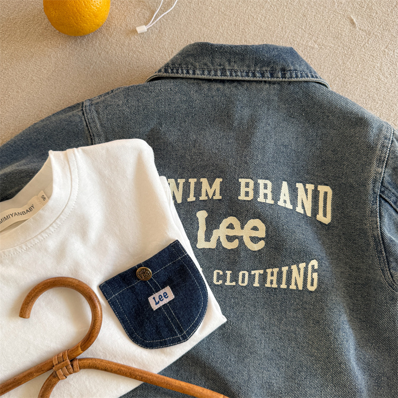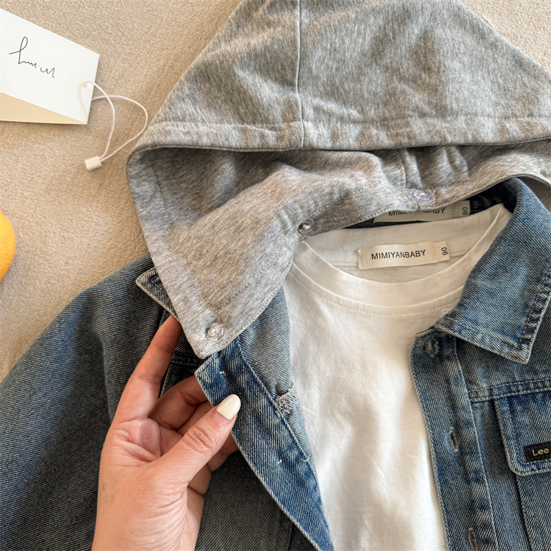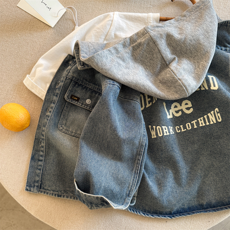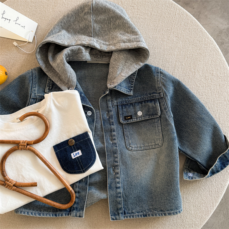 아동용 셔츠 2025 가을 한국어 버전 소년과 소녀를위한 새로운 인쇄 된 문자 셔츠 아기 후드 데님 셔츠 유행스토어 가기
