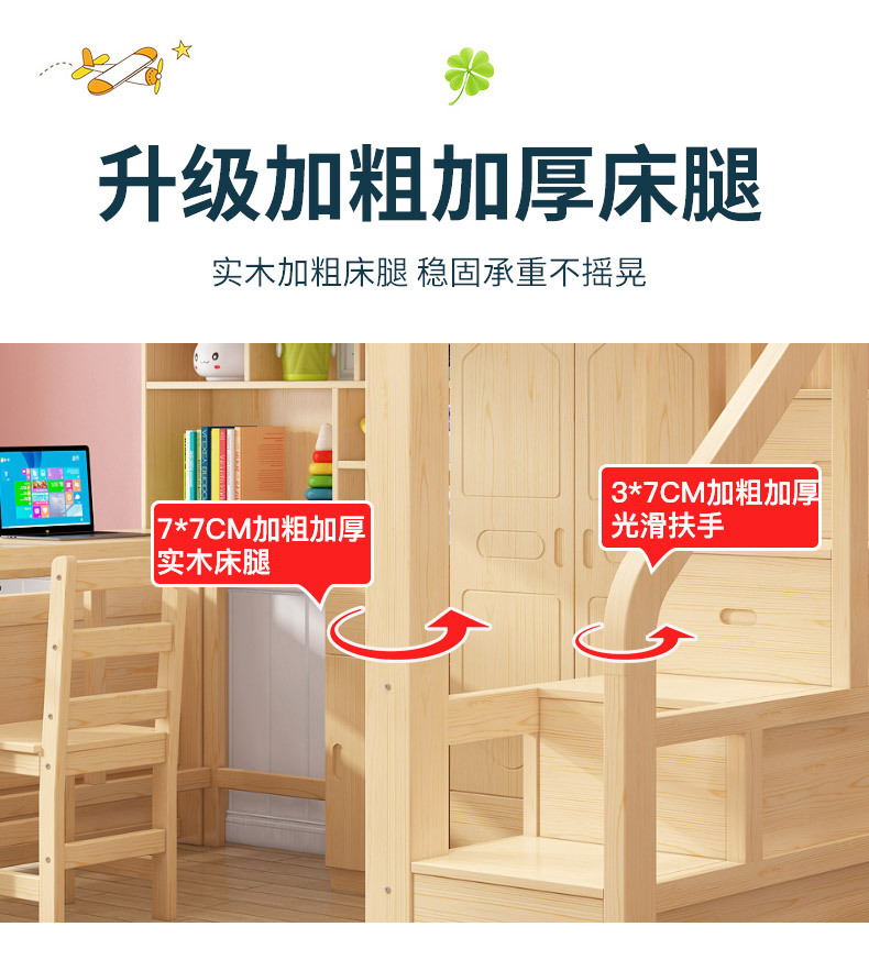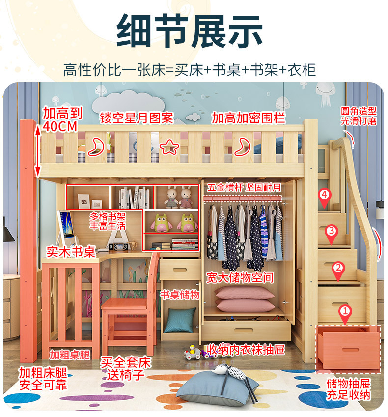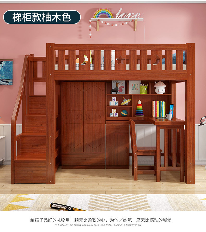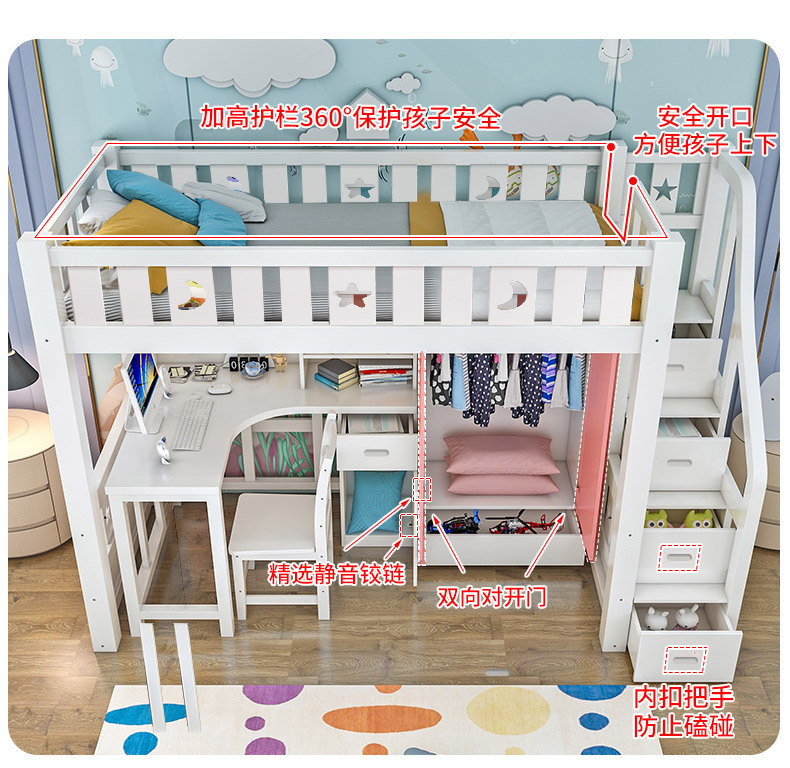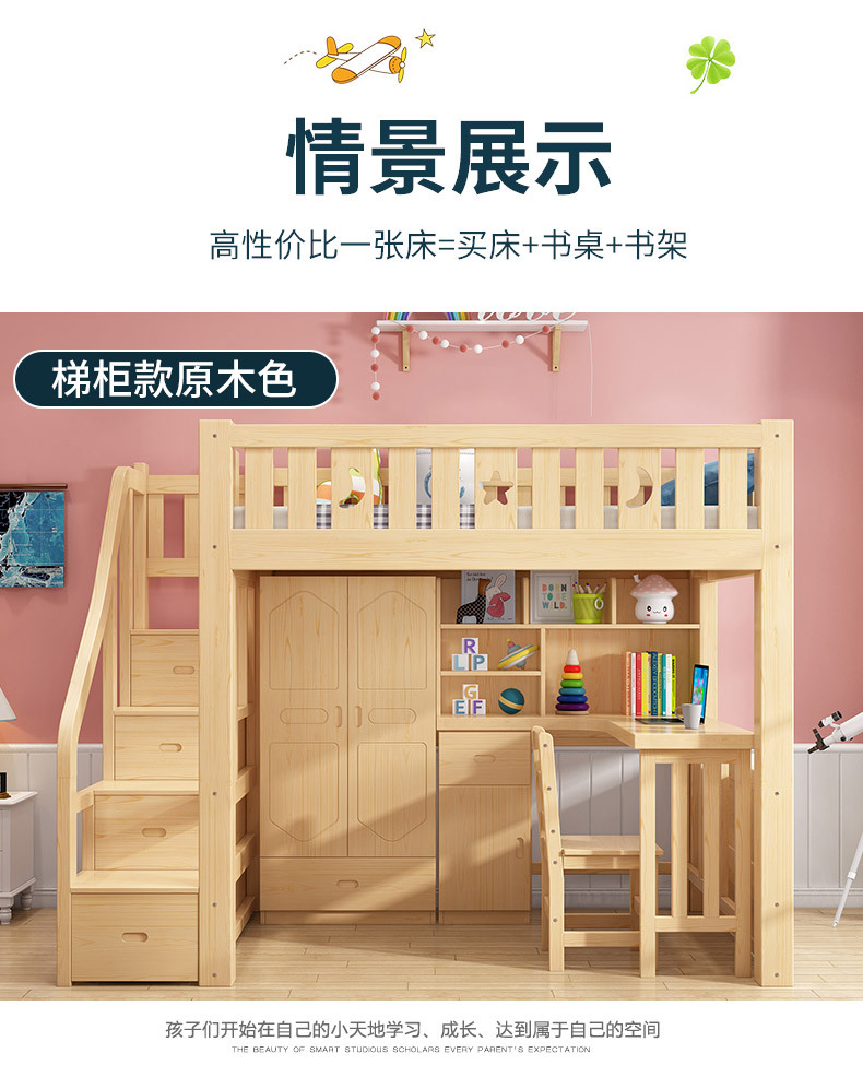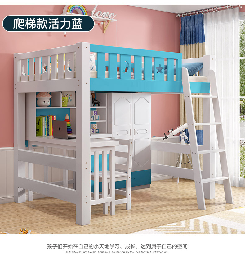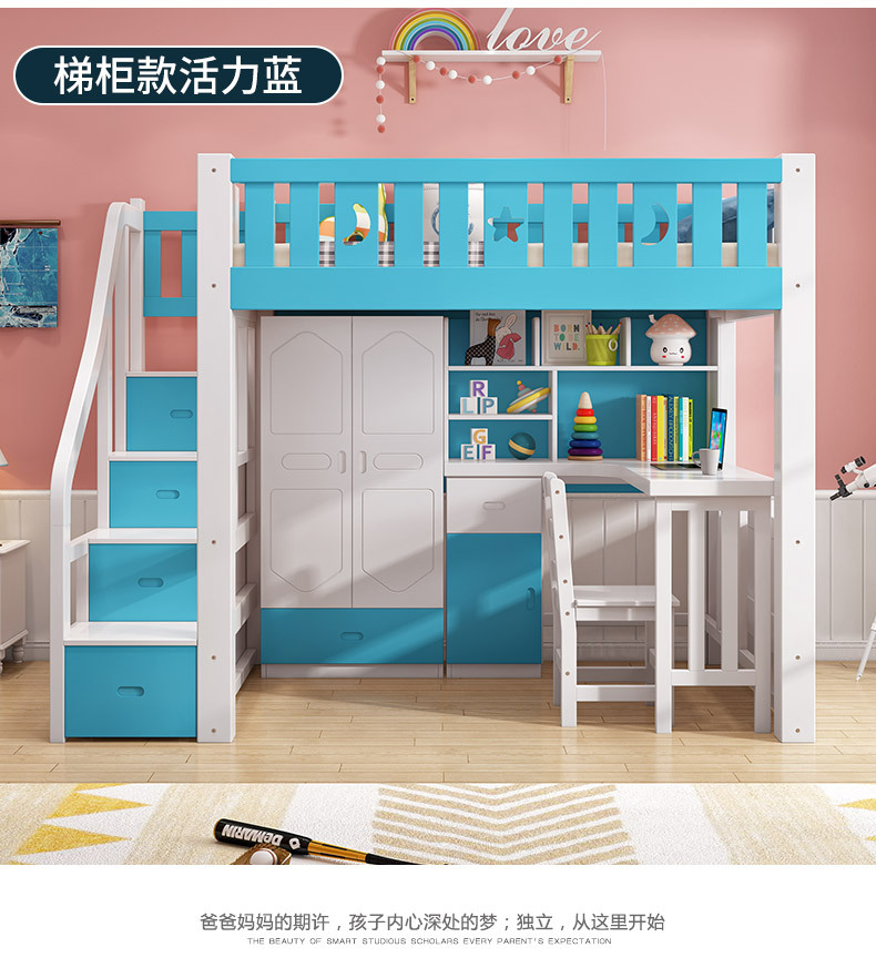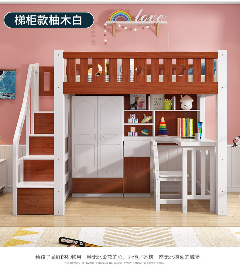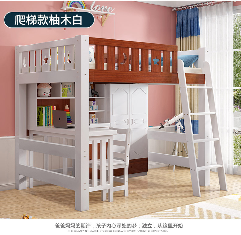 어린이 다기능 조합 하이 로우 침대 책상 더블 레이어 상단 및 하단 이층 높은 침대 침대 침대 하단 테이블 옷장 통합 침대스토어 가기