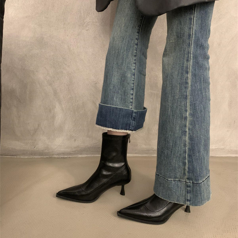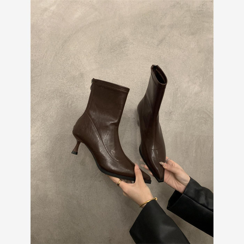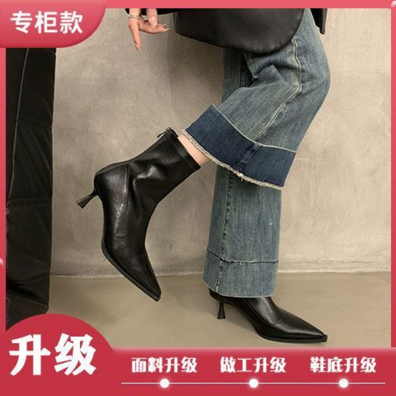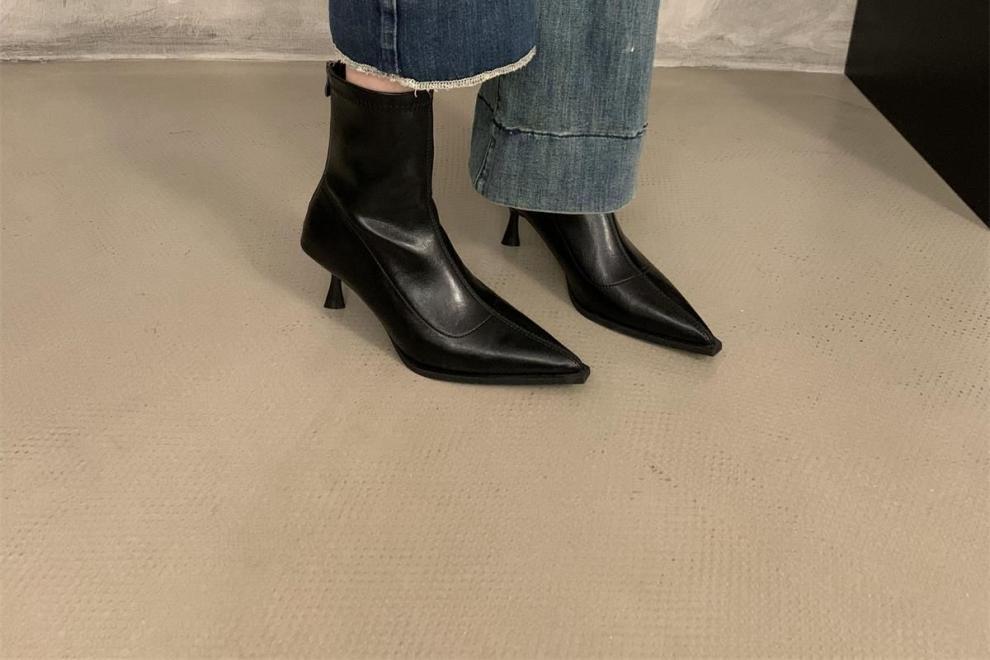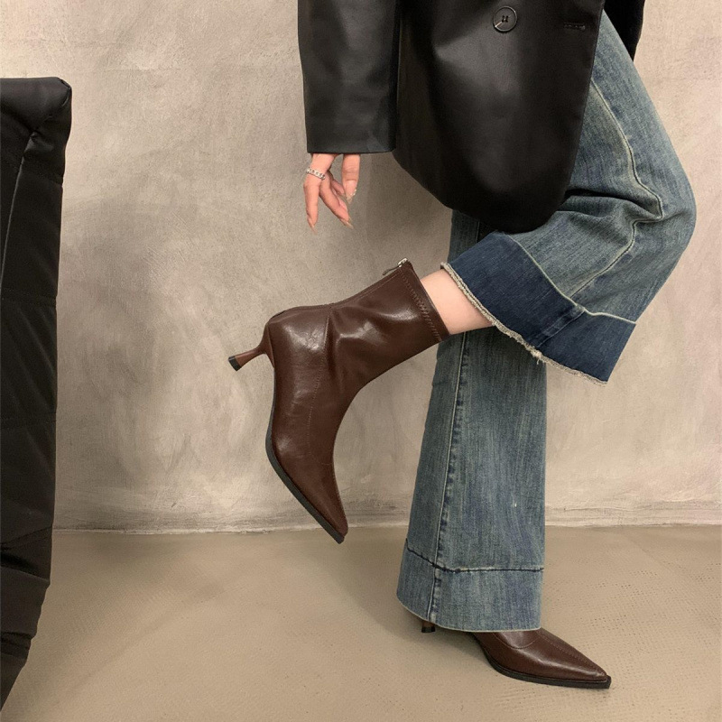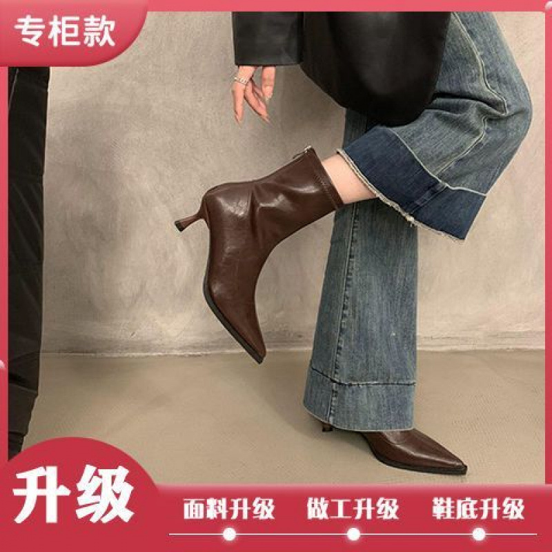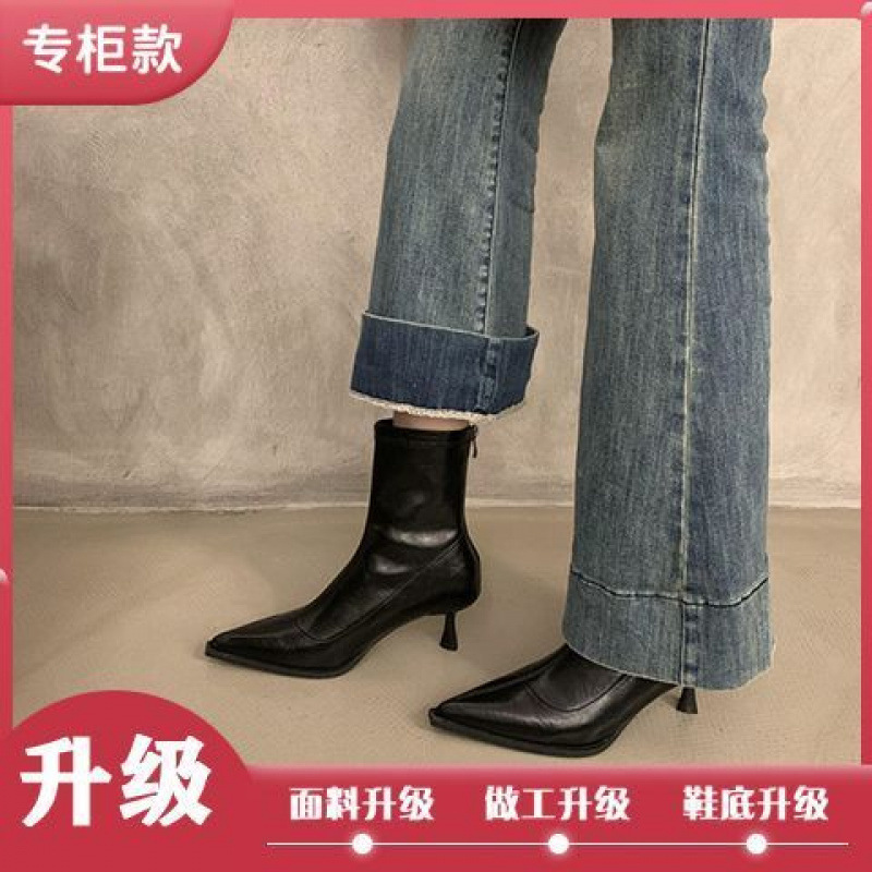 뾰족한 하이 엔드 발목 부츠 여성 가을 2024 새로운 도착 짧은 기모 하이힐 디자인 패션 얇은 부츠스토어 가기