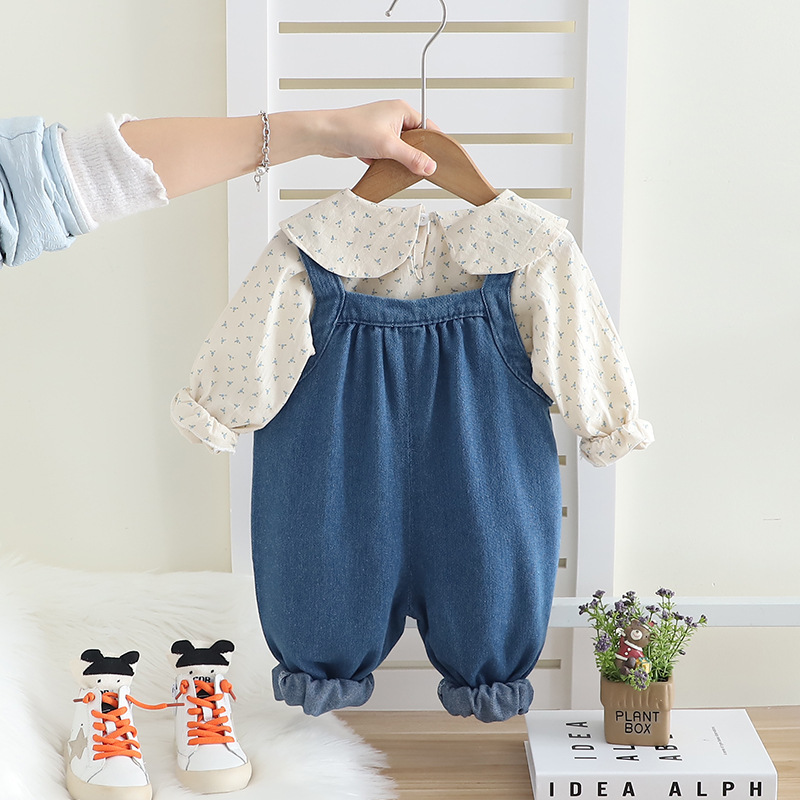 무료 배송 이키즈 소녀 봄 가을 세트 한국 스타일 아기 소녀 봄 옷 데님 스트랩 긴 소매 세트스토어 가기