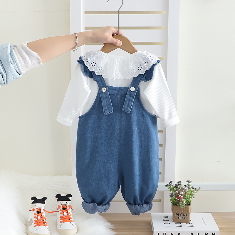 무료 배송 이키즈 소녀 봄 가을 세트 한국 스타일 아기 소녀 봄 옷 데님 스트랩 긴 소매 세트