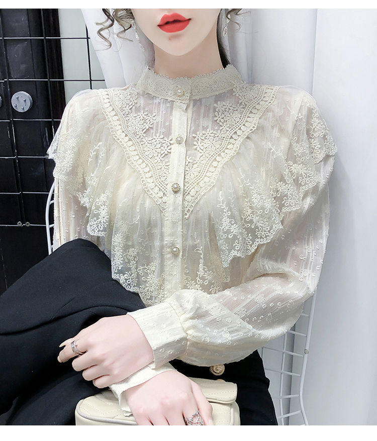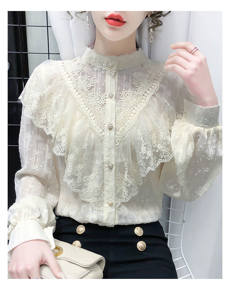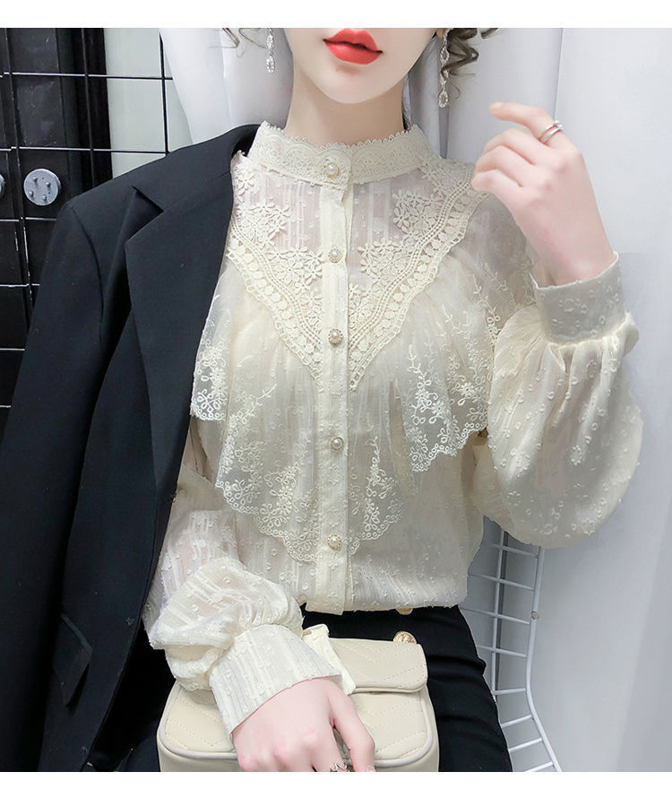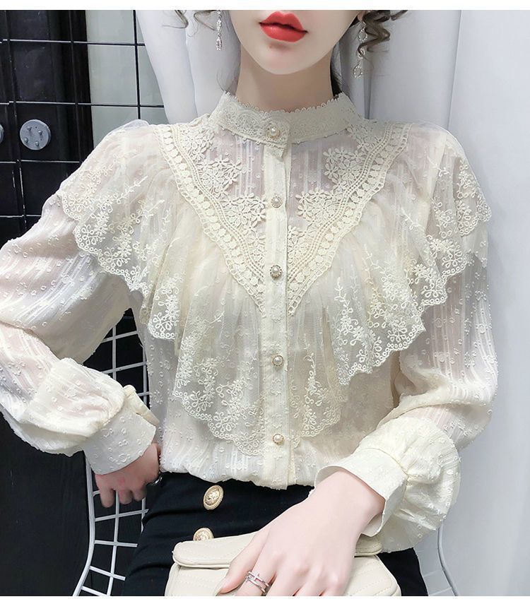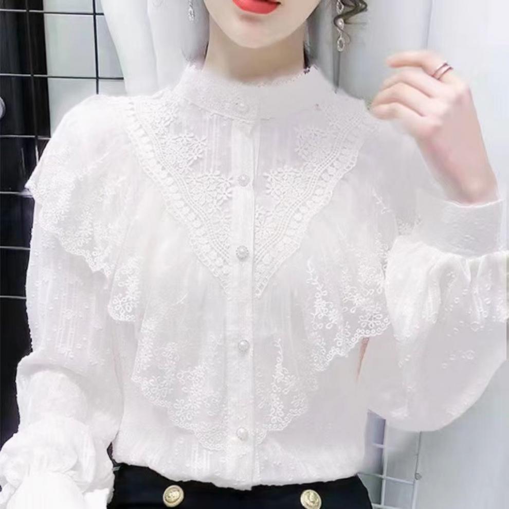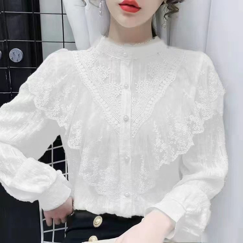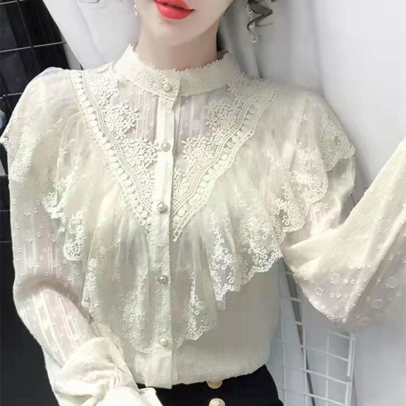 2025 봄과 가을 새로운 프랑스 복고풍 셔츠 여성 디자인 틈새 올 매치 러플 쉬폰 레이스 탑스토어 가기