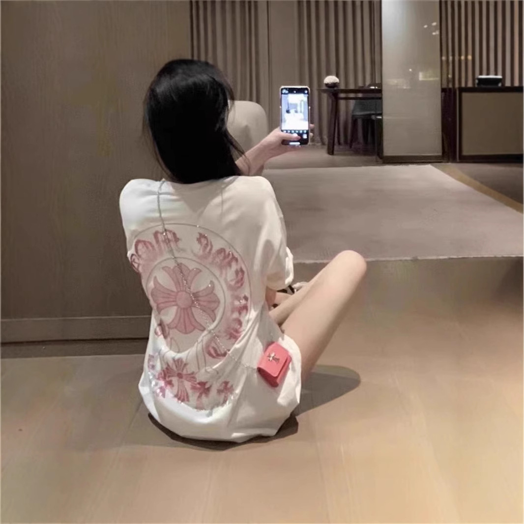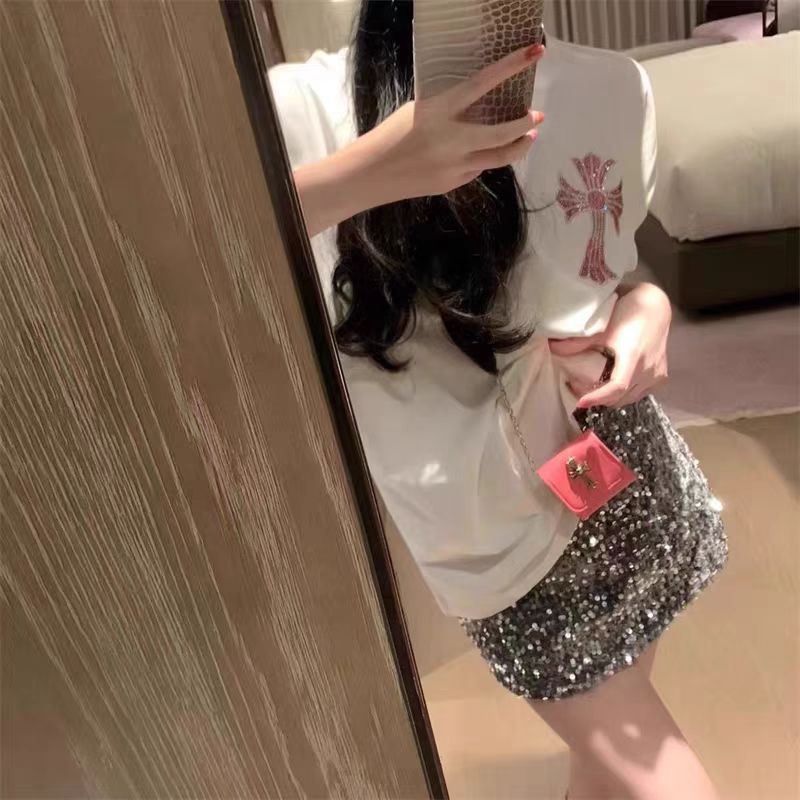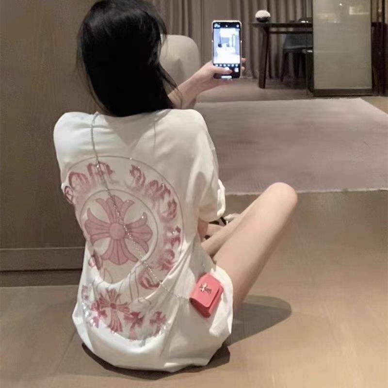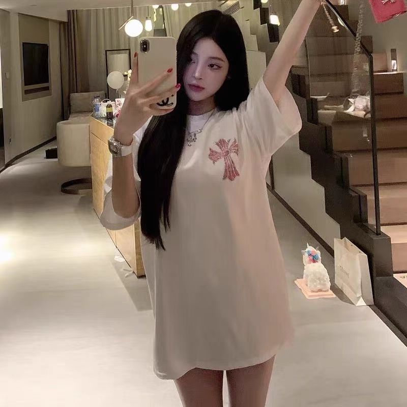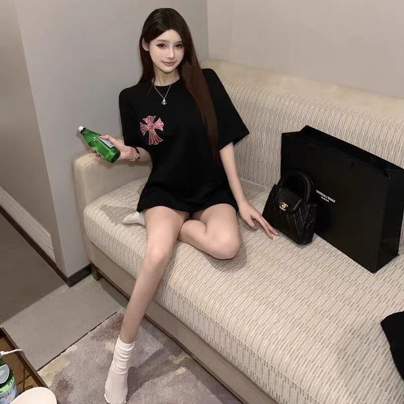 여름 새로운 국가 패션 우아한 핫 드릴링 100 면 반팔 티셔츠 여성용 중간 길이의 서양식 슬리밍 탑