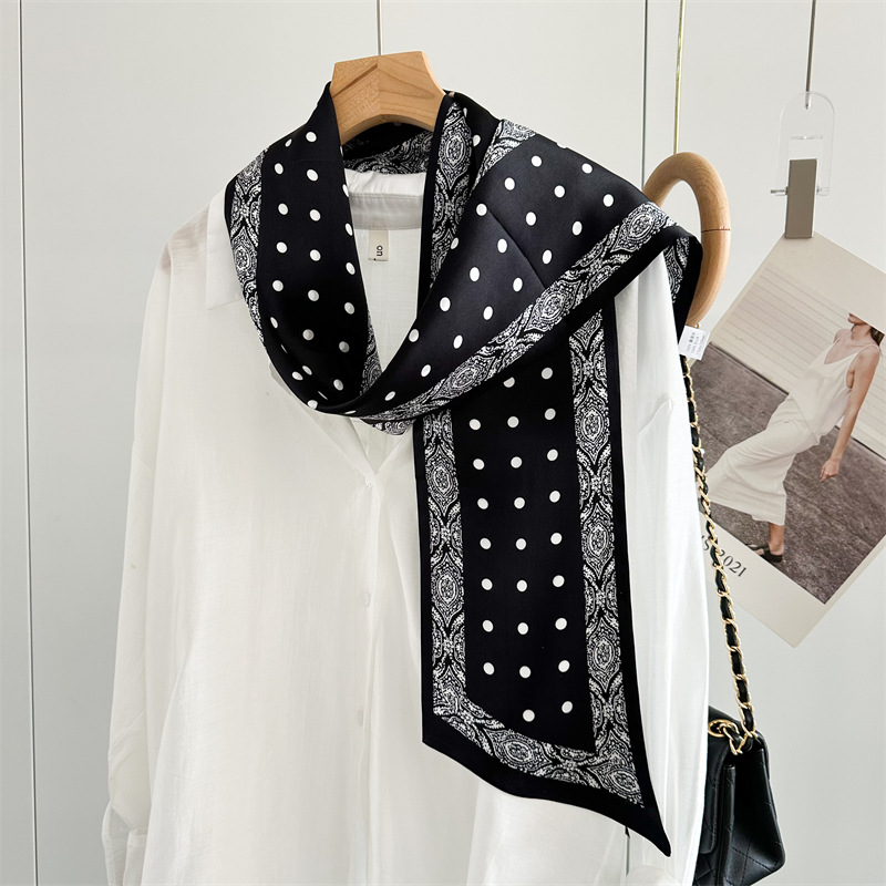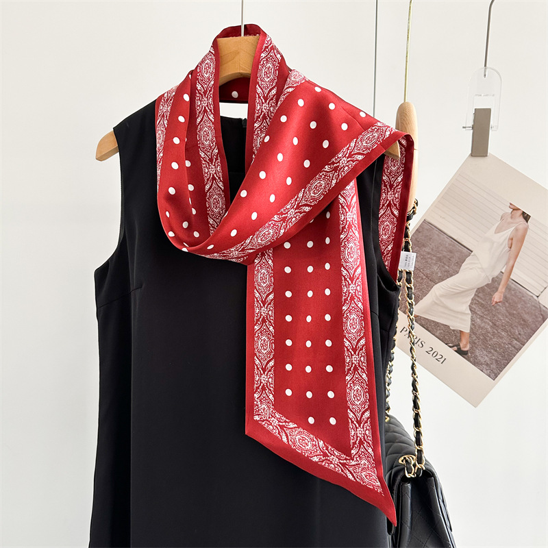 고급 레트로 웨이브 도트 실크 스카프 여성의 우아한 뽕나무 실크 스카프 얇은 좁은 긴 더블 레이어 양면 스카프 리본