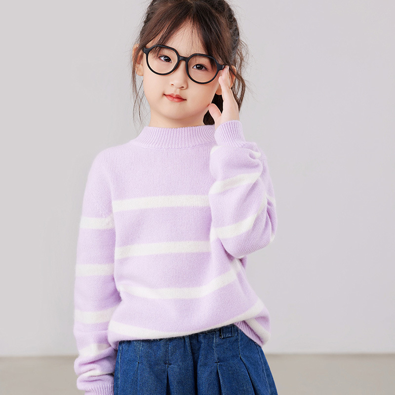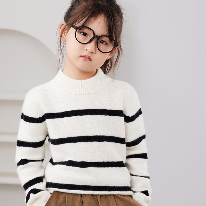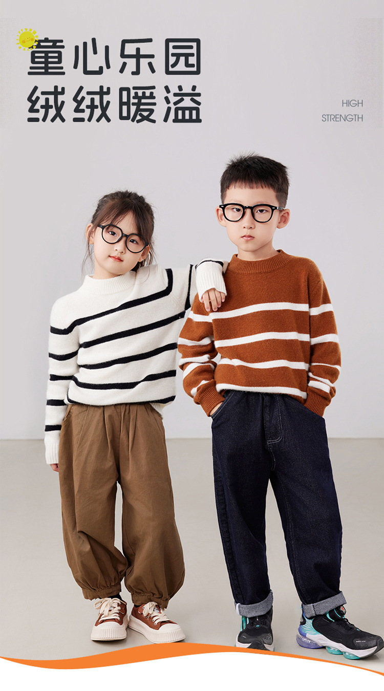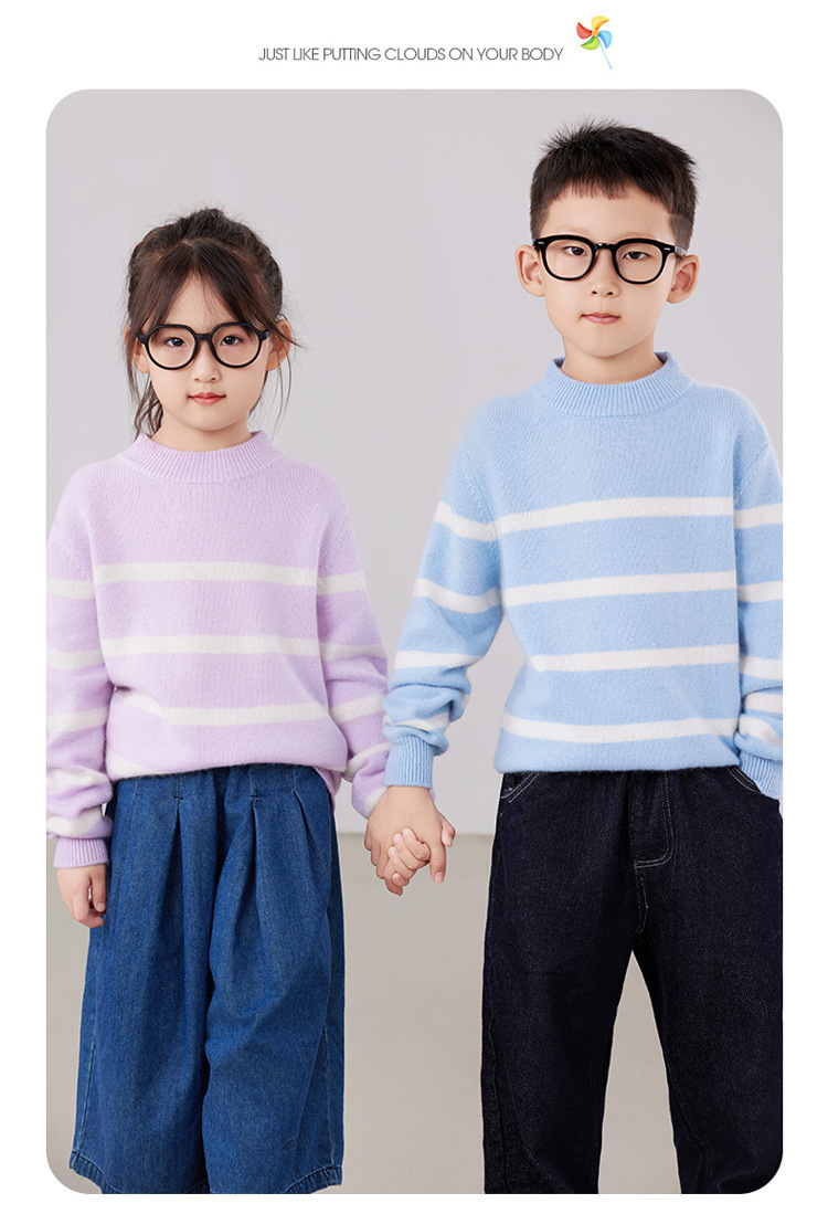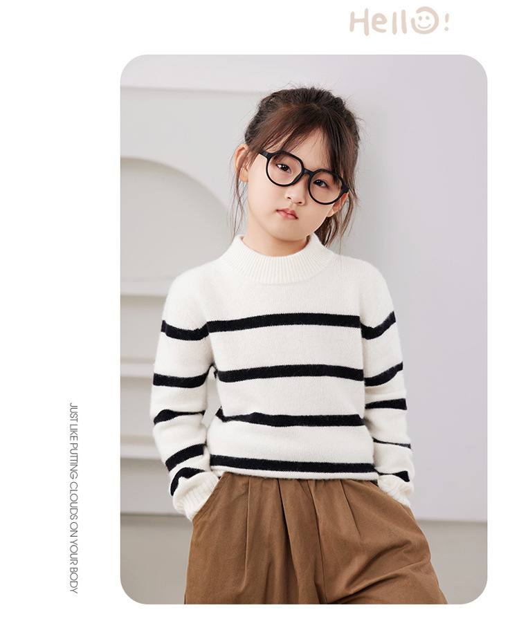 2025 새로운 소년과 소녀 반 터틀넥 스웨터 피부 친화적 인 벨벳 미들 및 빅 키즈베이스 셔츠 느슨한 어린이 줄무늬 스웨터스토어 가기