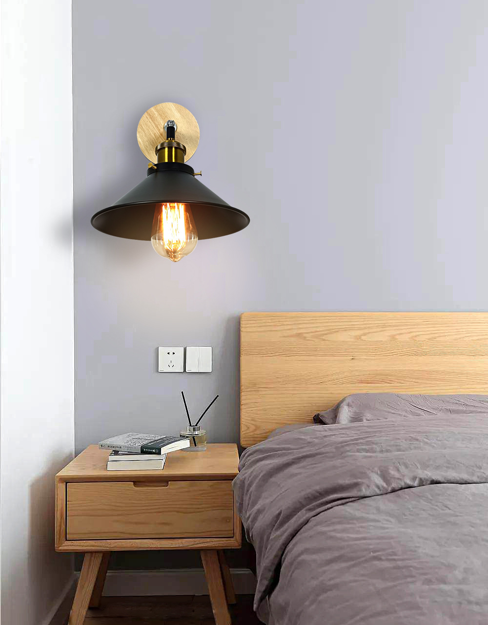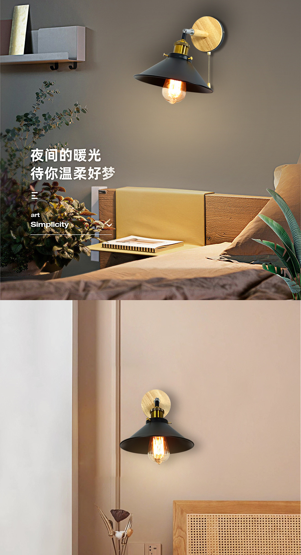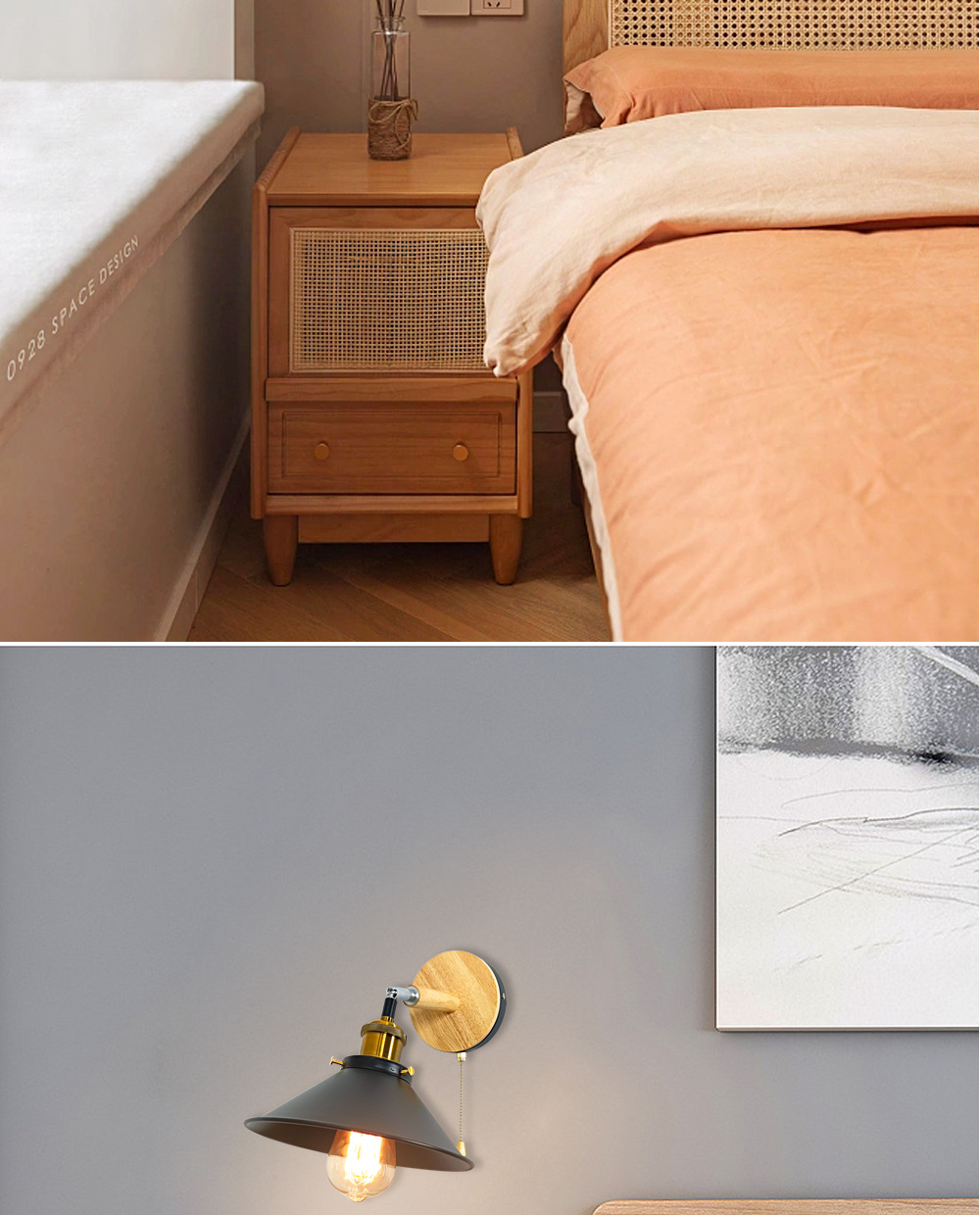 국경 간 재고 미국식 객실 현대 간단한 침실 침대 옆 램프 배경 벽 현관 지퍼 나무 곡물 장식 야간 조명스토어 가기