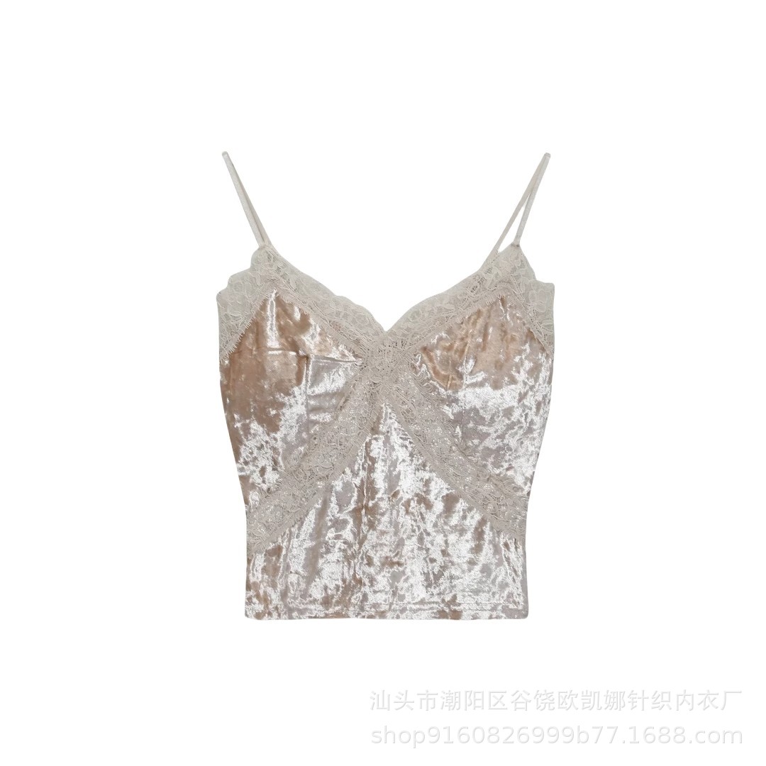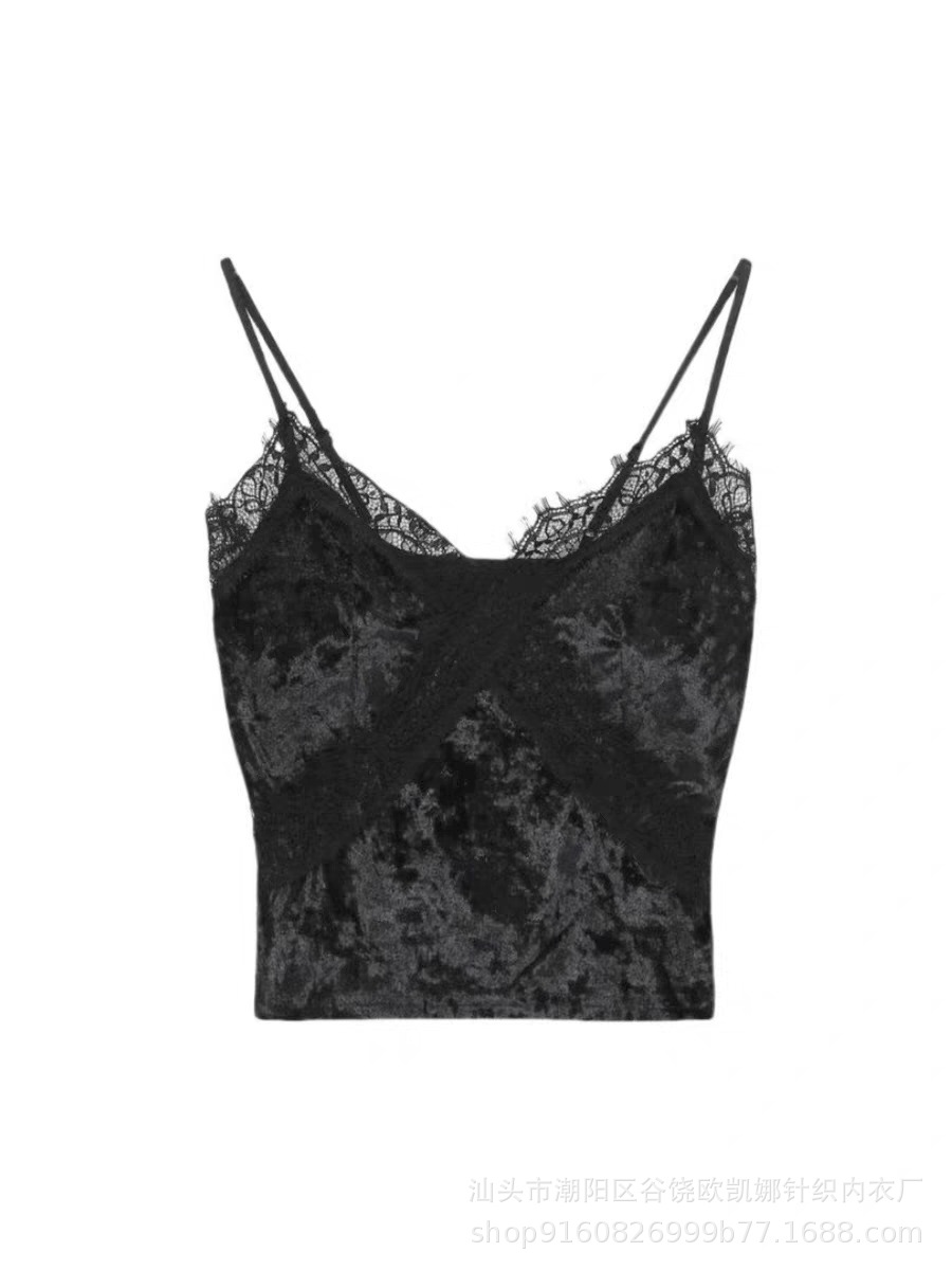 봄 여름 인기 벨벳 속눈썹 레이스 복고풍 기질 캐미솔 브이넥 섹시한 스파게티 스트랩 주름 여성용 아름다운 등스토어 가기