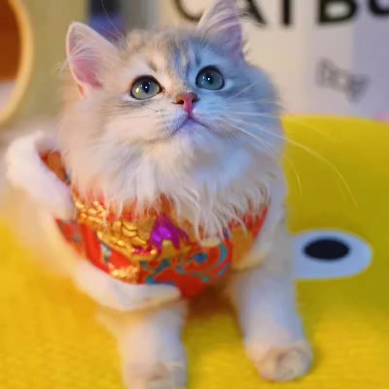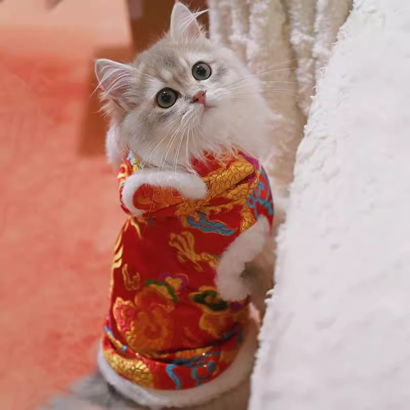 마밍 신년 옷 겨울 두꺼운 당나라 원피스 애완 동물 고양이 가을과 겨울 머펫 푸른 고양이 새해 축제 가운스토어 가기