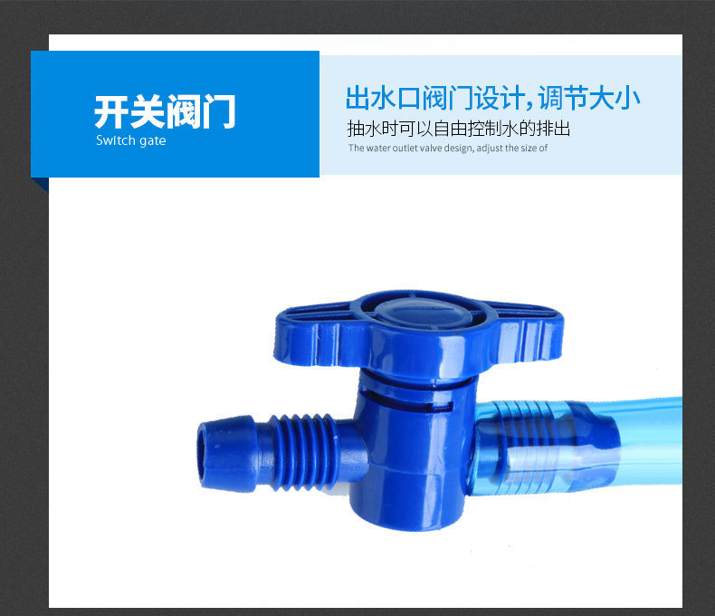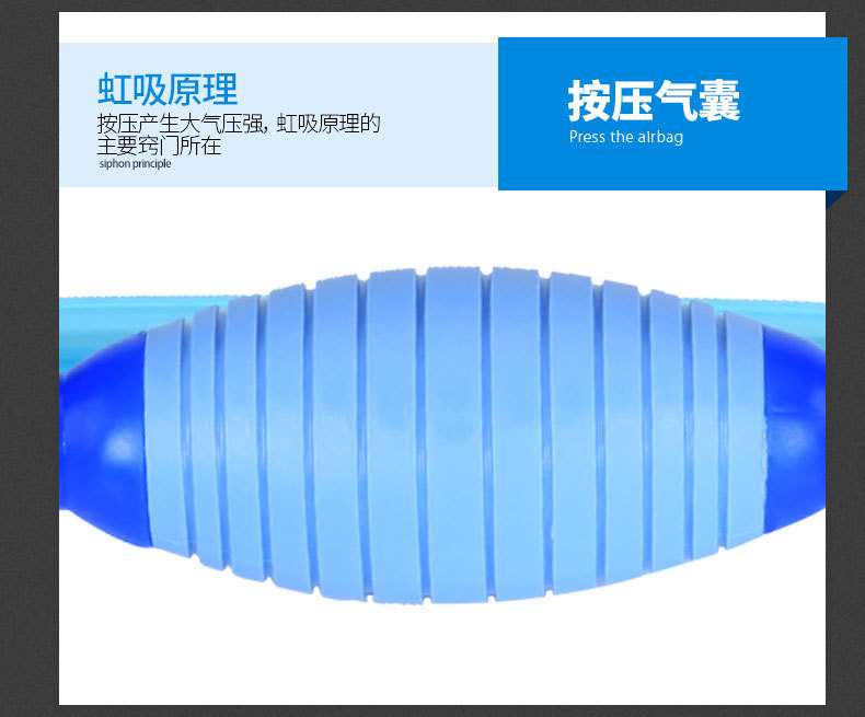 如果在使用时按照正确使用方法吸不出水,应检查气囊两端连接管是否松动,造成漏气,如确定已接好,可用手堵住出水口后,用自来水从吸水口放入,直至管中充满水,两头用手捏住后抖动数次后便可恢复正常。(新的产品管子空气不易排出,用此方法可解决)