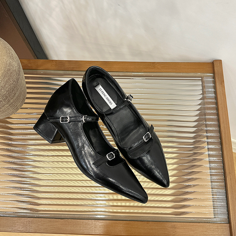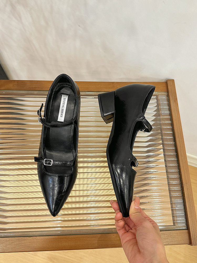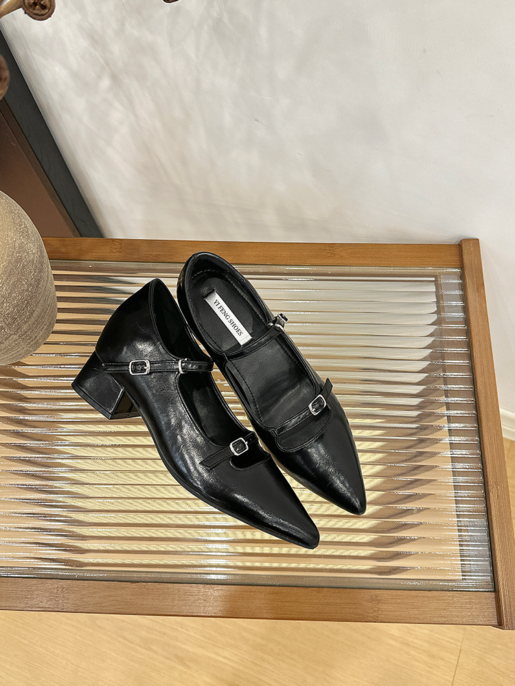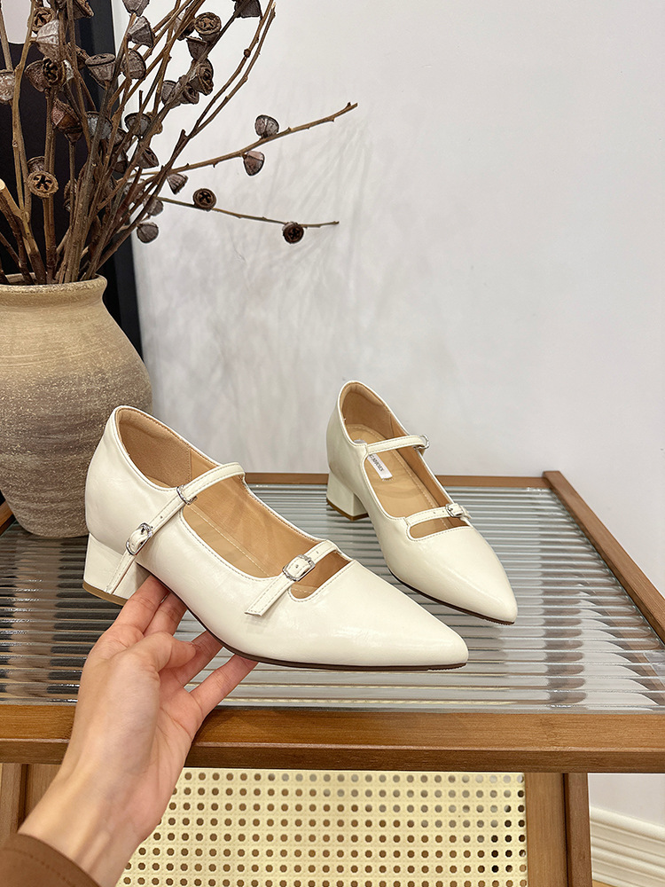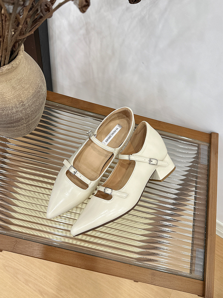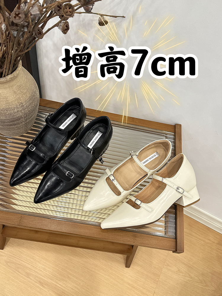 2025 봄과 가을 새로운 지적 발가락 얕은 입 두꺼운 뒤꿈치 단일 신발 여성 미색 한 단어 스트랩 메리 제인 신발 내부 높이 증가 발 뒤꿈치 신발스토어 가기