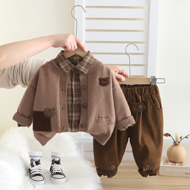 소년의 봄 세트 2025 새로운 어린이 봄과 가을 격자 무늬 셔츠 어린이 긴 소매 곰 스웨터 3 피스 세트