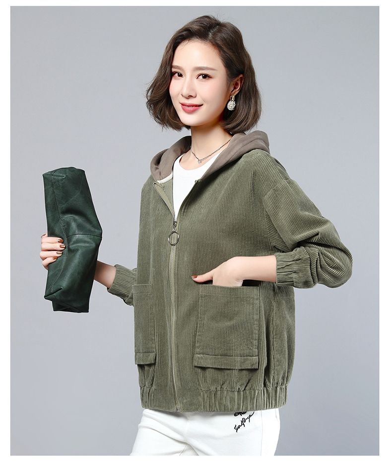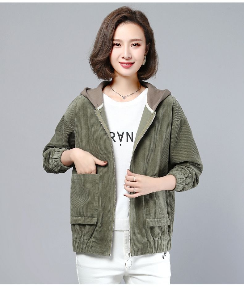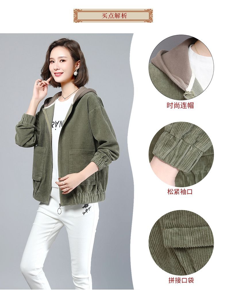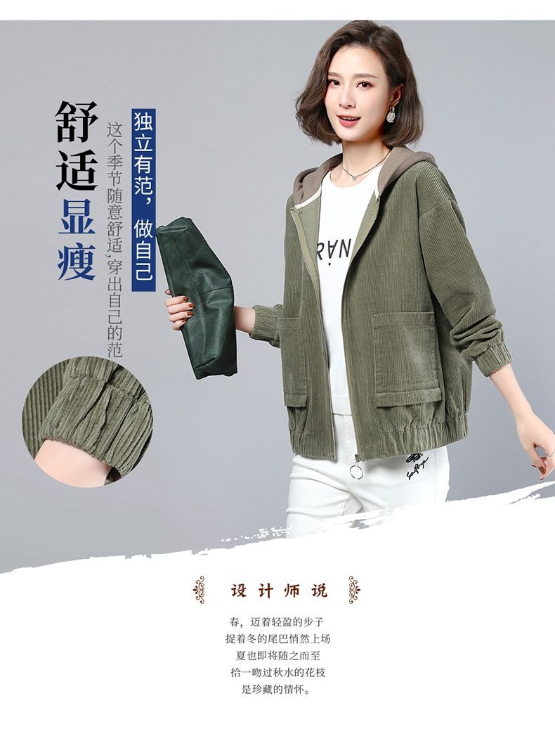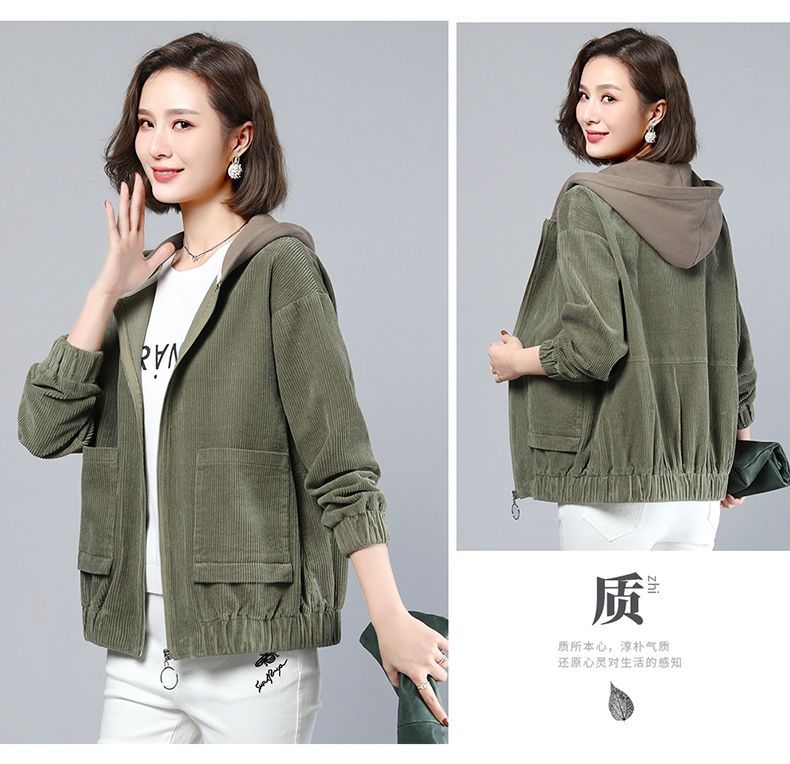 플러스 사이즈 느슨한 코듀로이 포켓 코트 여자 봄 가을과 겨울 새로운 도착 중년 어머니의 후드 올매치 얇은 재킷