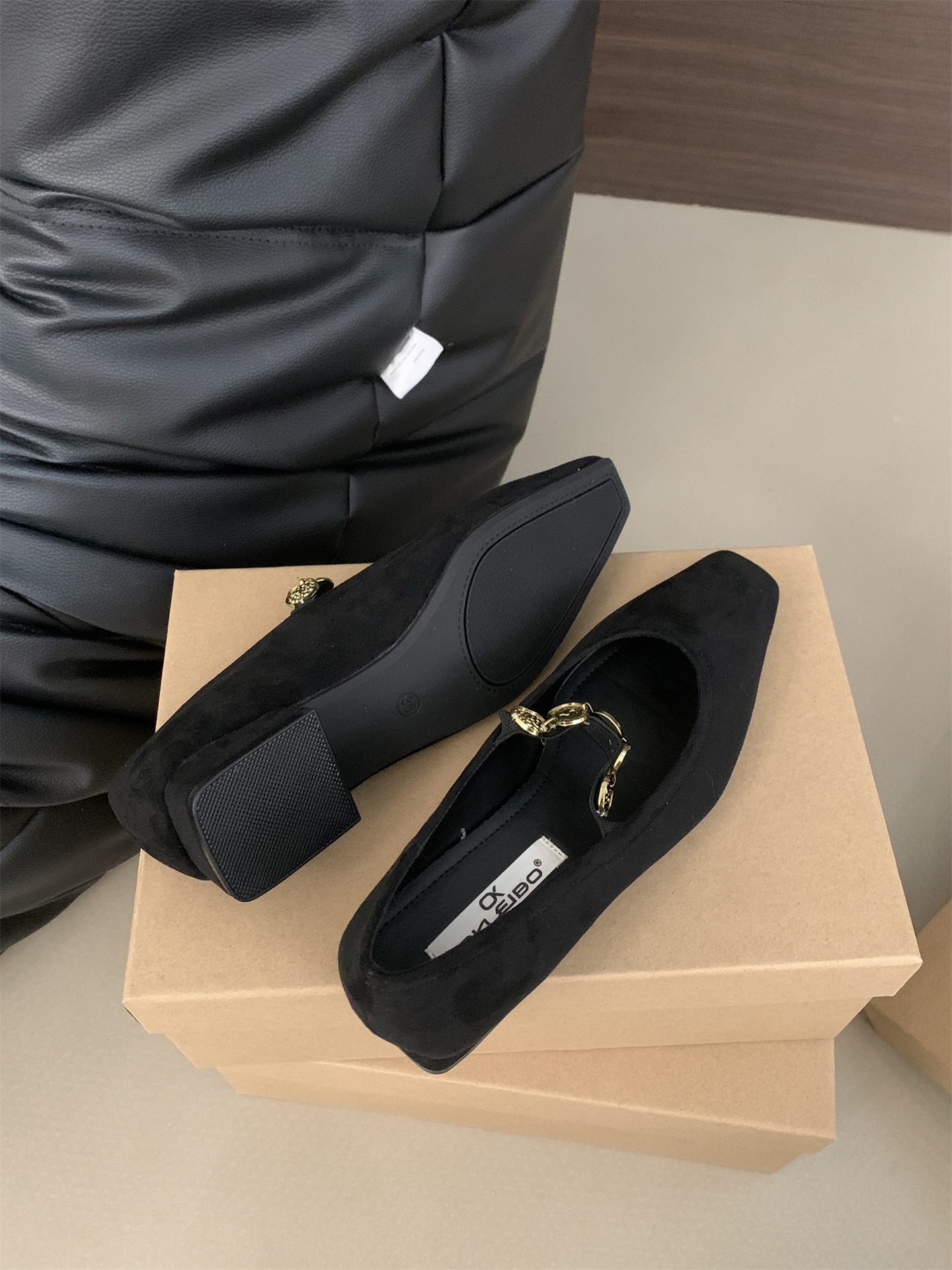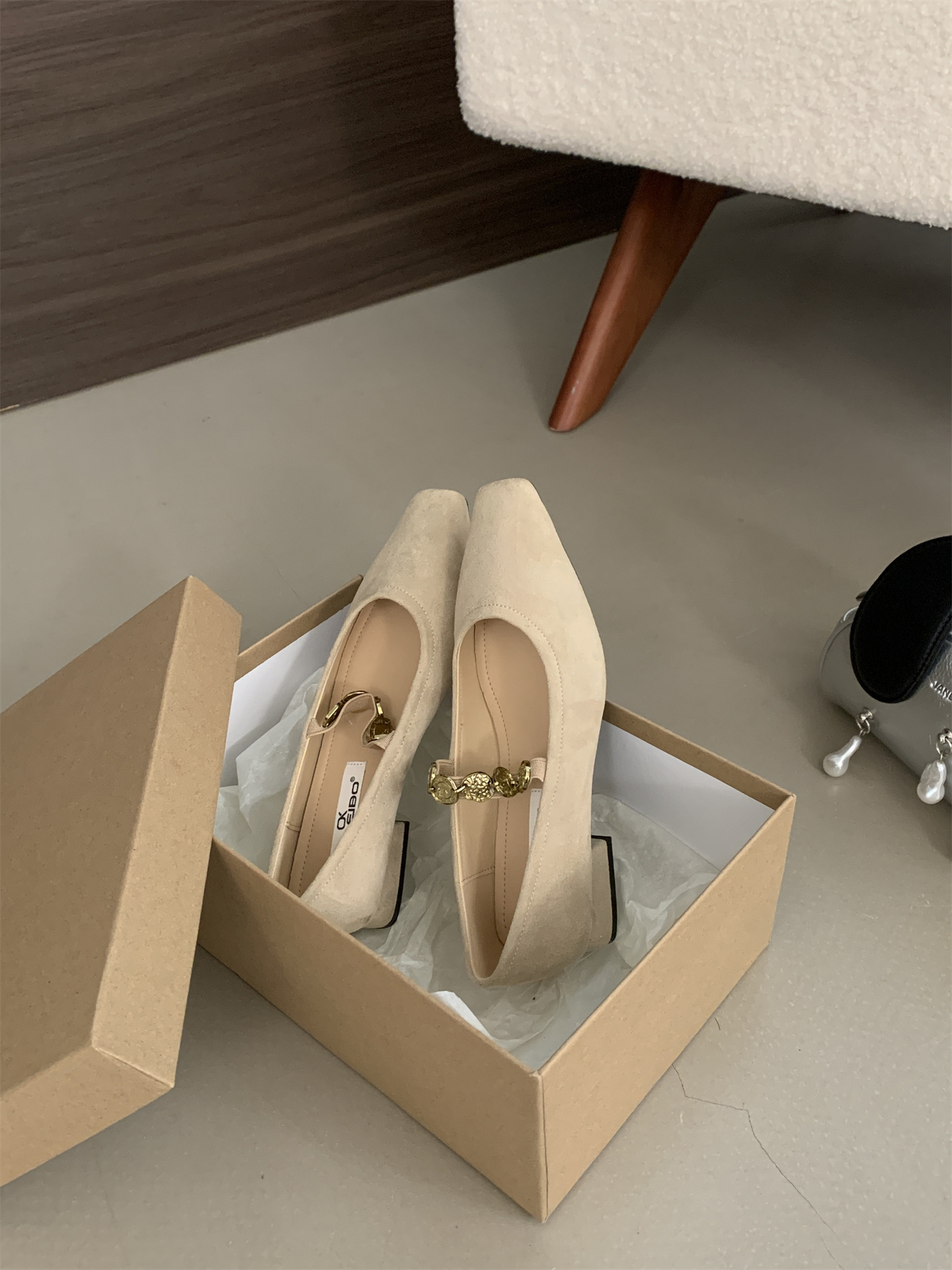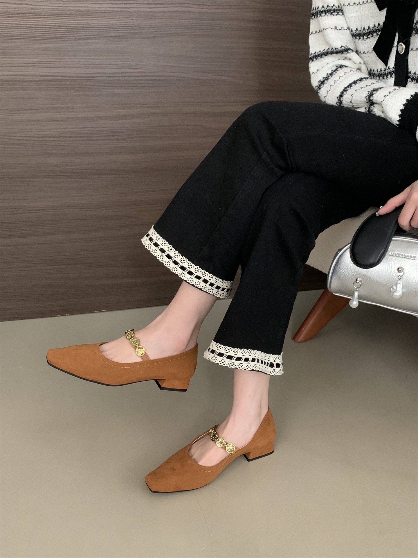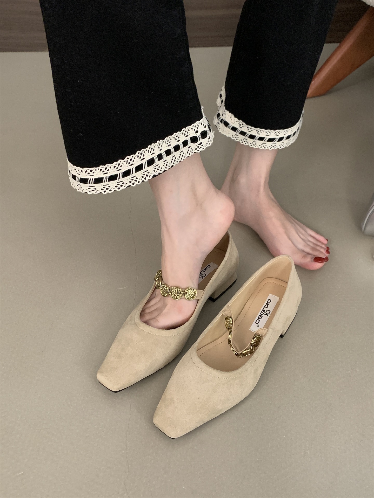 프랑스 스타일 이브닝 스타일 레트로 스퀘어 토 얕은 입 싱글 레이어 신발 여성의 봄과 가을 뉴 스웨이드 우아한 캐주얼 청키 힐 메리 제인 신발스토어 가기