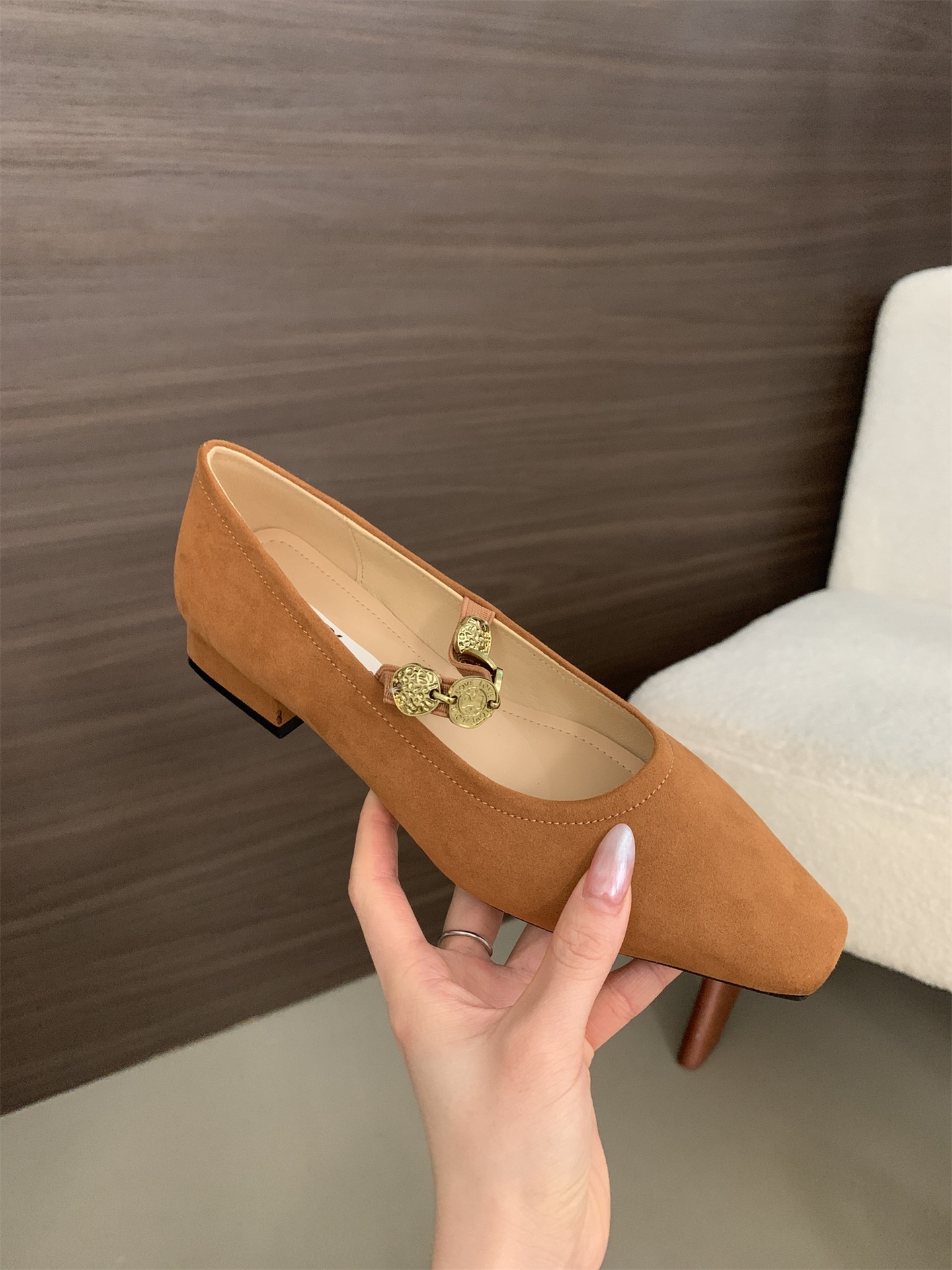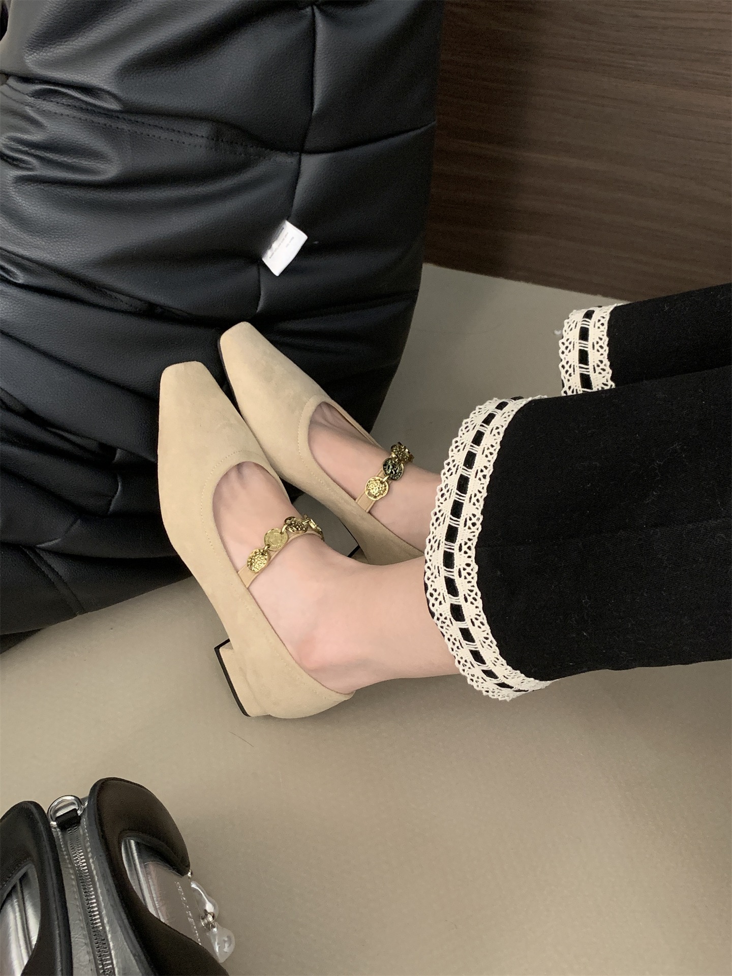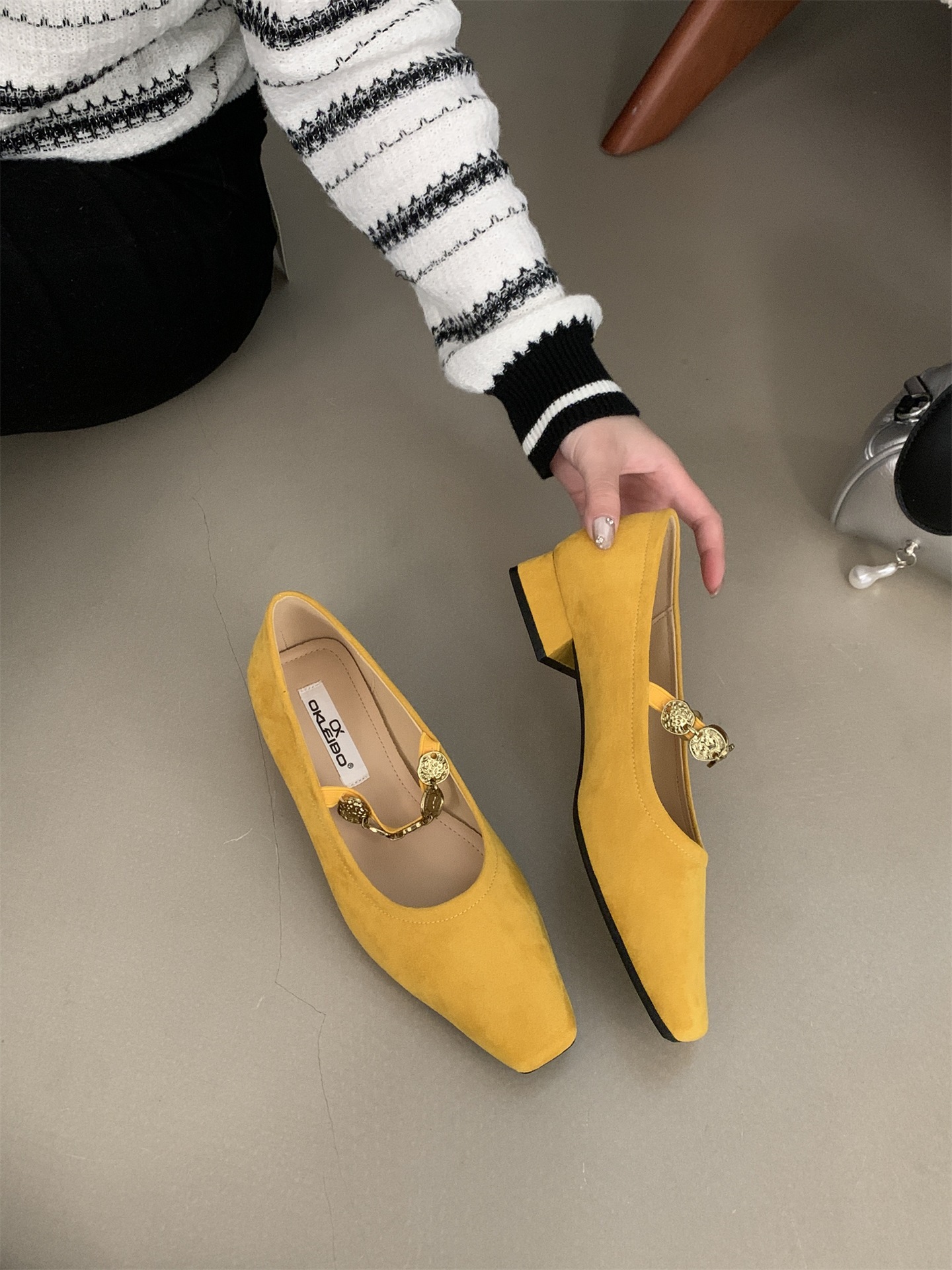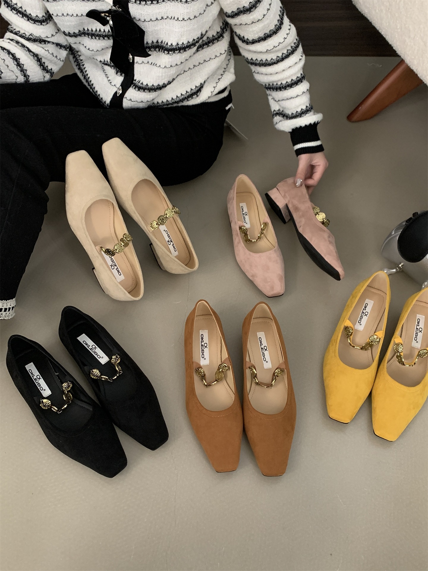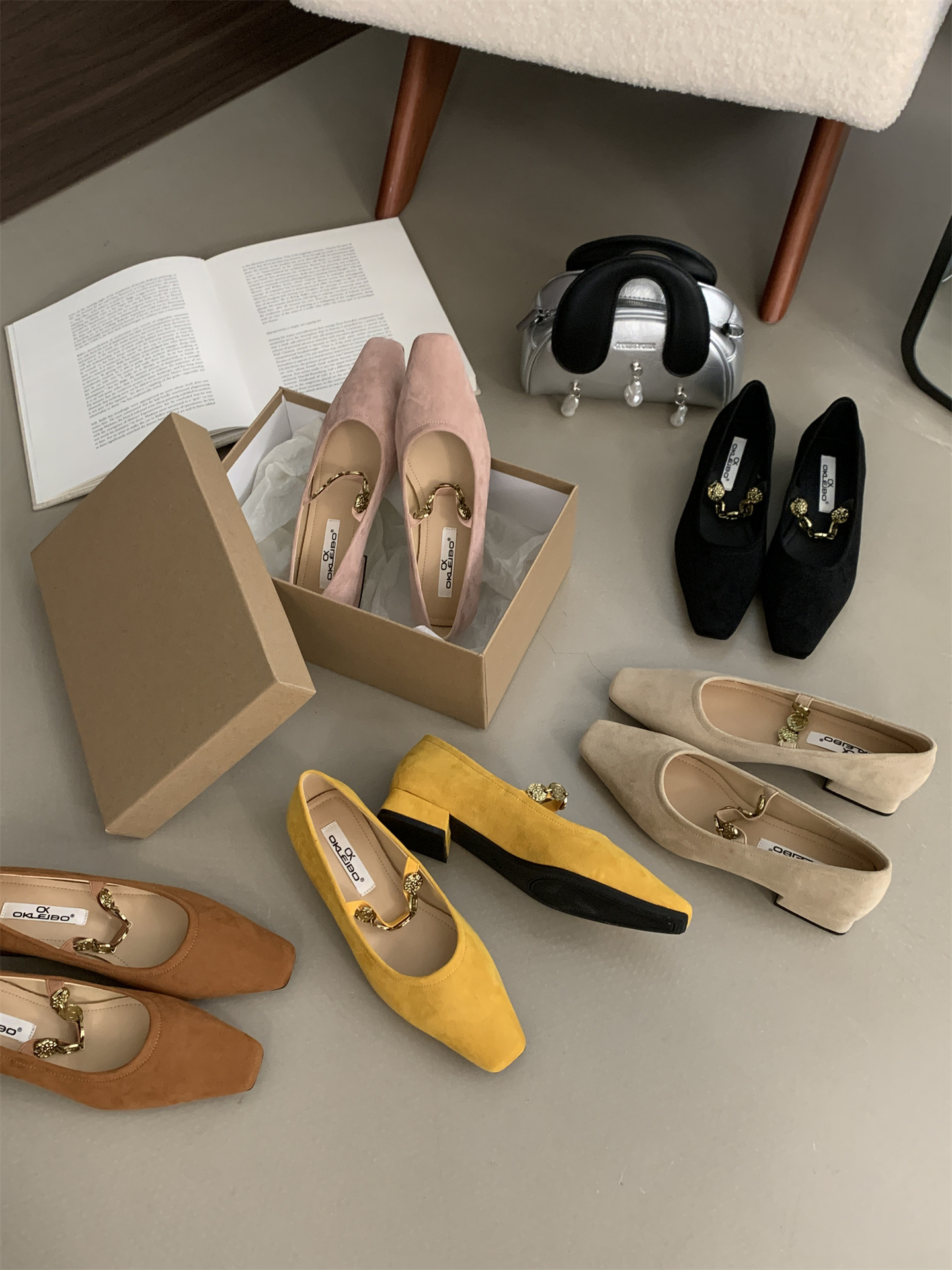프랑스 스타일 이브닝 스타일 레트로 스퀘어 토 얕은 입 싱글 레이어 신발 여성의 봄과 가을 뉴 스웨이드 우아한 캐주얼 청키 힐 메리 제인 신발