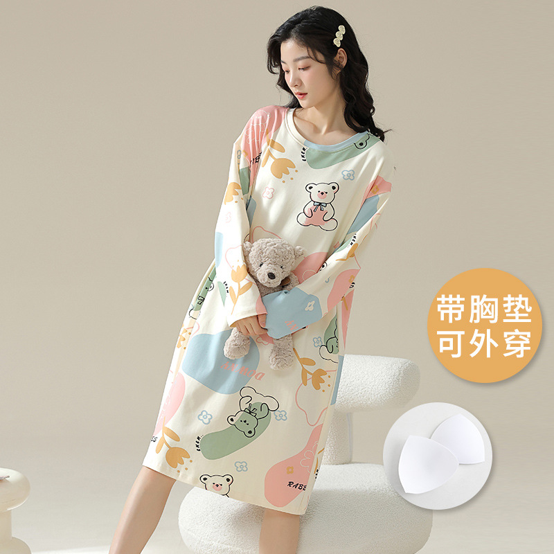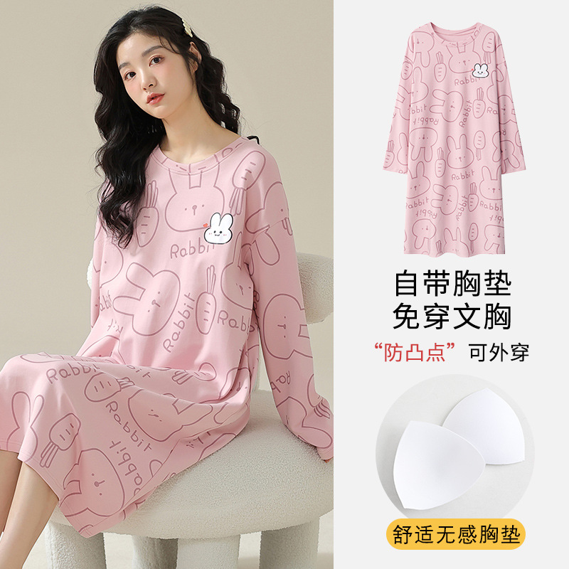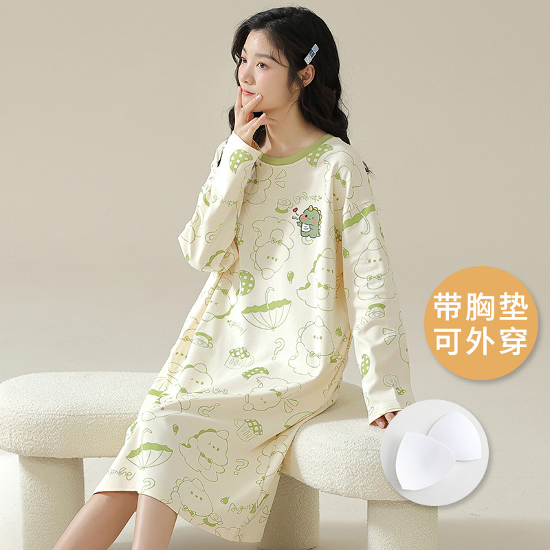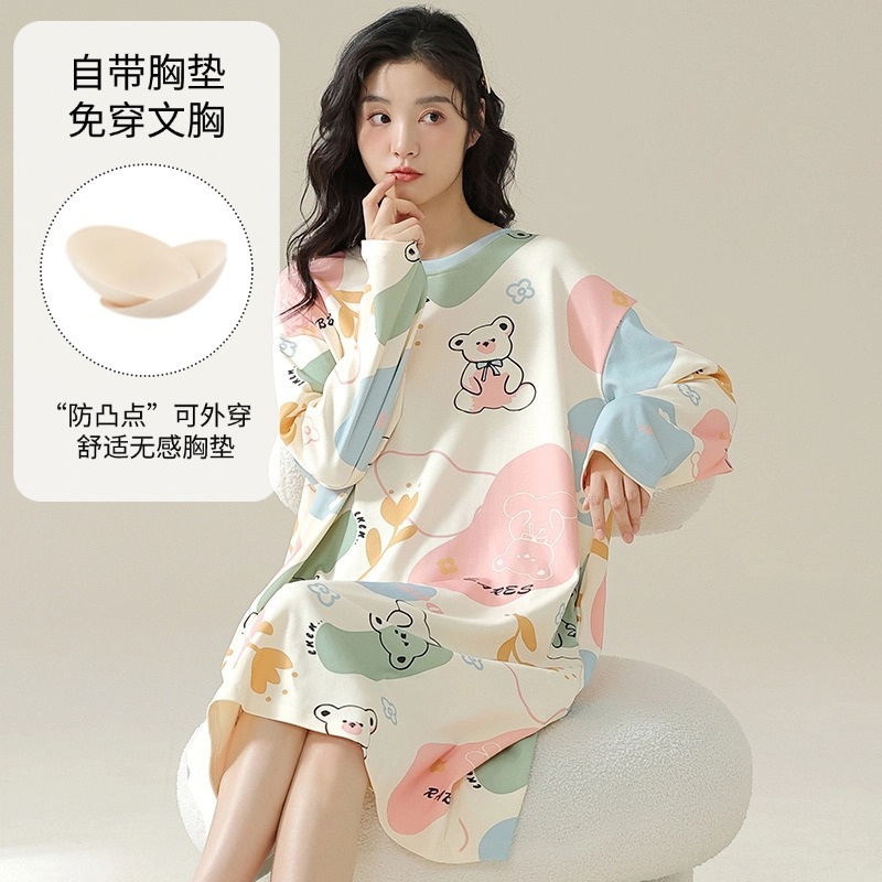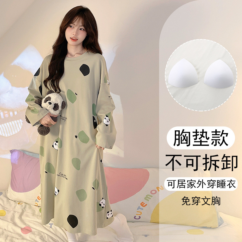 봄 · 가을 잠옷 여성용 긴 소매 가슴 패드 겉옷 긴 치마 느슨한 플러스 사이즈 파자마 한국식 가을과 겨울 집 옷