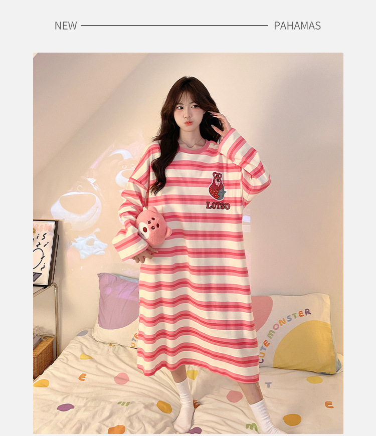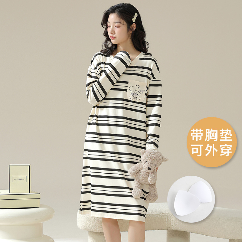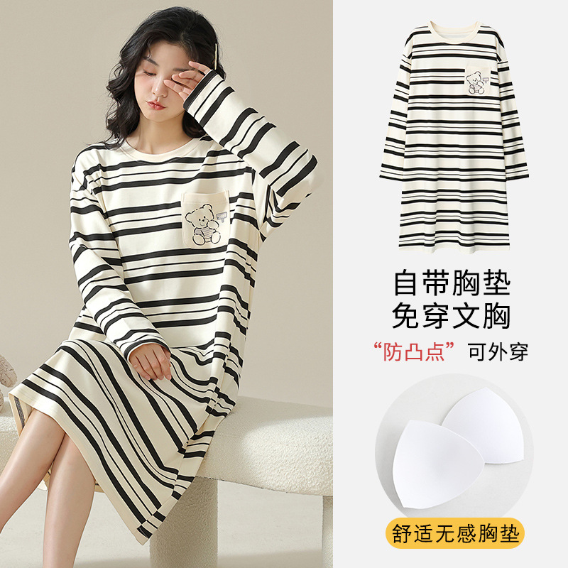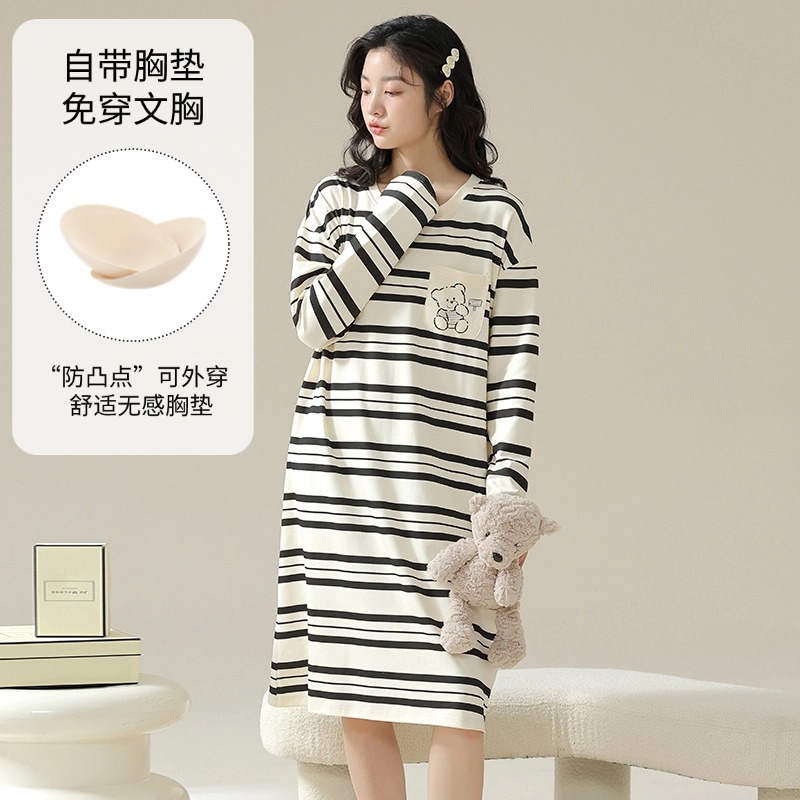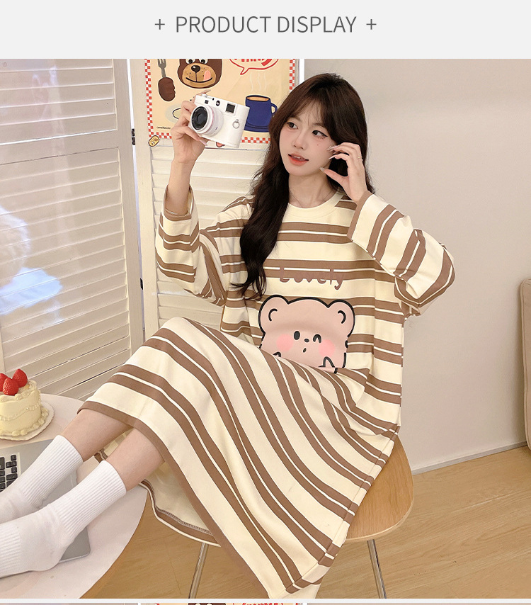 • 7708#브라운 베어 스트라이프 나이트가운 [가슴 패드 포함]